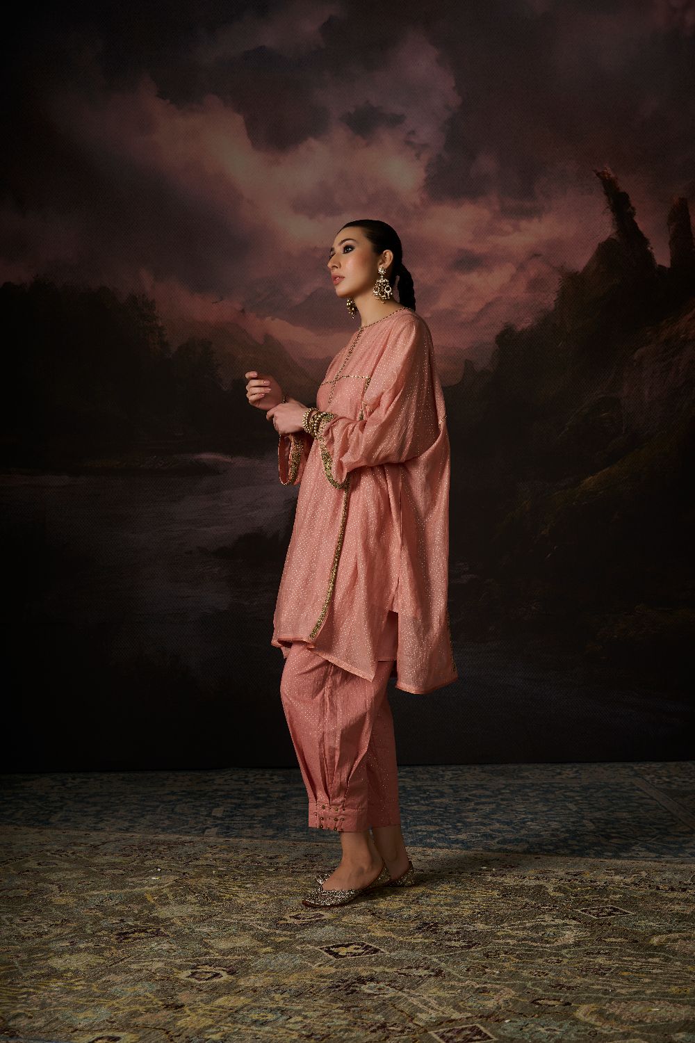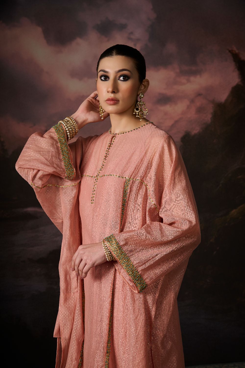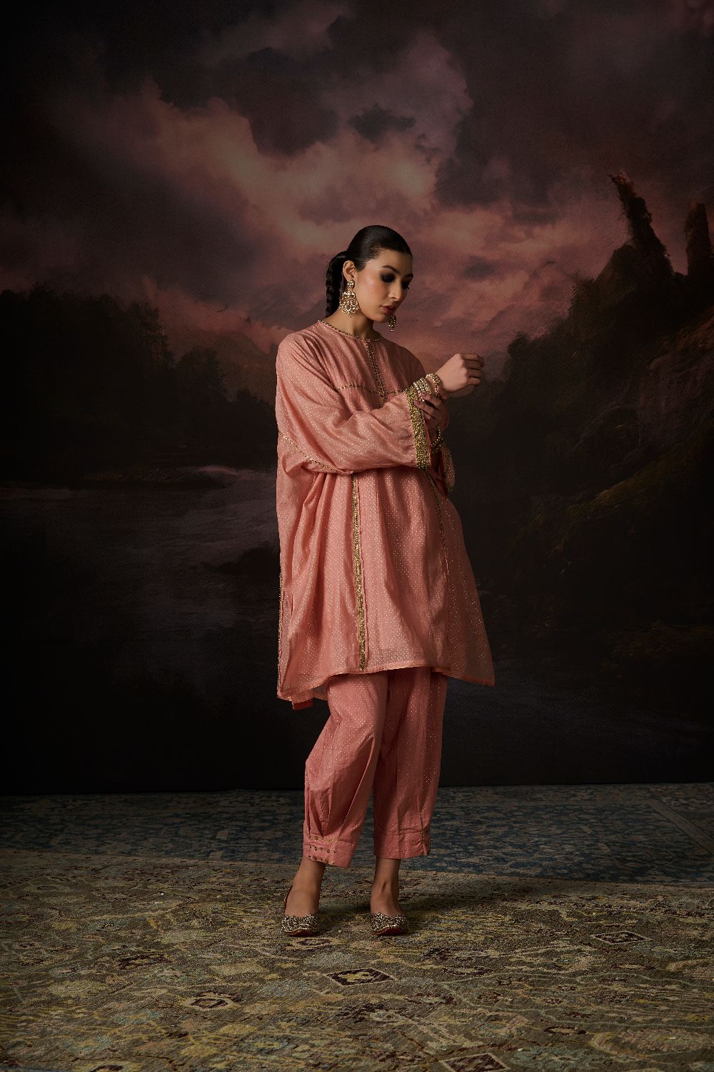 Hand-Woven 40gm Chanderi Hand Block Foil Printed Kaftan Comes With 100% Cotton Slip, With Fine Embroidery Along The Cuffs And Seams, Highlighted With Gota Detailing.
