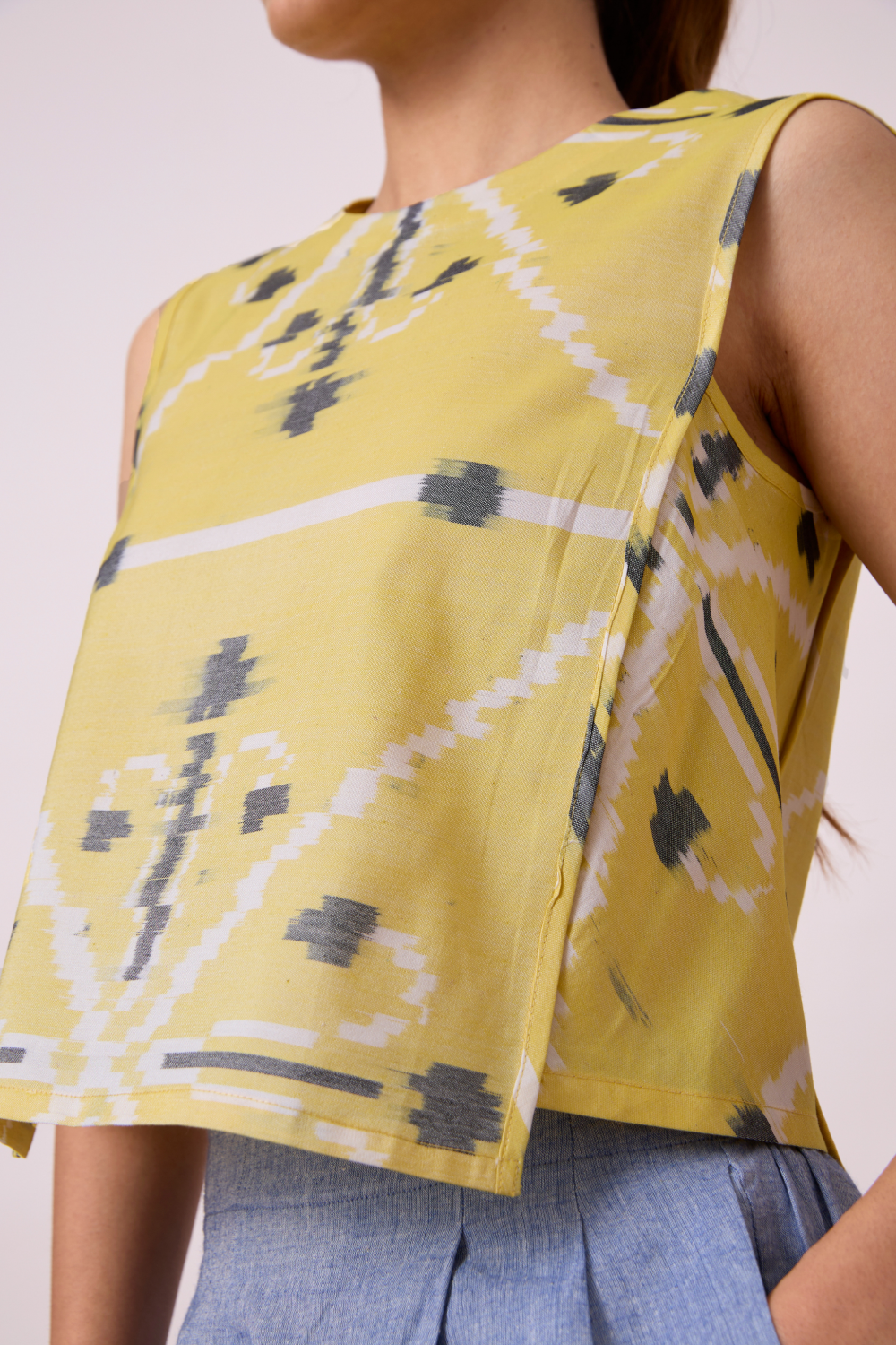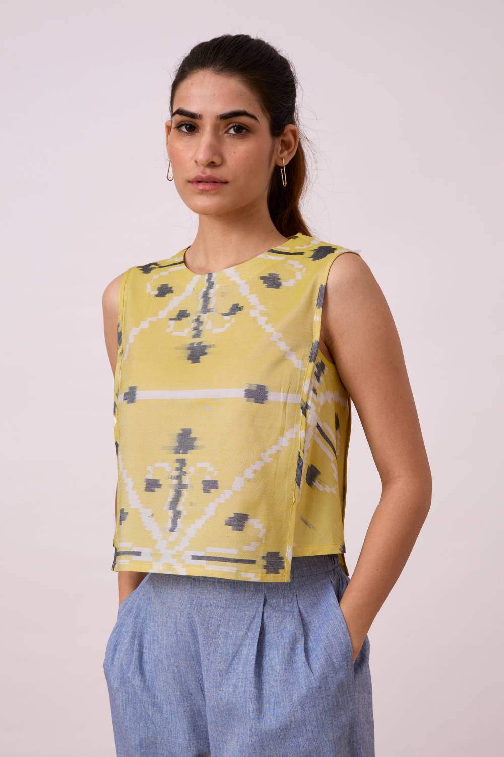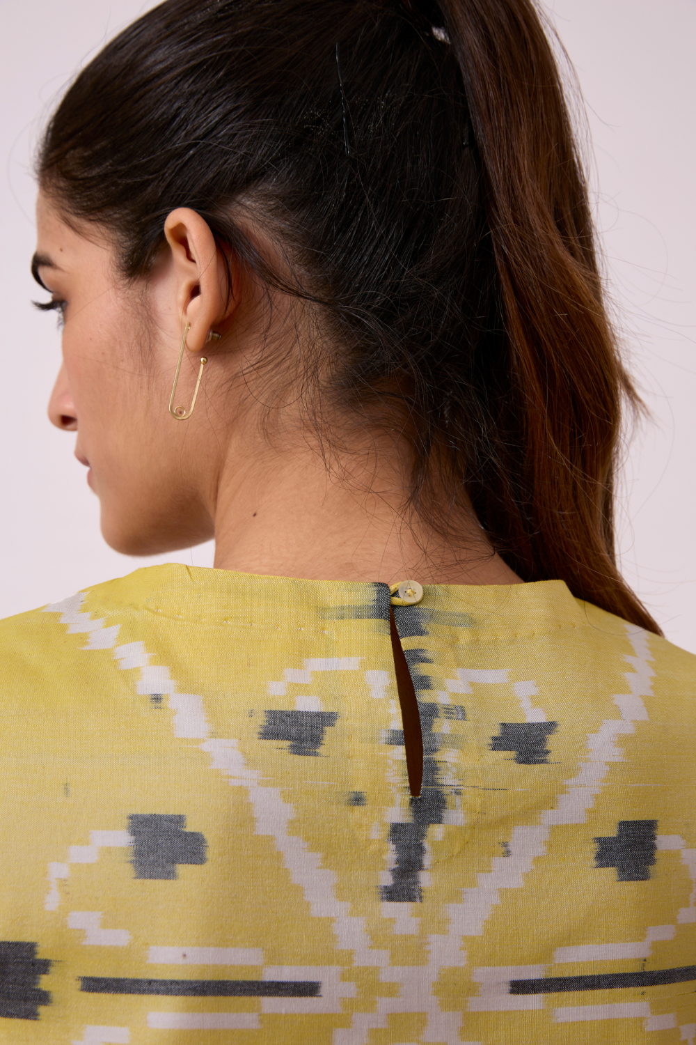 Effortless boxy top. Rouleau button fastening at the back. Shorter side panels. Slightly cropped silhouette. (Slight irregularities in print are common and speak to the hand processes involved.)
