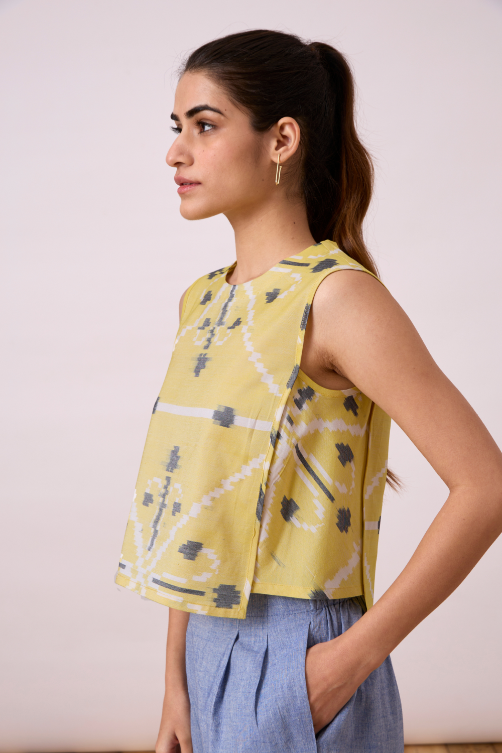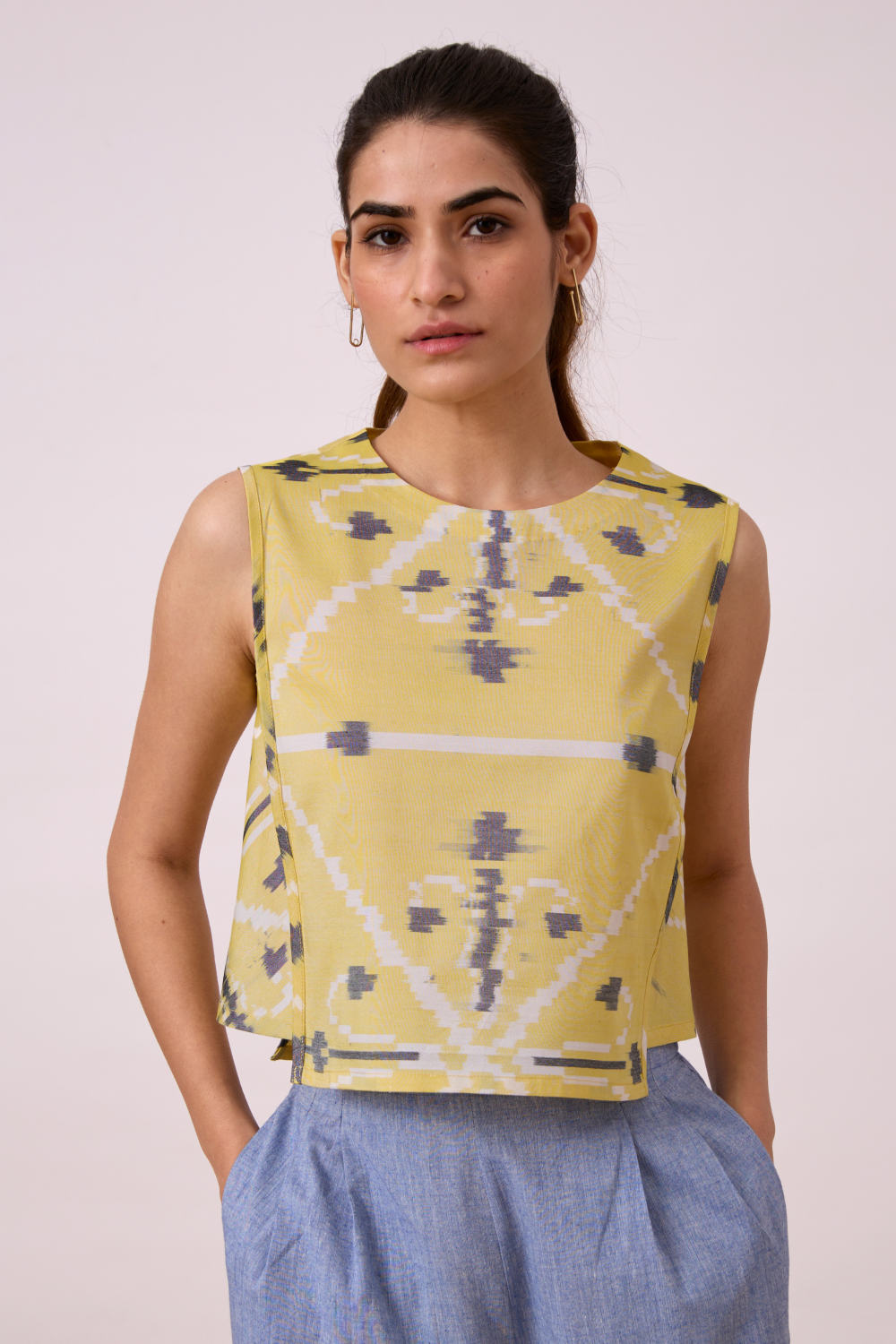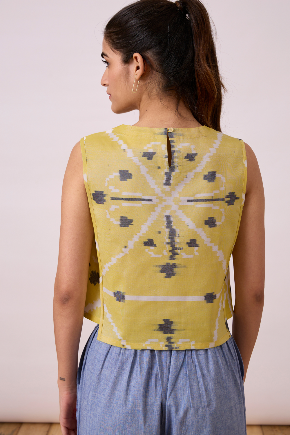 Effortless boxy top. Rouleau button fastening at the back. Shorter side panels. Slightly cropped silhouette. (Slight irregularities in print are common and speak to the hand processes involved.)