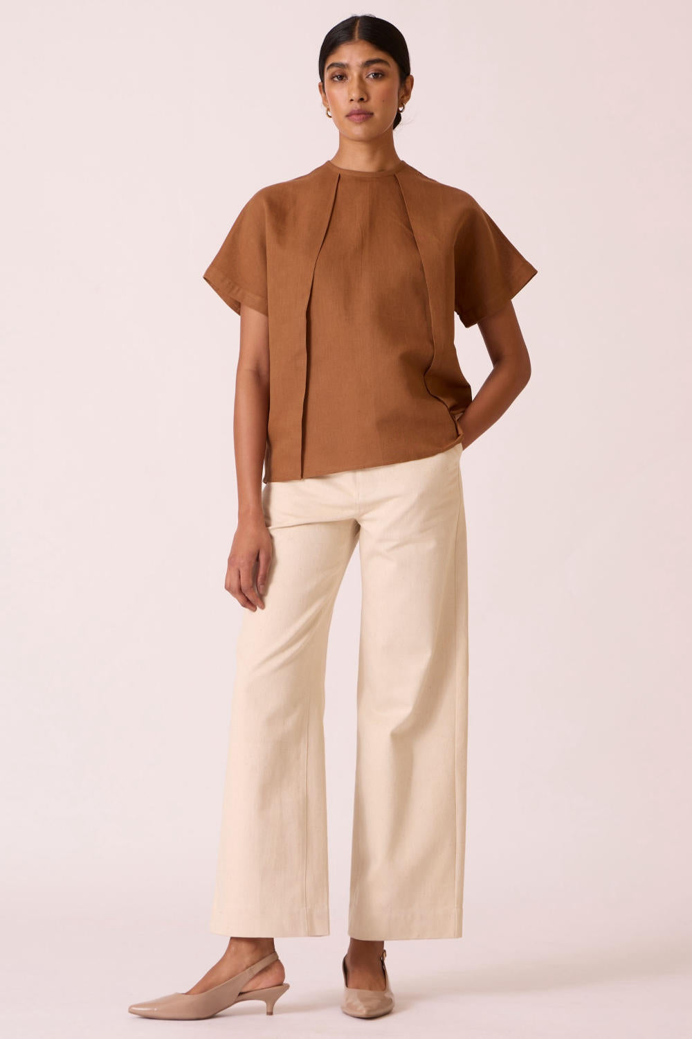 A straight leg mid rise pants with front fly button fastening and cross pockets.