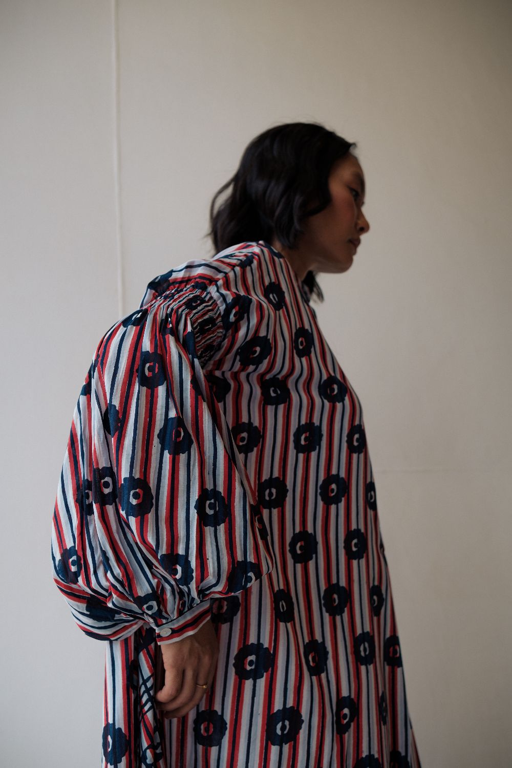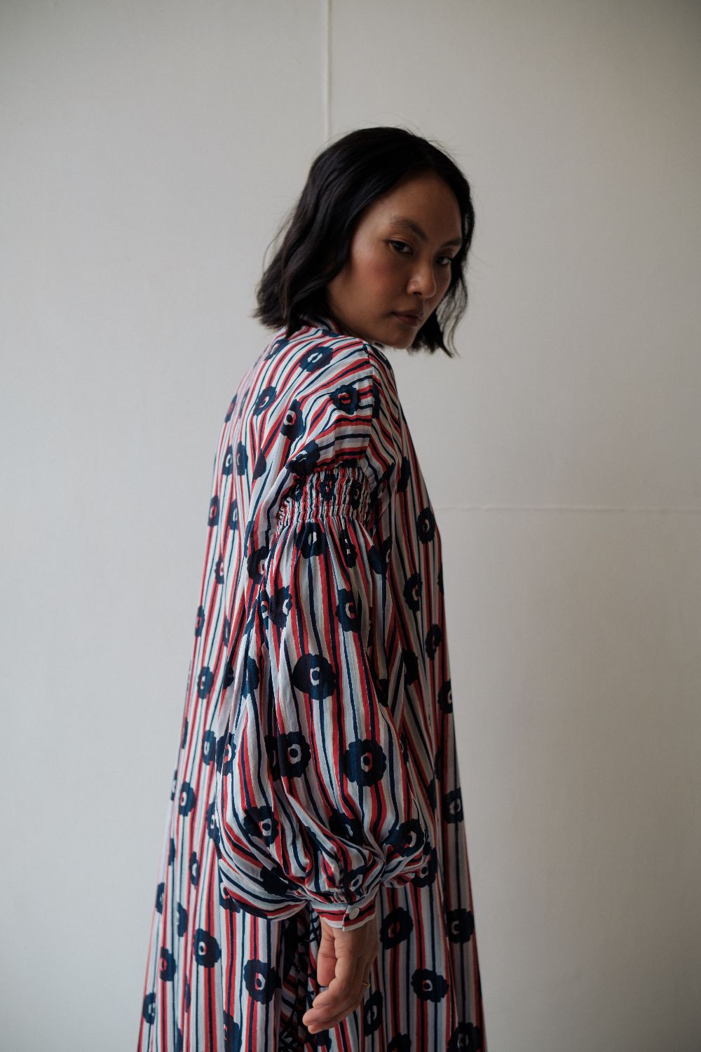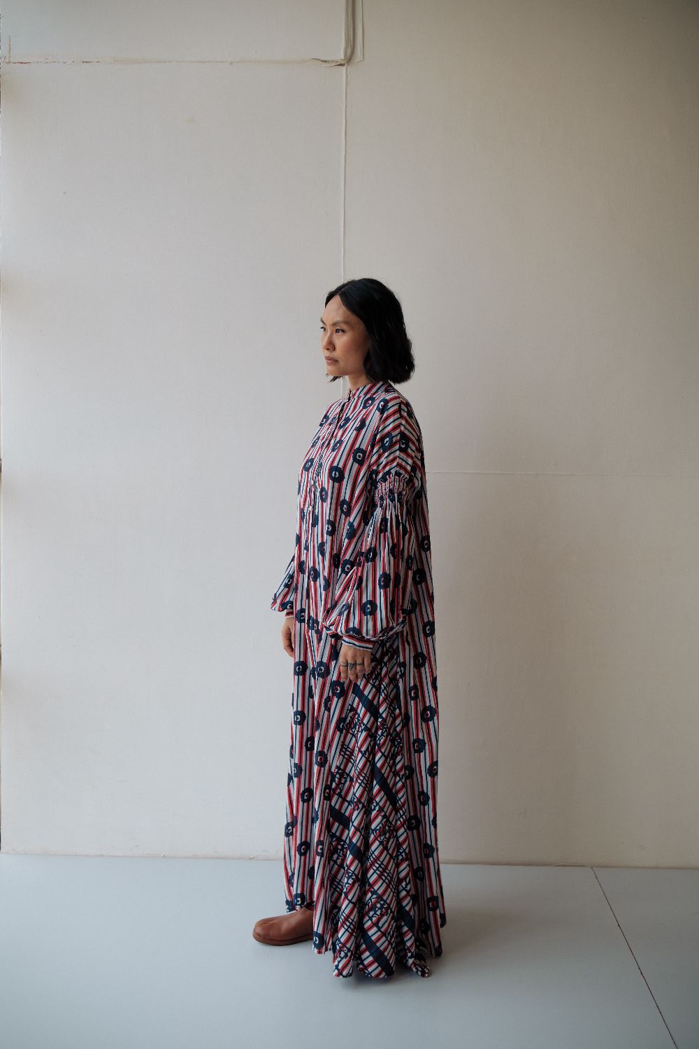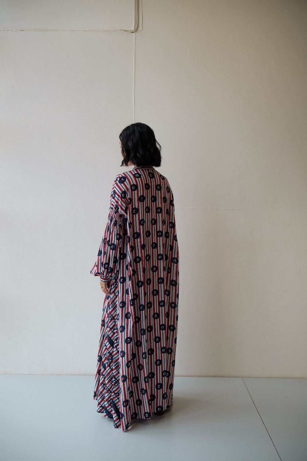 Floor length hand block printed dress ,with multiple printed and smocking details on sleeves . dress is made in cotton.