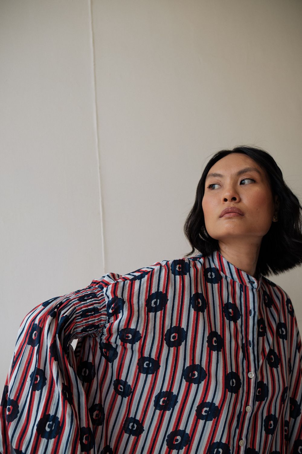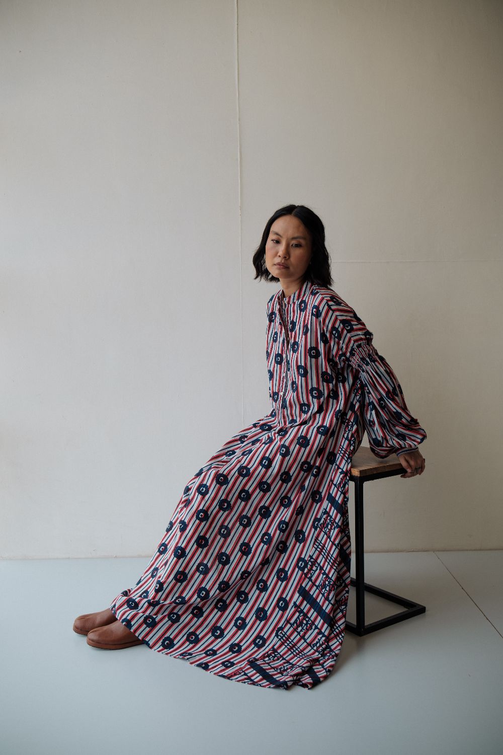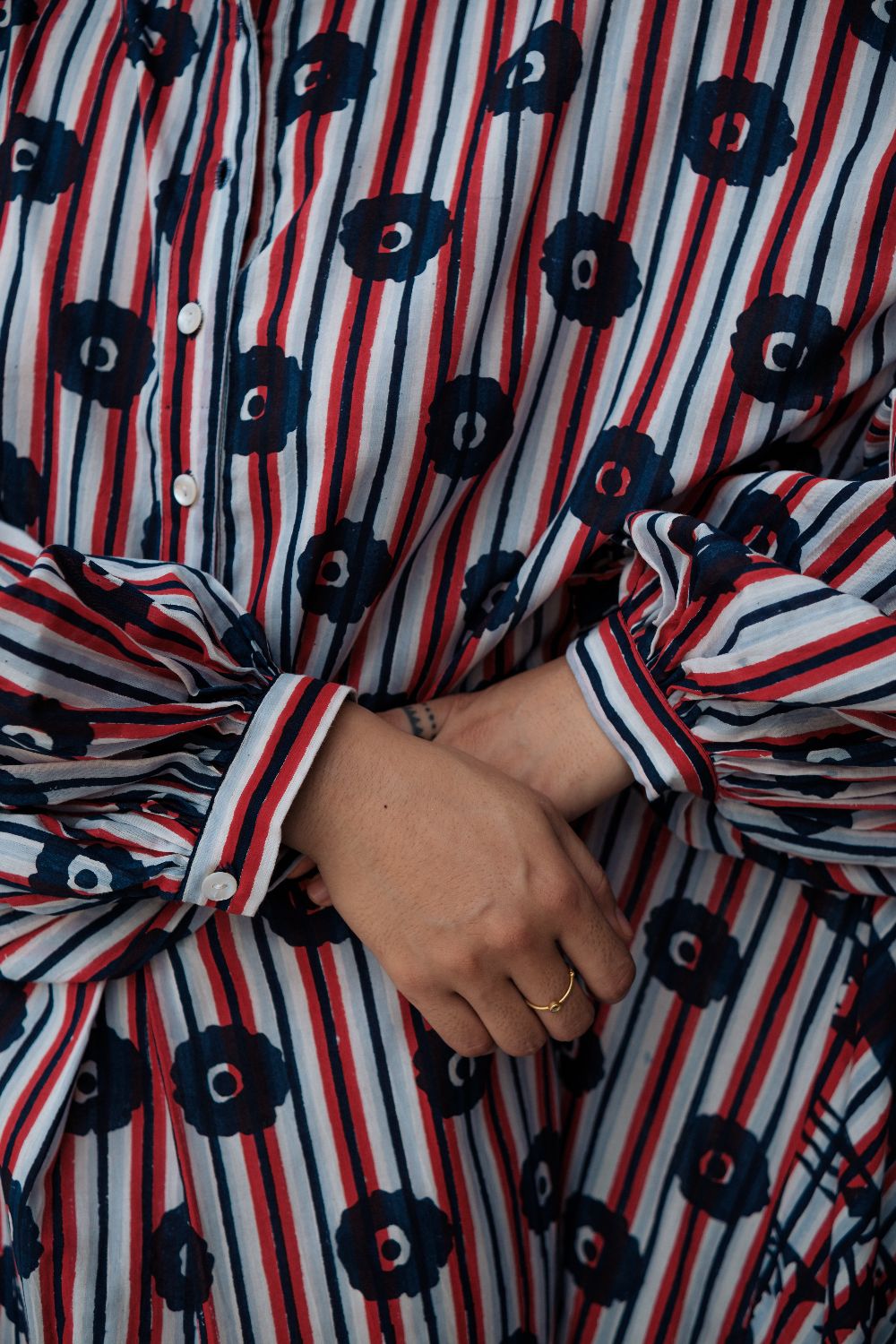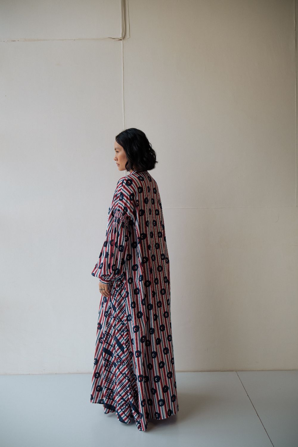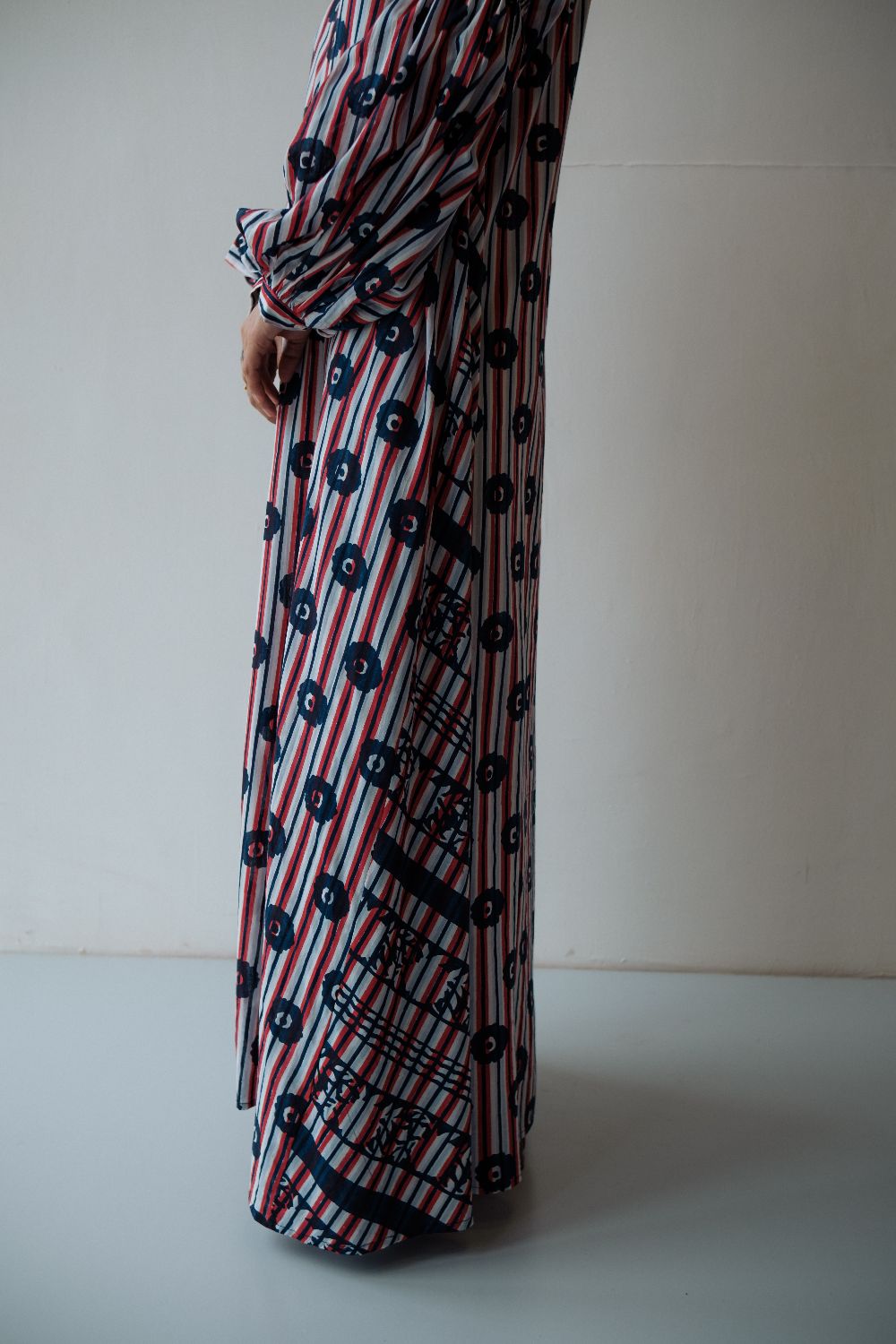Floor length hand block printed dress ,with multiple printed and smocking details on sleeves . dress is made in cotton.