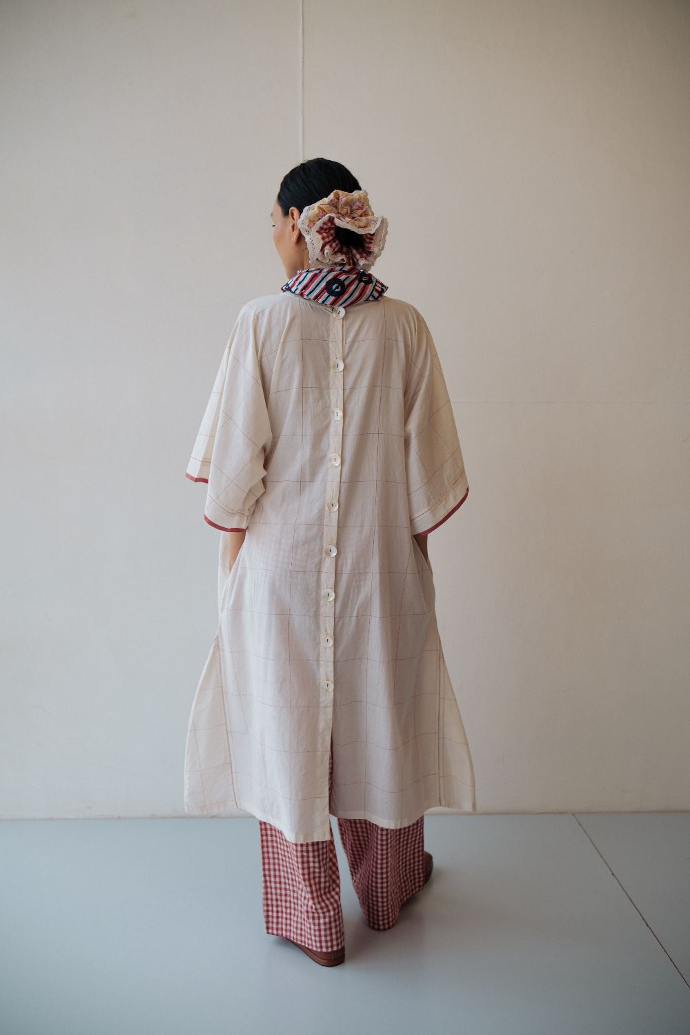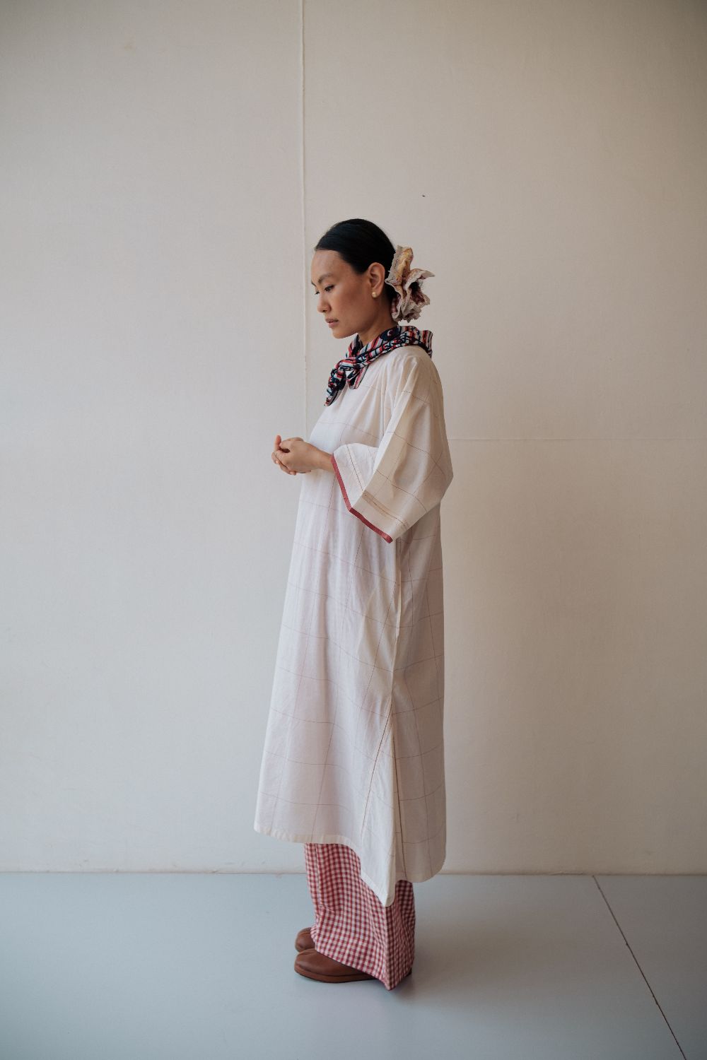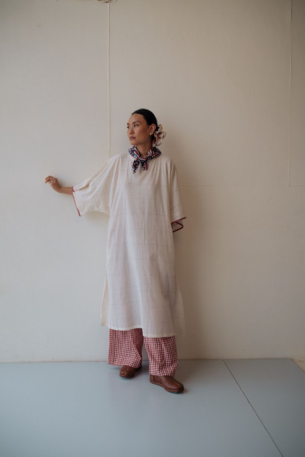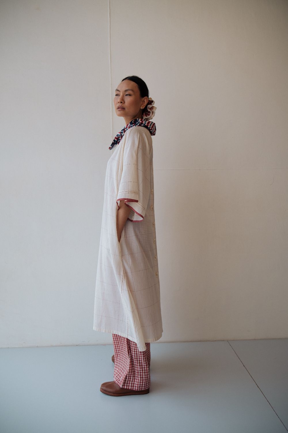 Kala cotton dress in an anti-fit style, with ladder stitch detailing, paired here with kala cotton checked pants. Both fabrics are hand-spun & handwoven. The outfit has been styled with a hand-block printed bandana from this collection