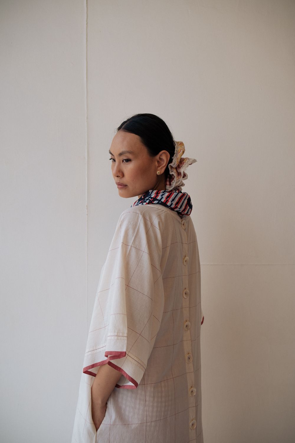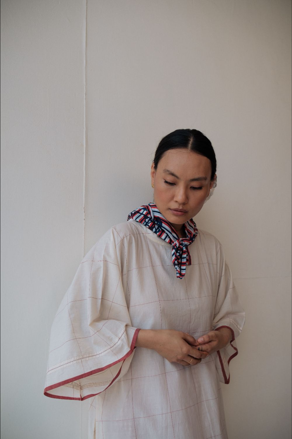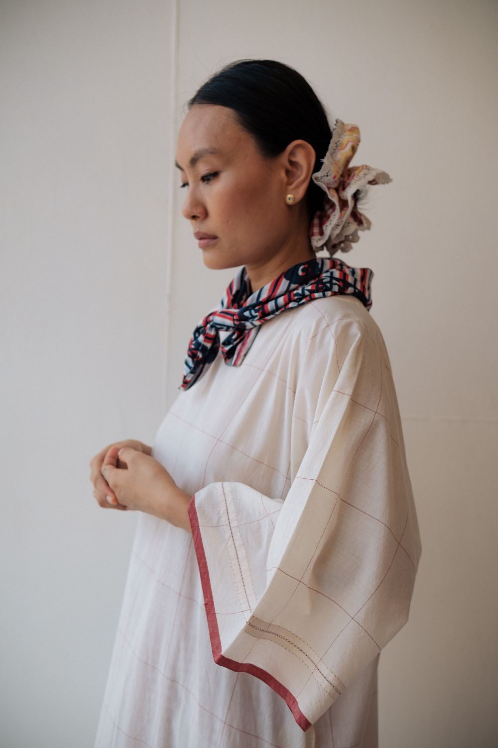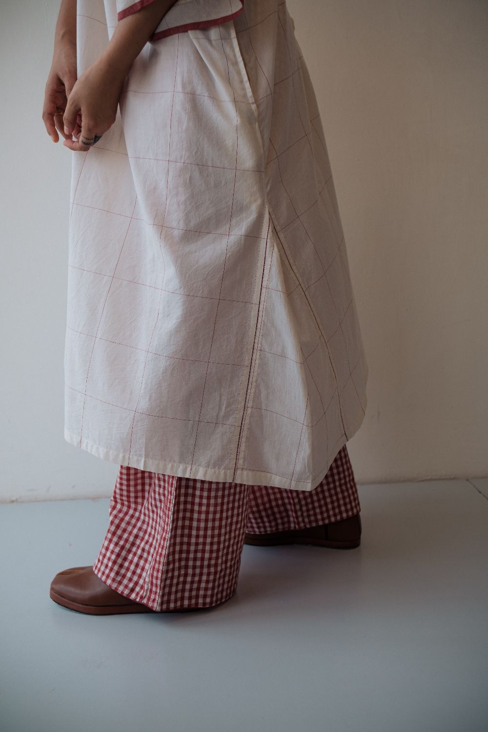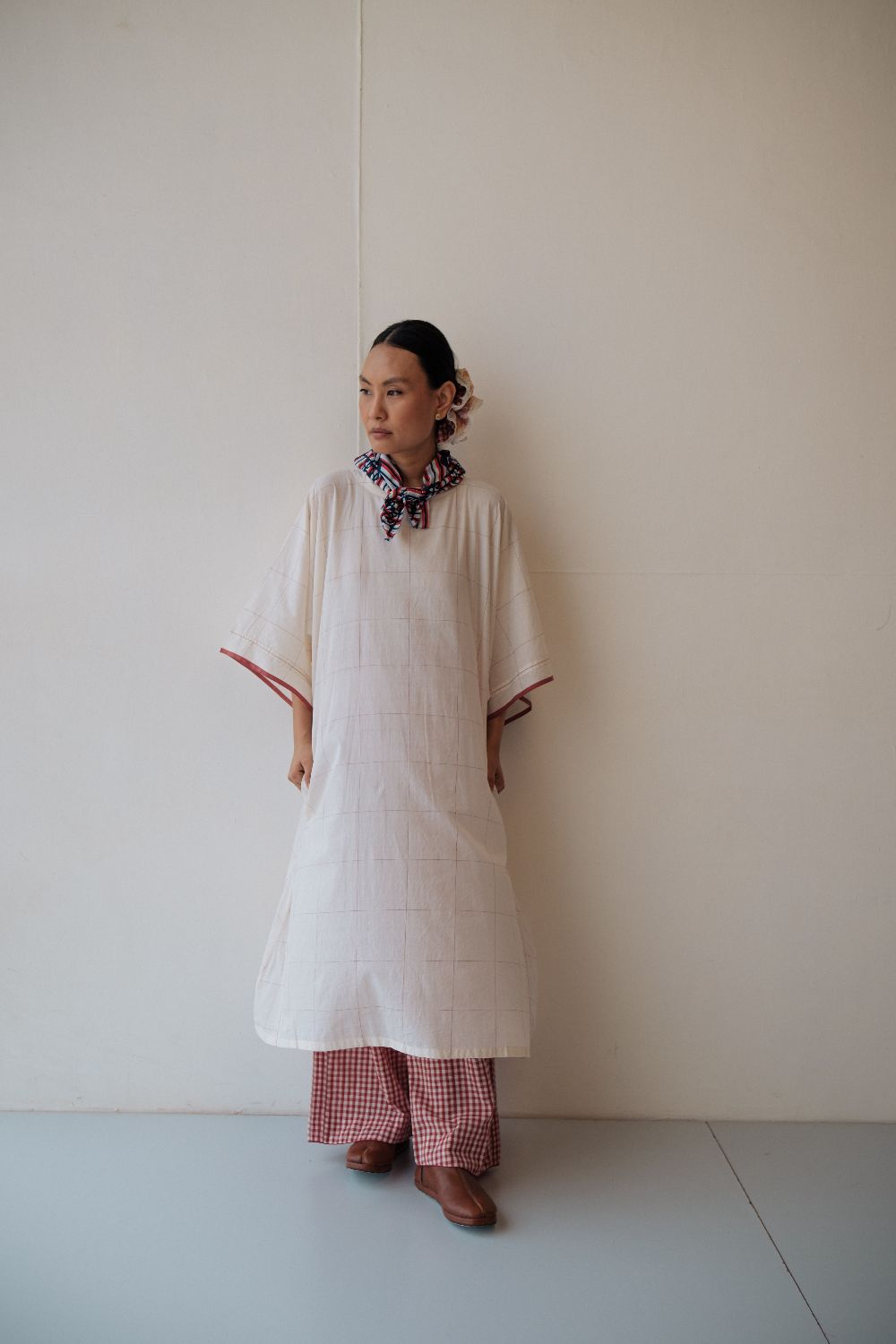 Kala cotton dress in an anti-fit style, with ladder stitch detailing, paired here with kala cotton checked pants. Both fabrics are hand-spun & handwoven. The outfit has been styled with a hand-block printed bandana from this collection
