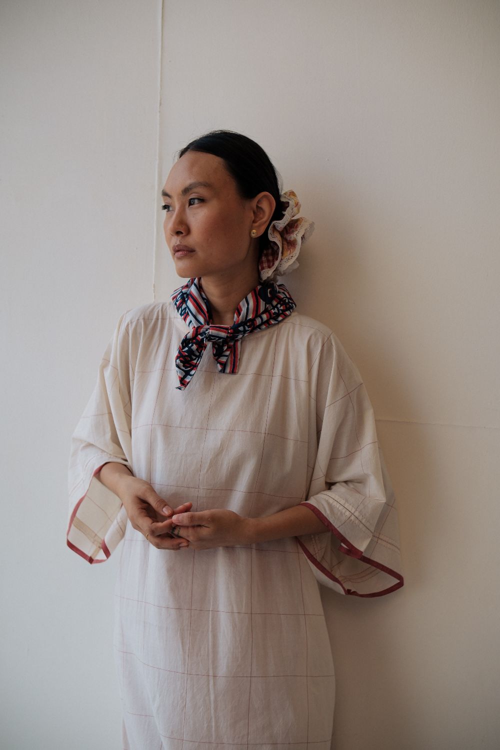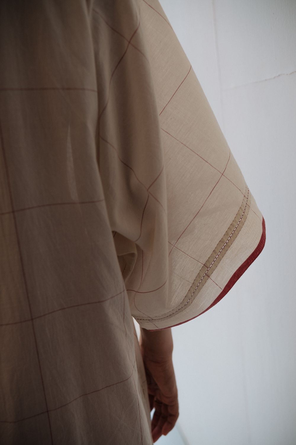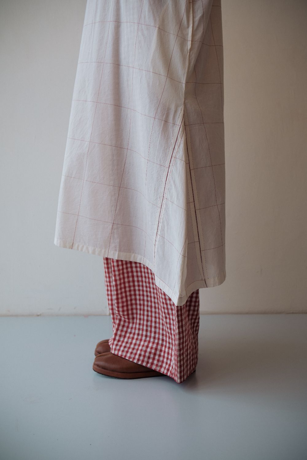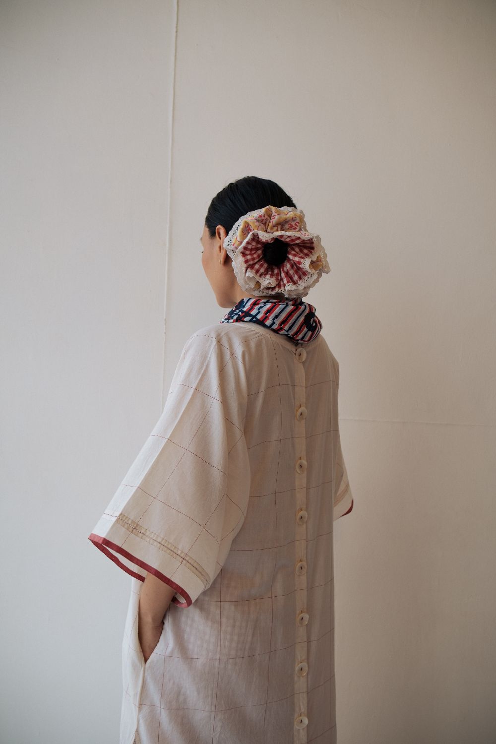Kala cotton dress in an anti-fit style, with ladder stitch detailing, paired here with kala cotton checked pants. Both fabrics are hand-spun & handwoven. The outfit has been styled with a hand-block printed bandana from this collection