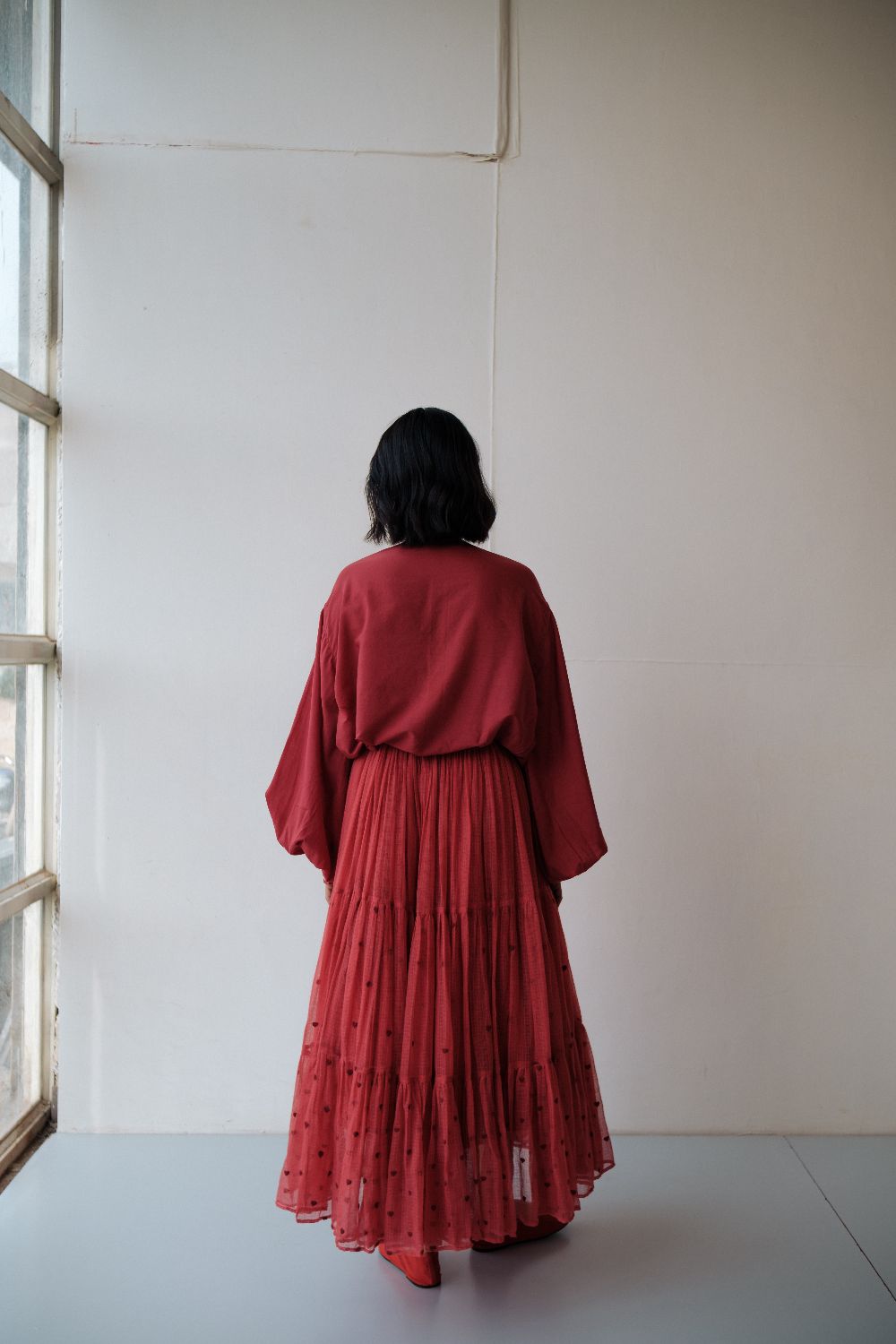 A skirt in handwoven kota doria fabric . The skirt has been hand embroidered by our in house artisans .with a cotton lining .