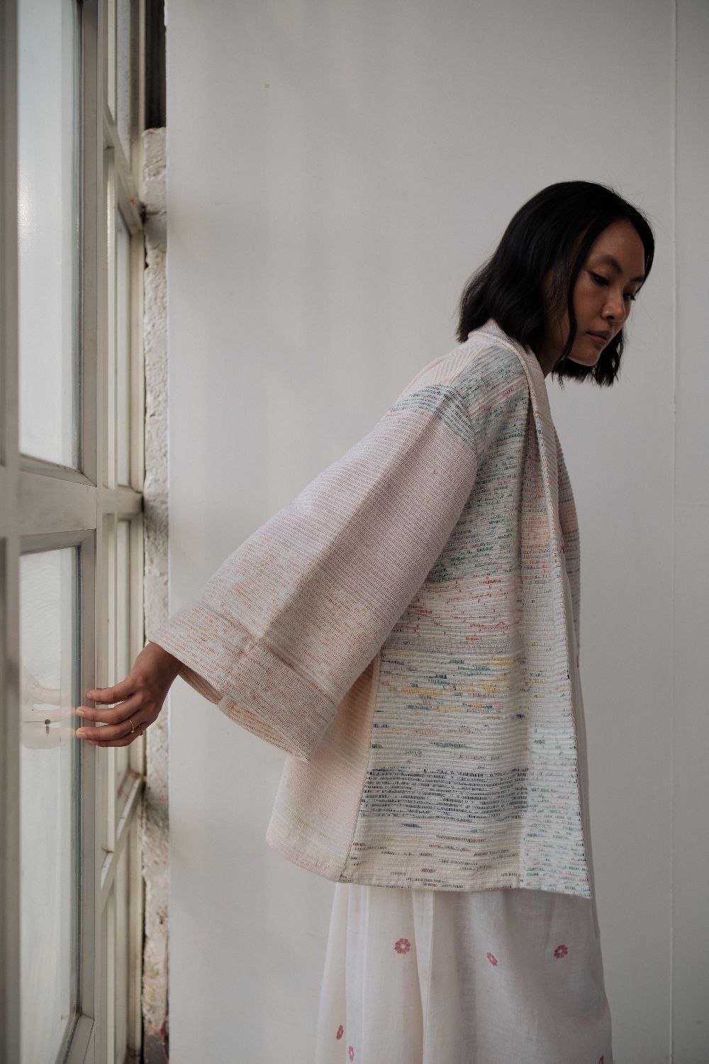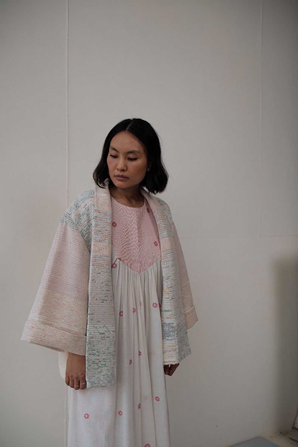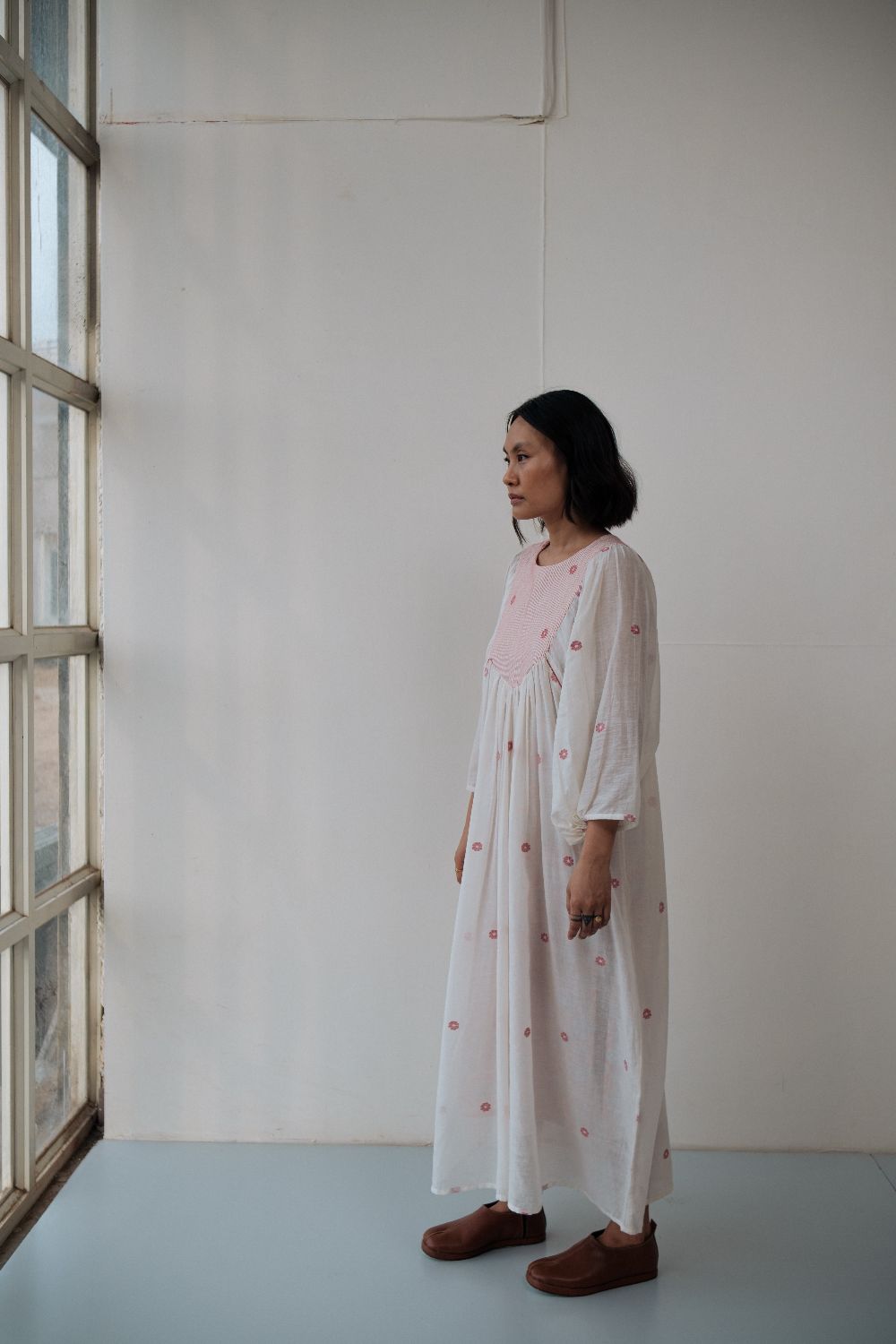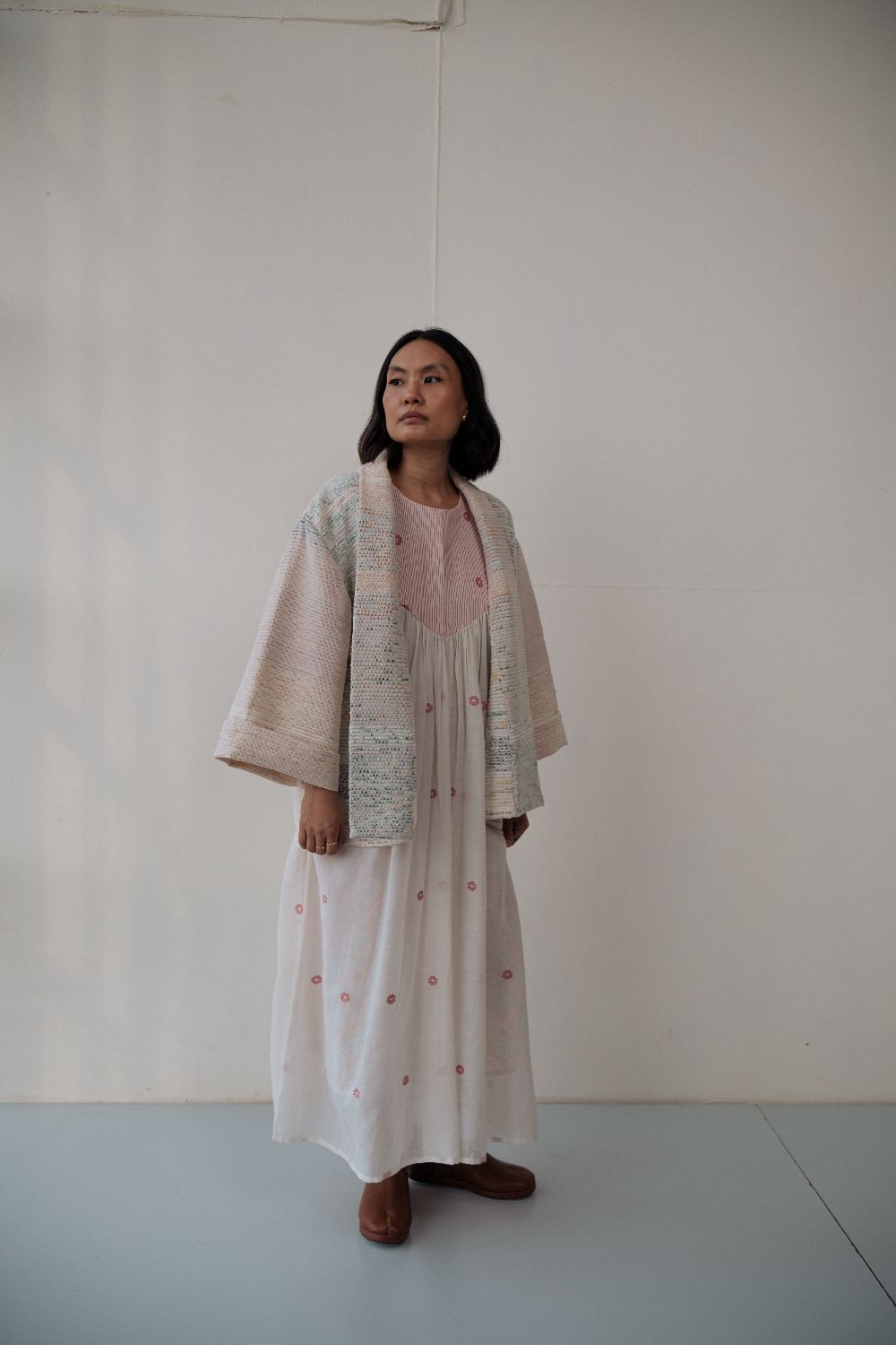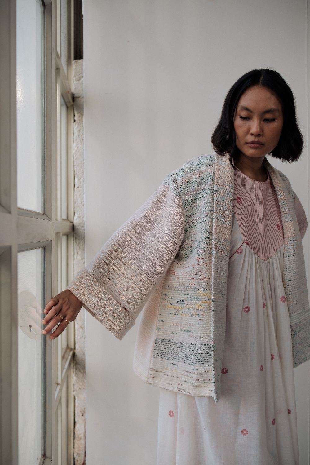 It is paired here with a jamdani dress with stitch detailing and ladder