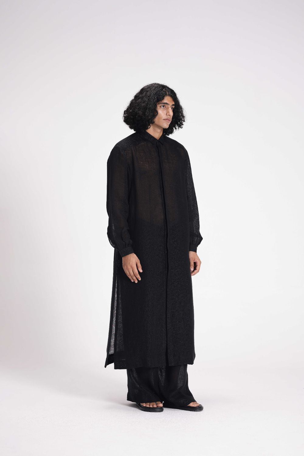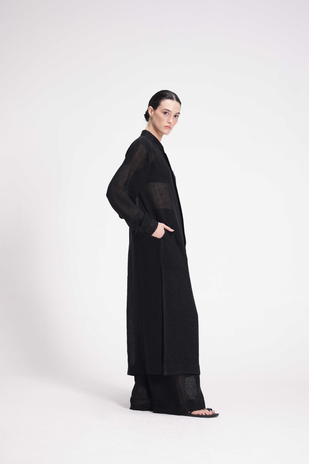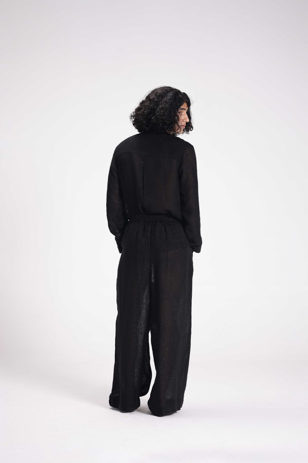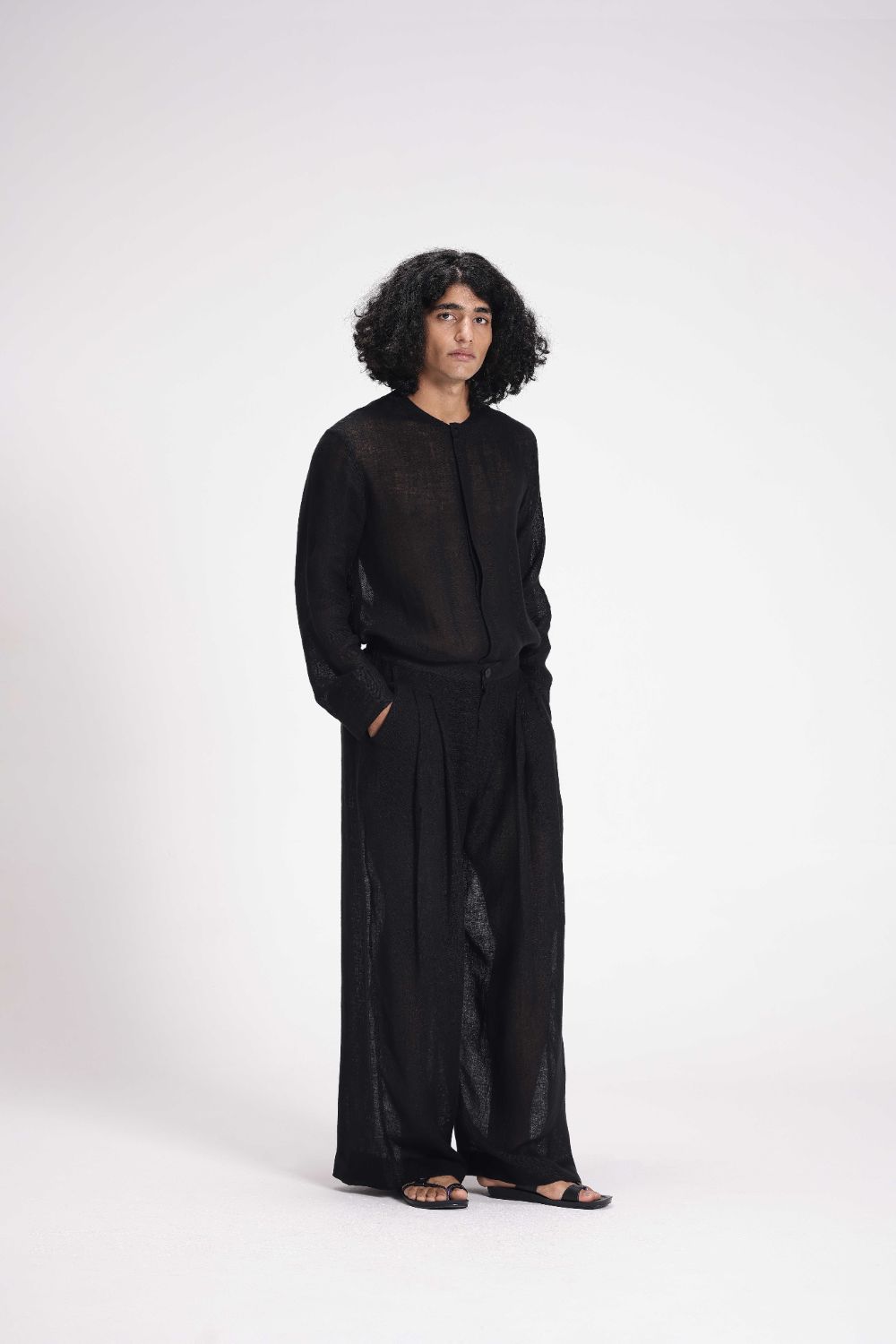 Crafted from linen gauze, this co-ord set is ideal for a relaxed look. The relaxed-fit upper features a classic collar neckline and a concealed placket for a sleek finish. Full sleeves with cuffs and a double-layer yoke add distinctive details to this calf-length silhouette, merging comfort with sophistication. These straight-cut pants come with button and fly zip closure in the front, along with back elastic for comfort. It features elegant box pleat detailing and side pockets for added utility.