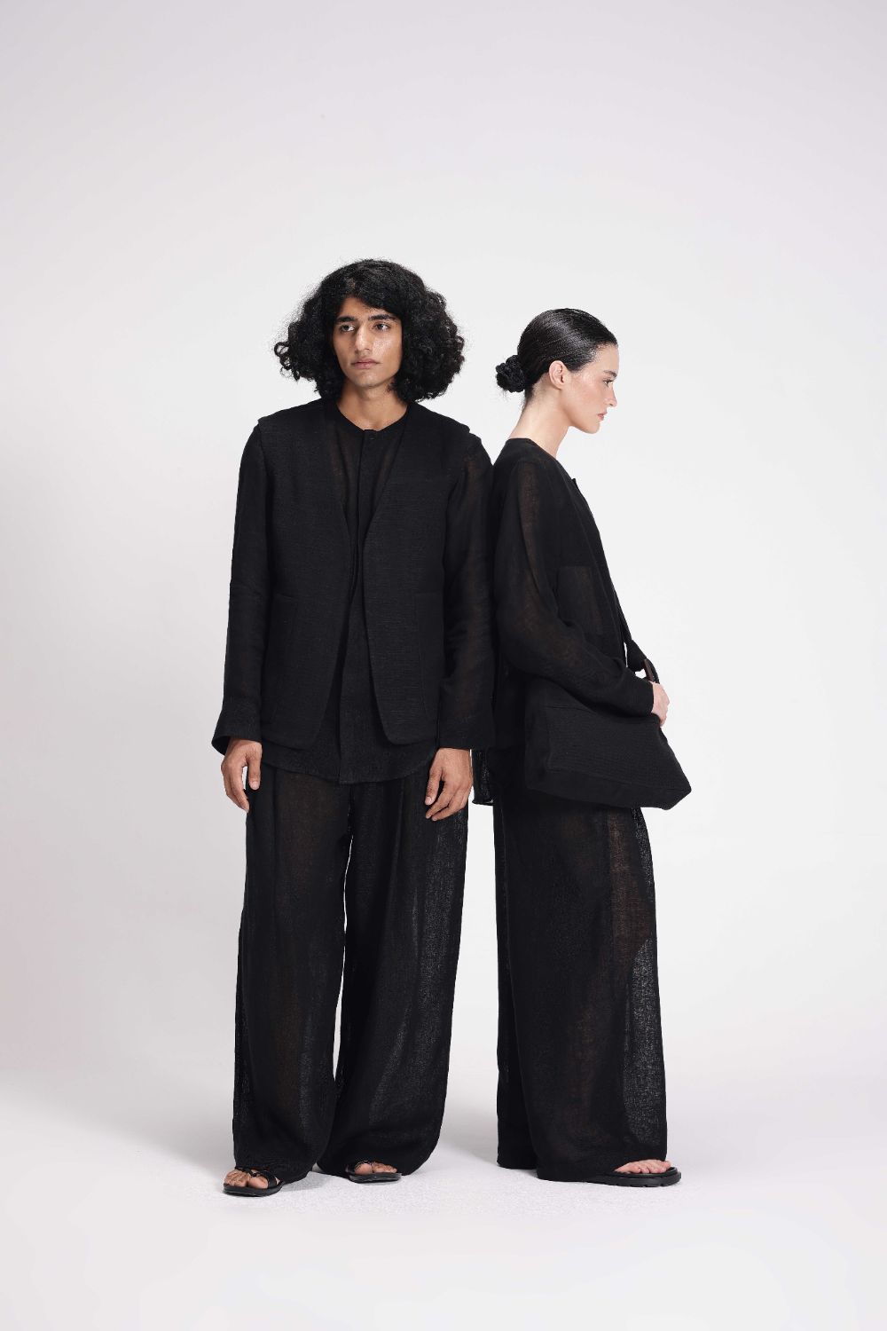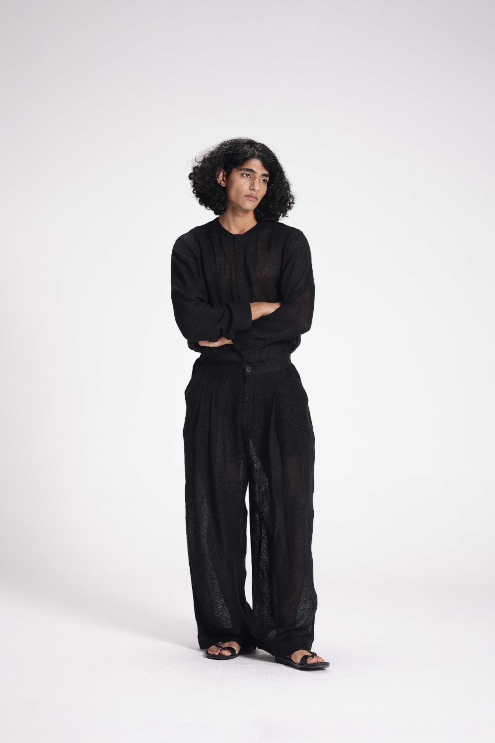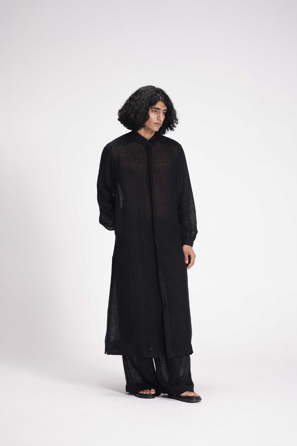 Crafted from linen gauze, this co-ord set is ideal for a relaxed look. The relaxed-fit upper features a classic collar neckline and a concealed placket for a sleek finish. Full sleeves with cuffs and a double-layer yoke add distinctive details to this calf-length silhouette, merging comfort with sophistication. These straight-cut pants come with button and fly zip closure in the front, along with back elastic for comfort. It features elegant box pleat detailing and side pockets for added utility.