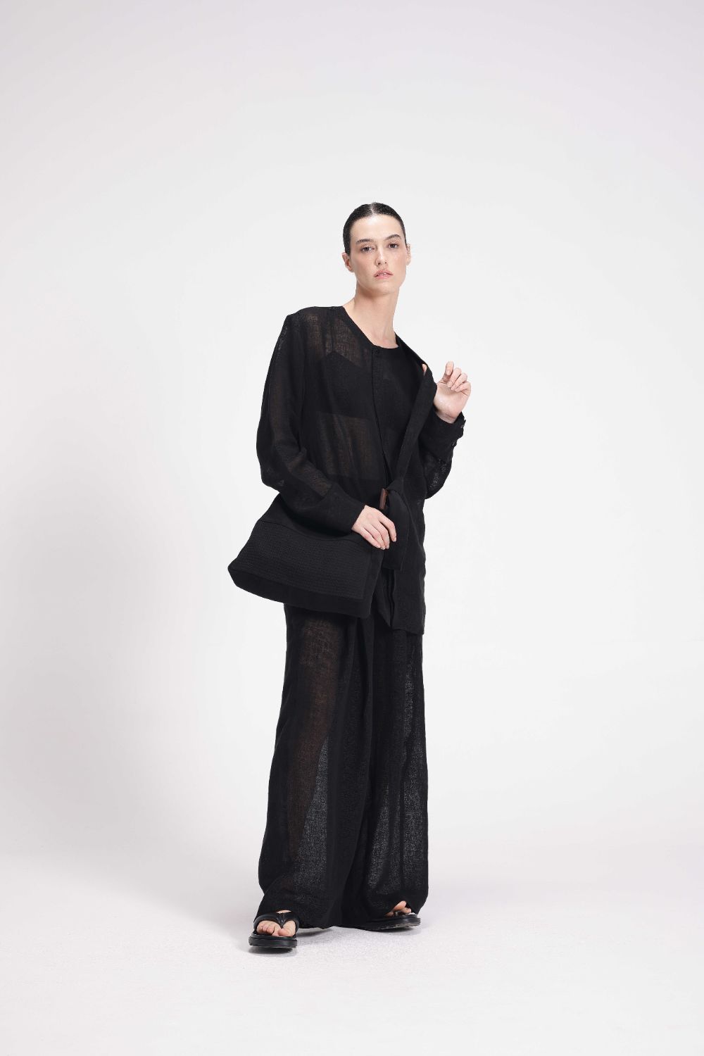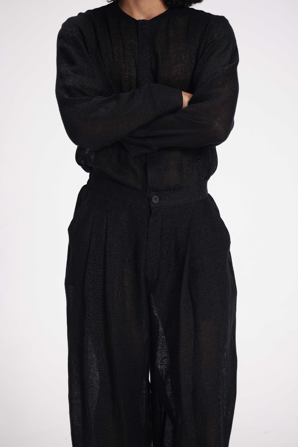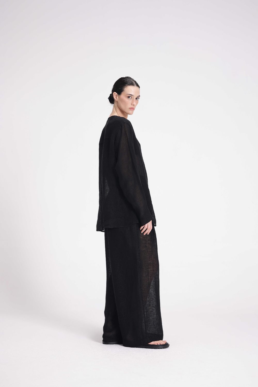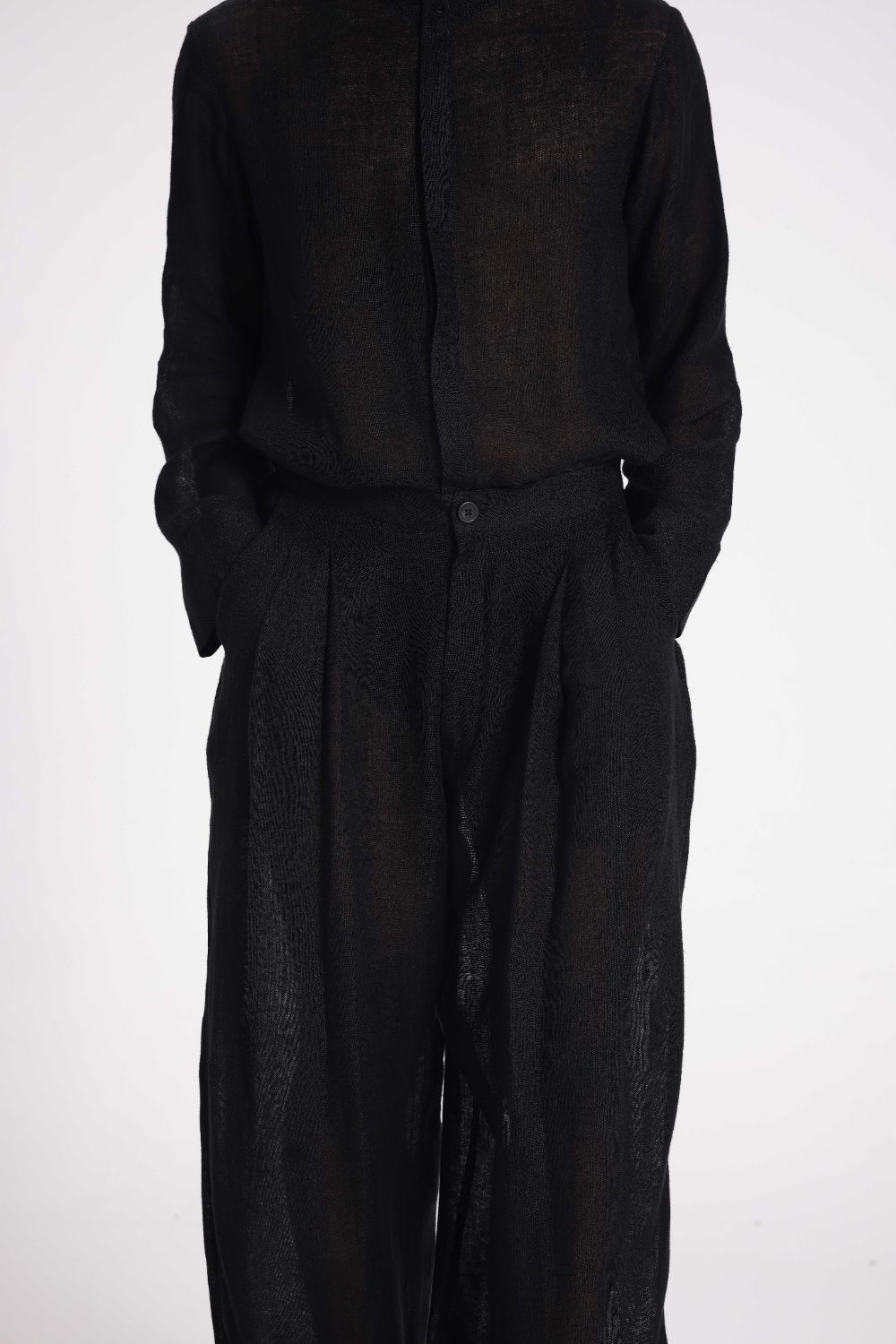 Crafted from linen gauze, this co-ord set is ideal for a relaxed look. The relaxed-fit upper features a classic collar neckline and a concealed placket for a sleek finish. Full sleeves with cuffs and a double-layer yoke add distinctive details to this calf-length silhouette, merging comfort with sophistication. These straight-cut pants come with button and fly zip closure in the front, along with back elastic for comfort. It features elegant box pleat detailing and side pockets for added utility.