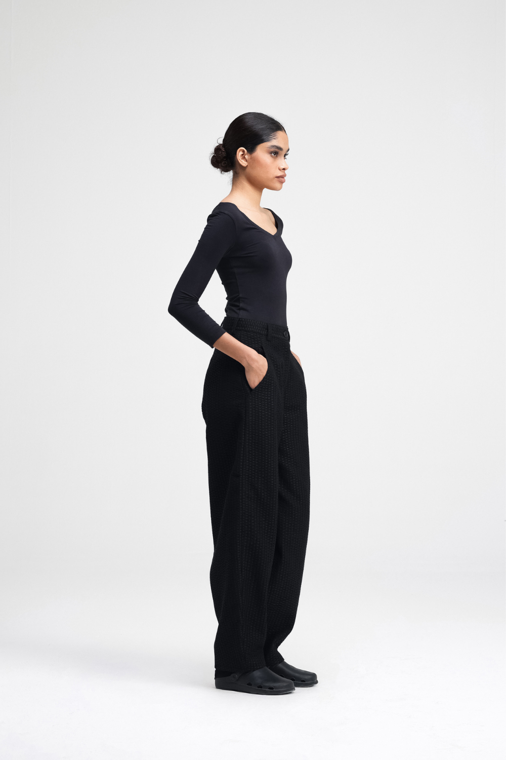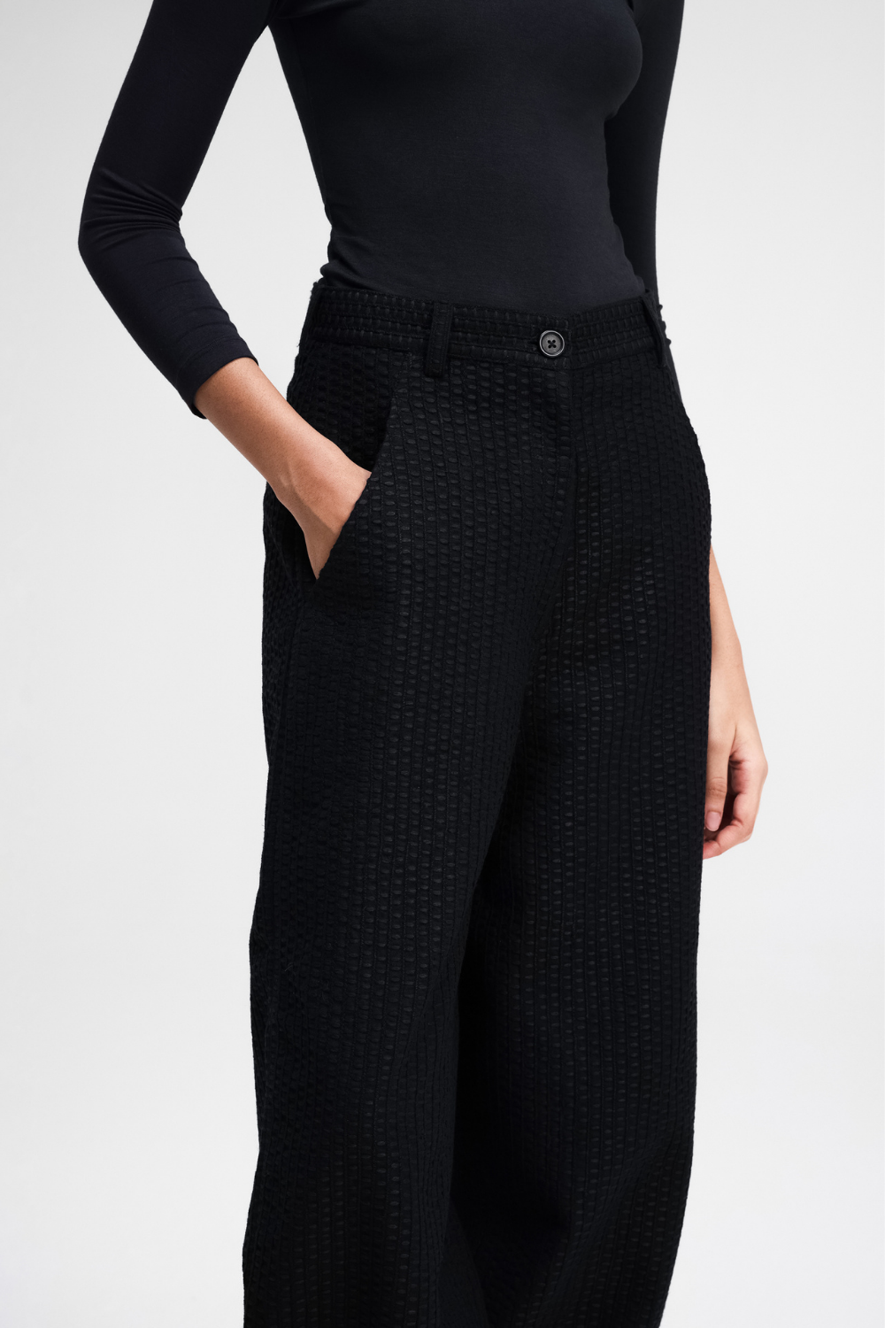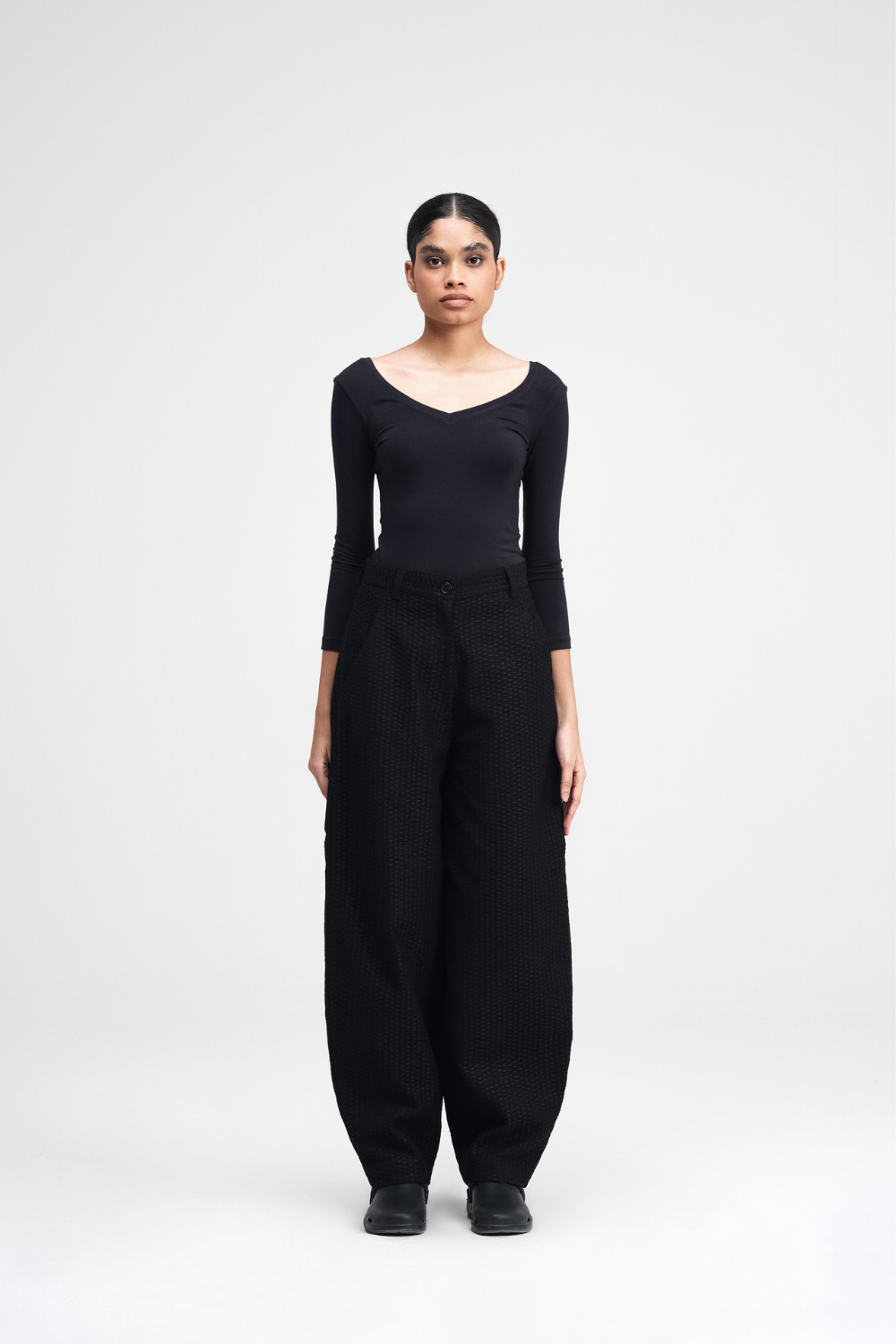 Our Touga pants are a relaxed-fit with a barrel-leg silhouette. Featuring all-over machine embroidery, with back darts for shape, and functional front cross pockets. Fully lined for added comfort, these pants are a statement.