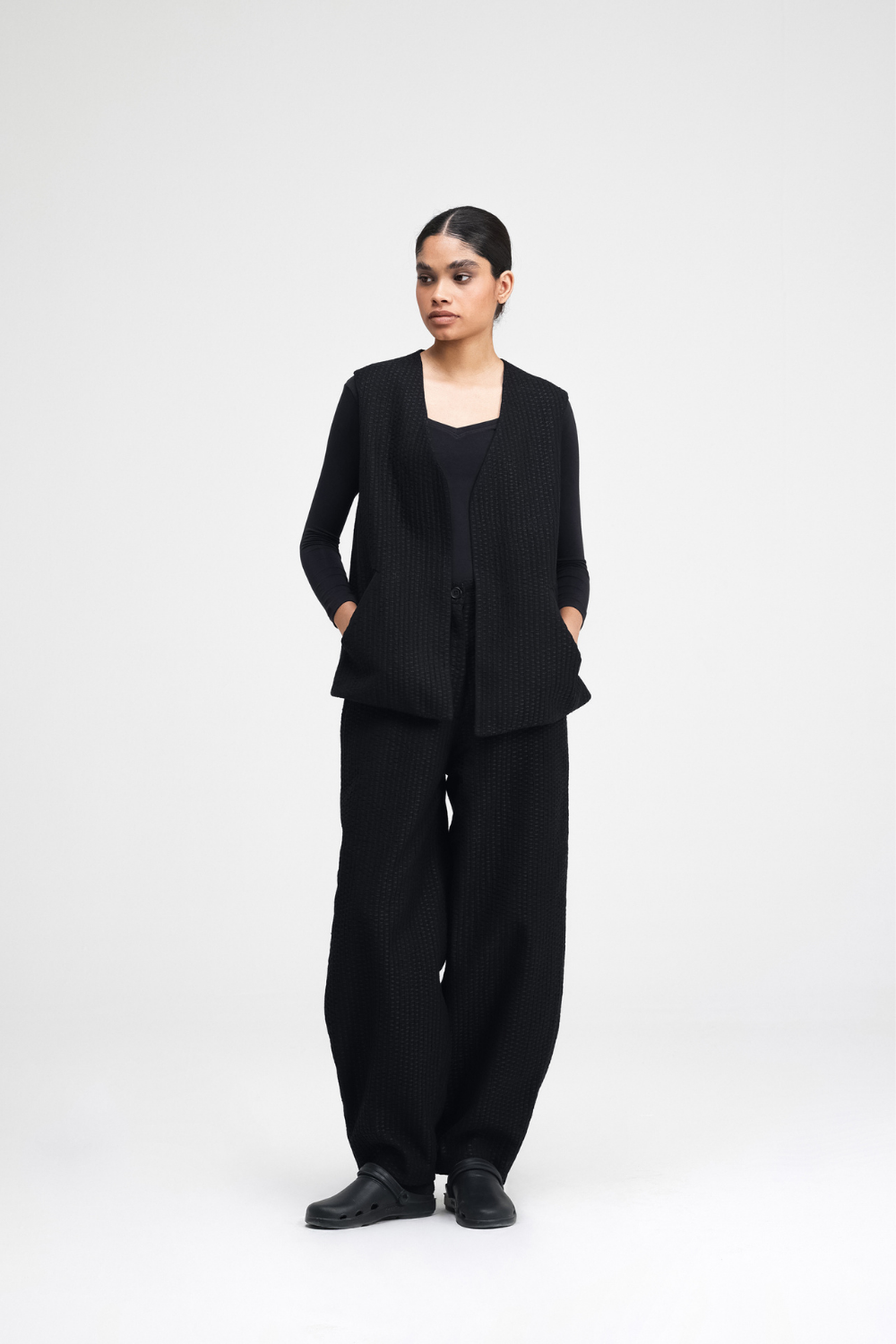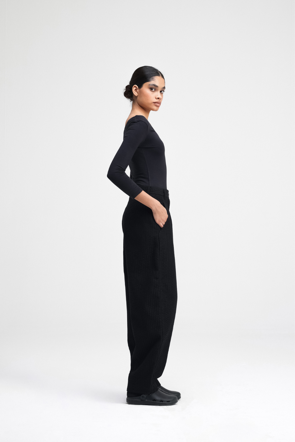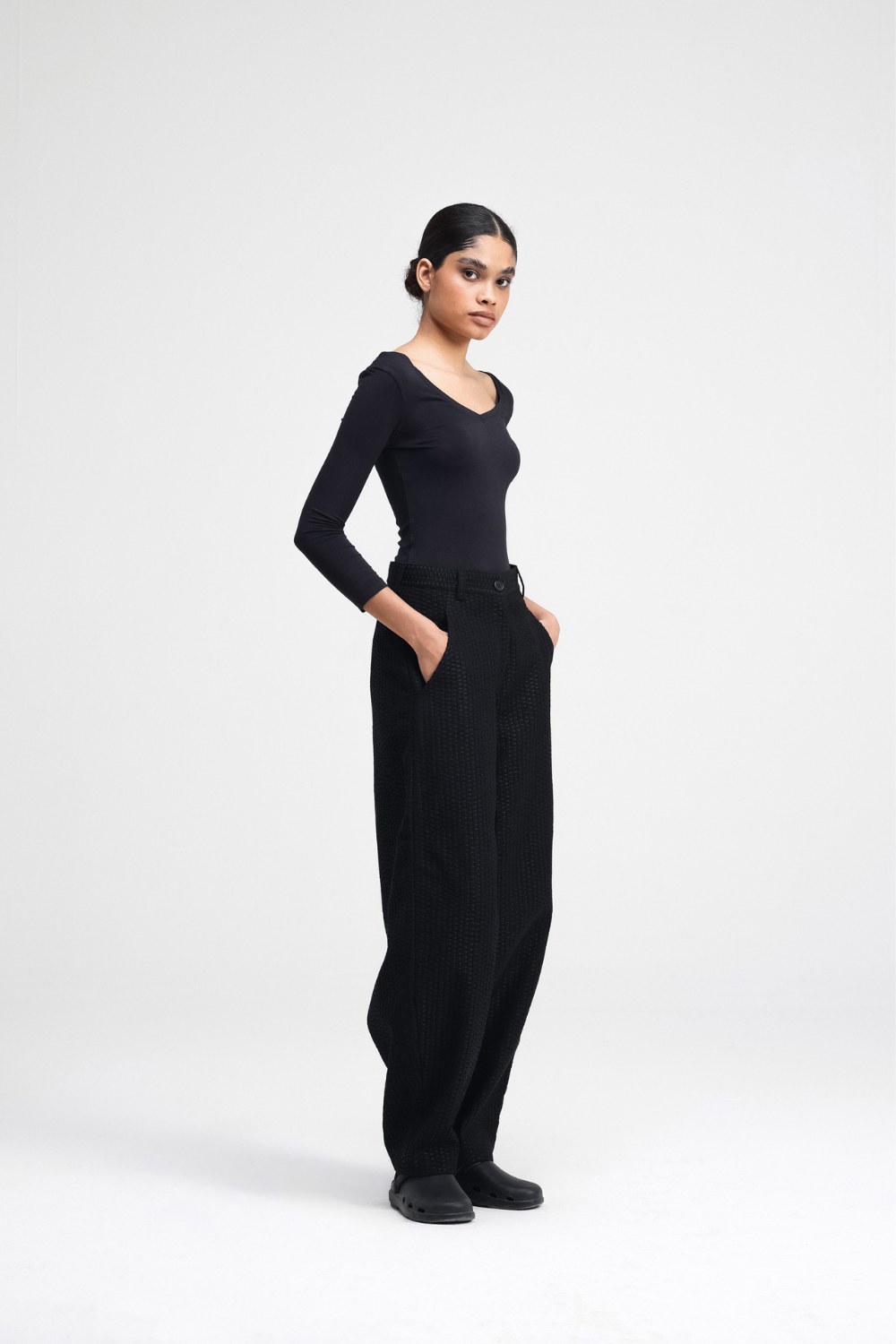 Our Touga pants are a relaxed-fit with a barrel-leg silhouette. Featuring all-over machine embroidery, with back darts for shape, and functional front cross pockets. Fully lined for added comfort, these pants are a statement.