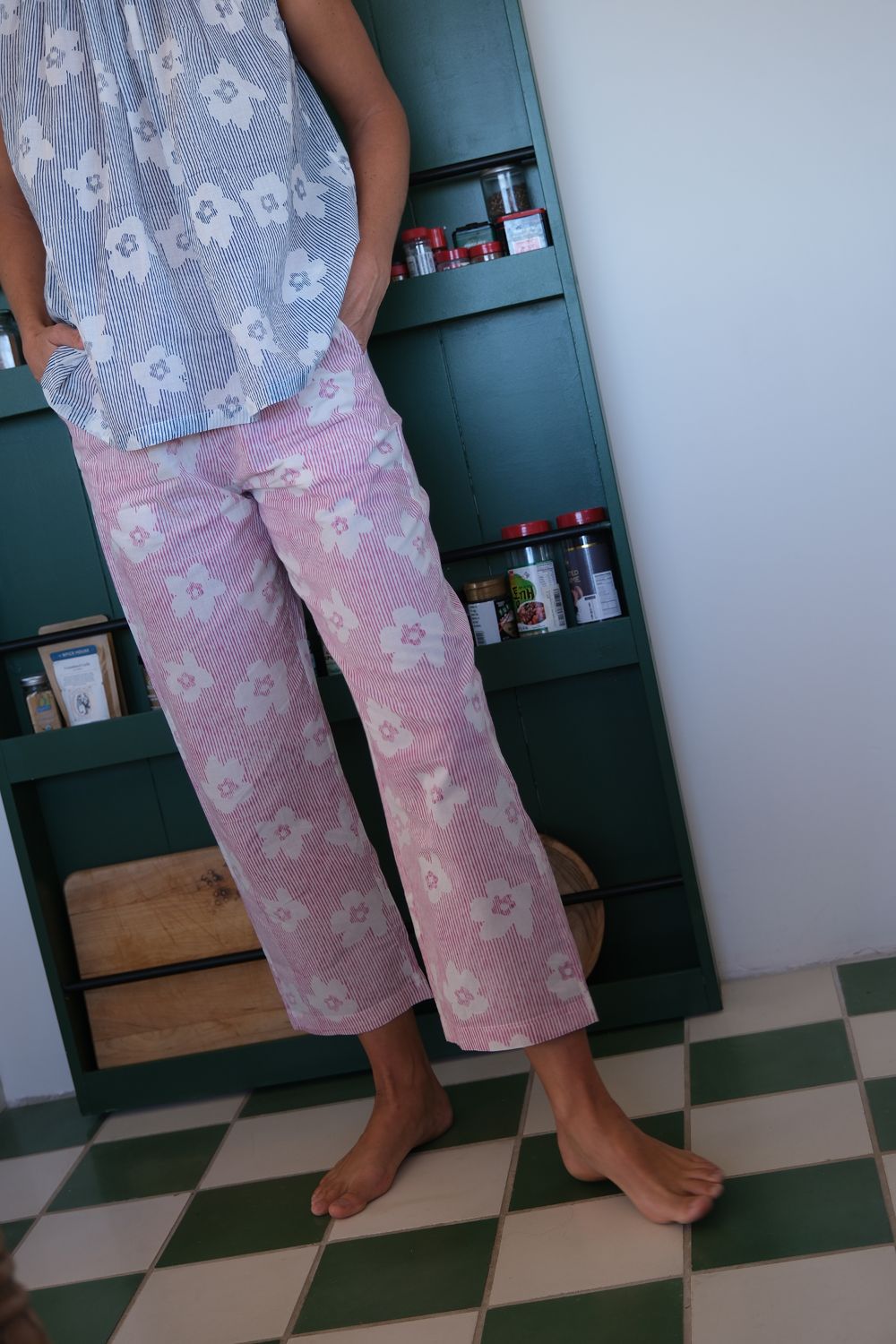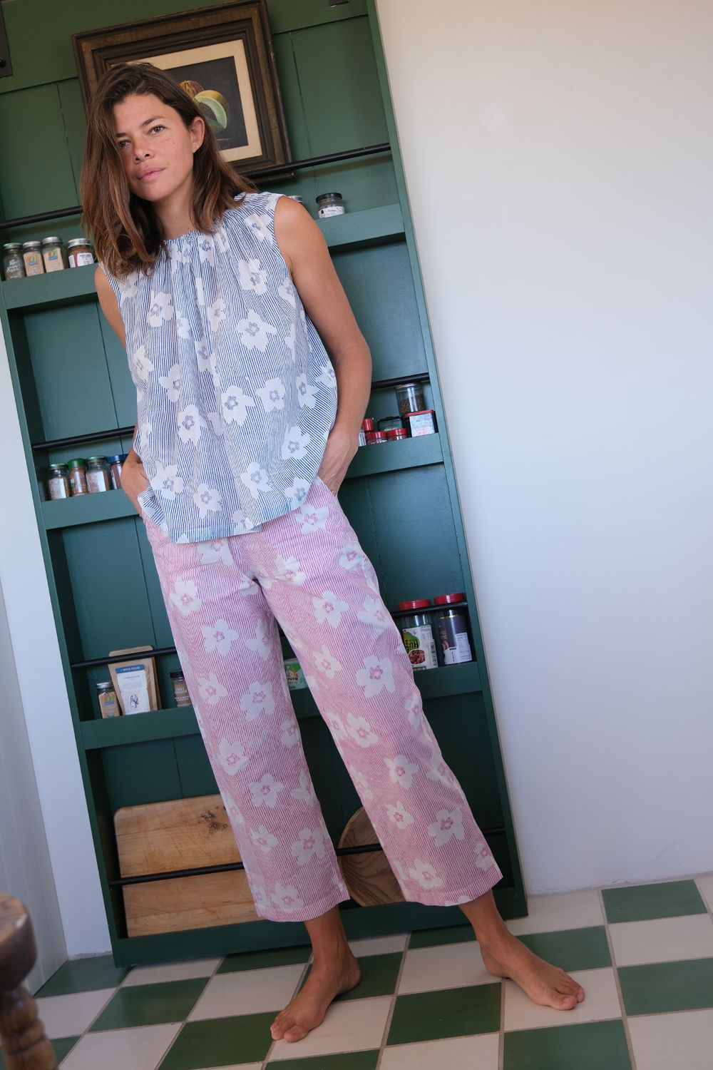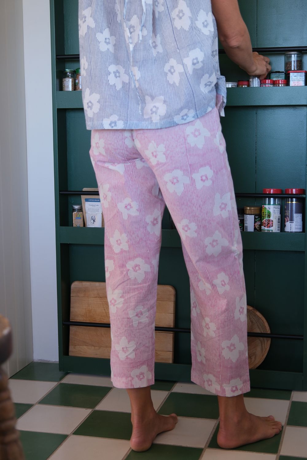 These breezy hand-block printed cotton pants feature a soft rose-pink striped base with delicate white floral motifs. Designed for all-day comfort, they offer a relaxed, straight-leg silhouette with an elasticated drawstring waistband for an adjustable and easy fit.