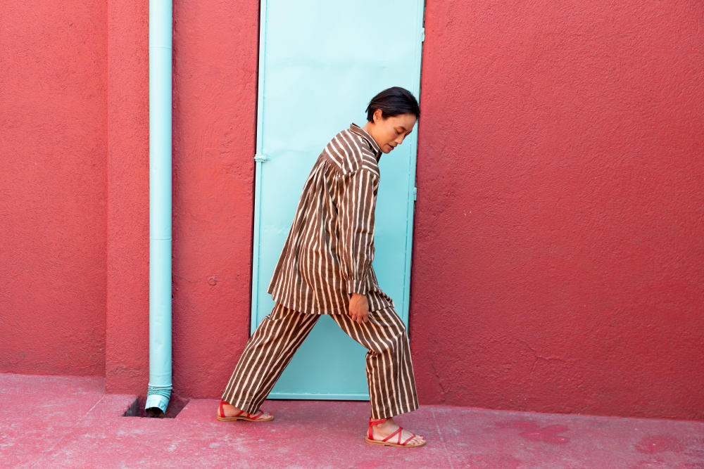Their silhouettes—relaxed, modern, quietly poetic—carry a language of ease and intention. Natural dyes, azo-free pigments, and slow-woven textiles result in garments that feel honest: soft on the skin, kind to the earth, and deeply respectful of the communities who create them. Each piece is cut and stitched only when ordered, honouring the principle that beauty need not come at the cost of excess.