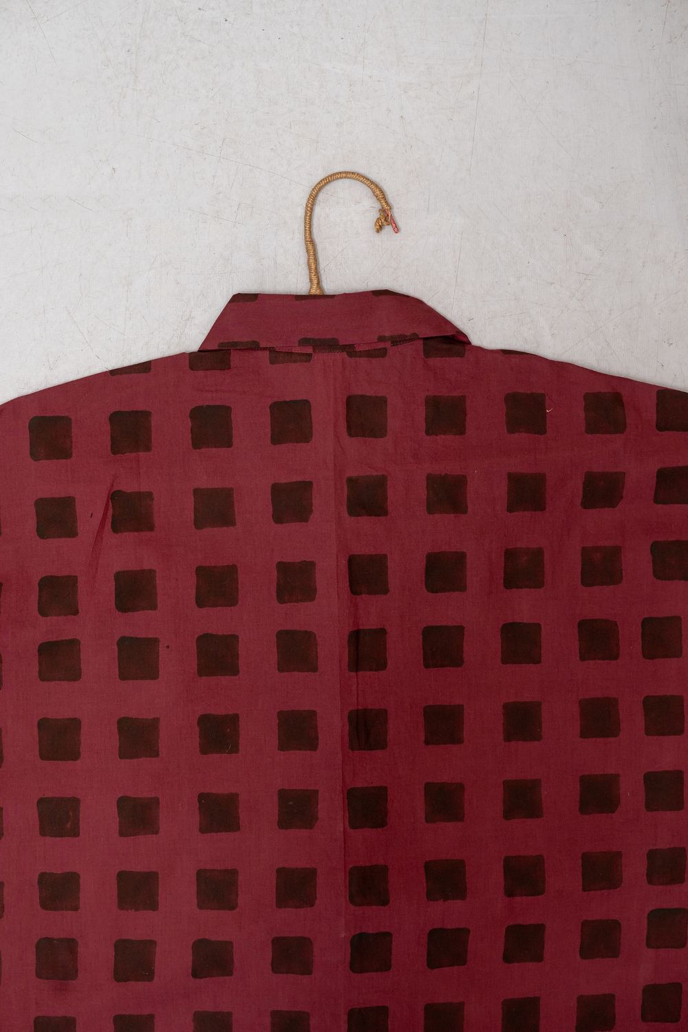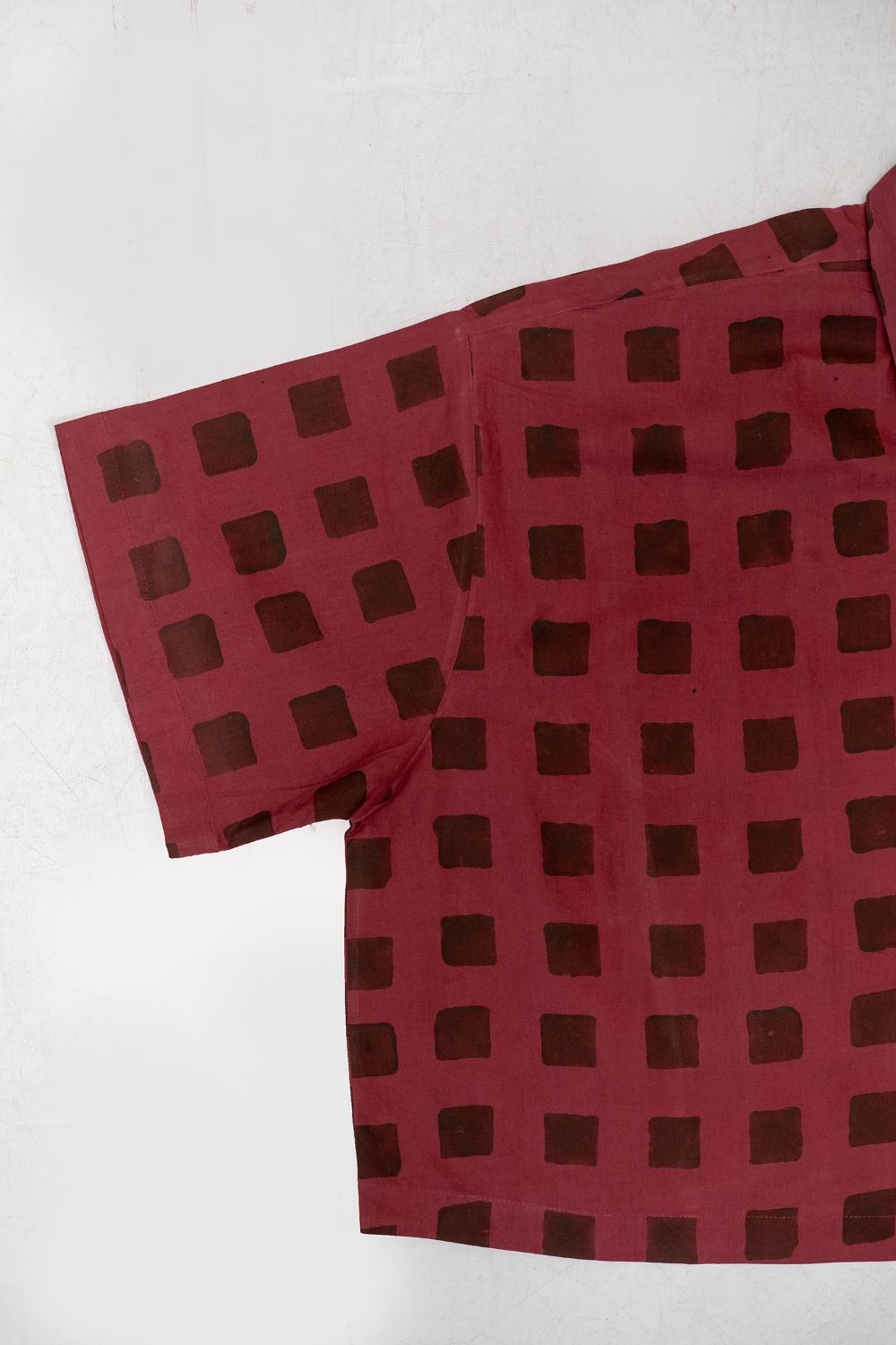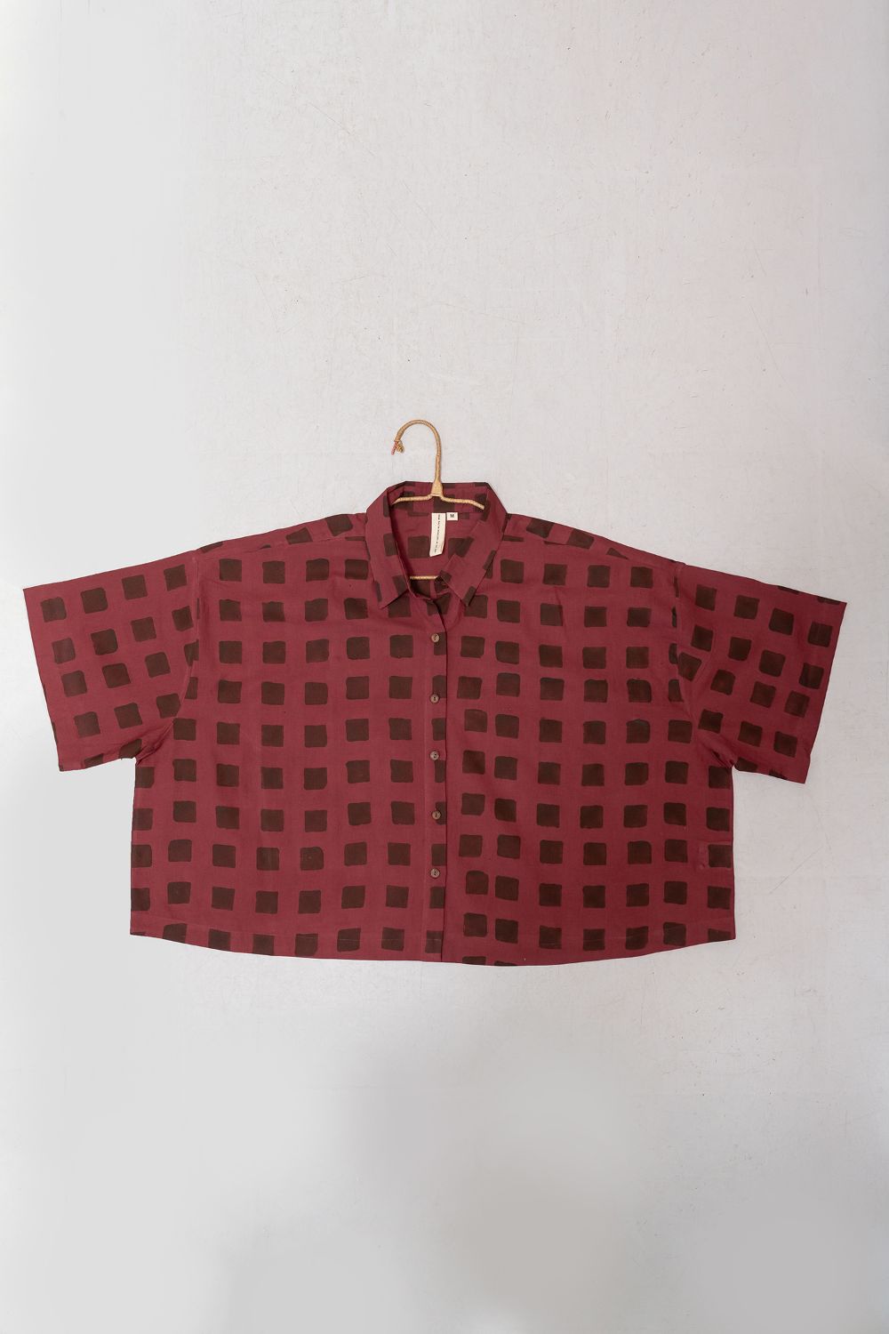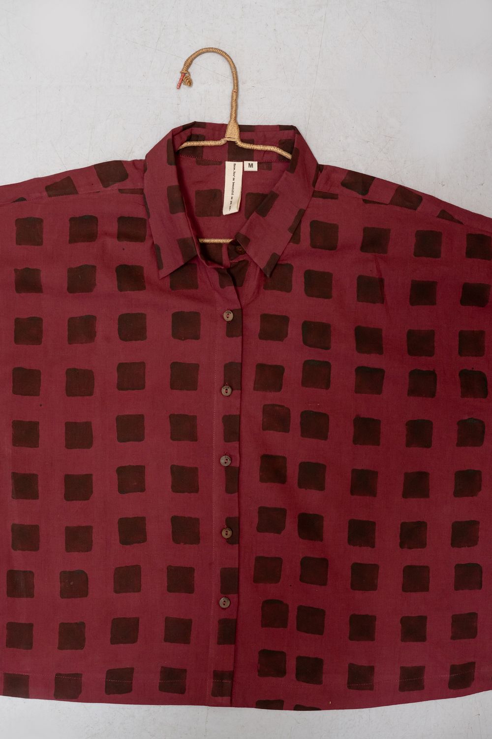 A contemporary take on timeless craft, this shirt features hand-blocked squares in deep cocoa on a rich burgundy base. Printed on assumed handwoven organic cotton with azo-free dyes, the bold, graphic grid pattern celebrates individuality and a standout aesthetic. A relaxed, oversized fit and classic button-down design make it a versatile, impactful staple