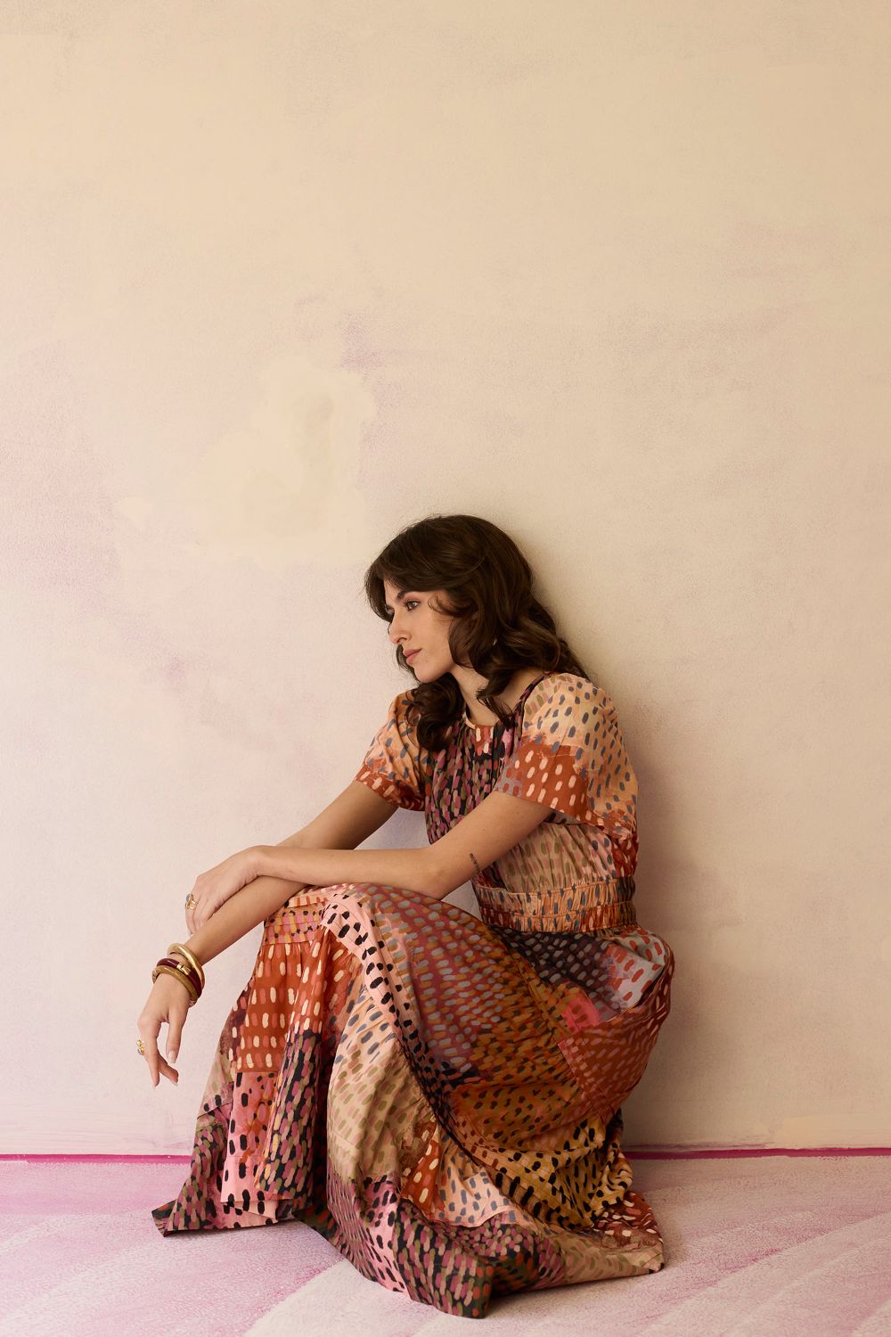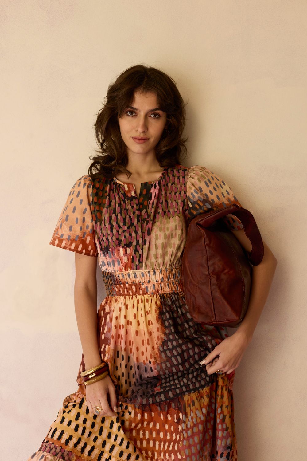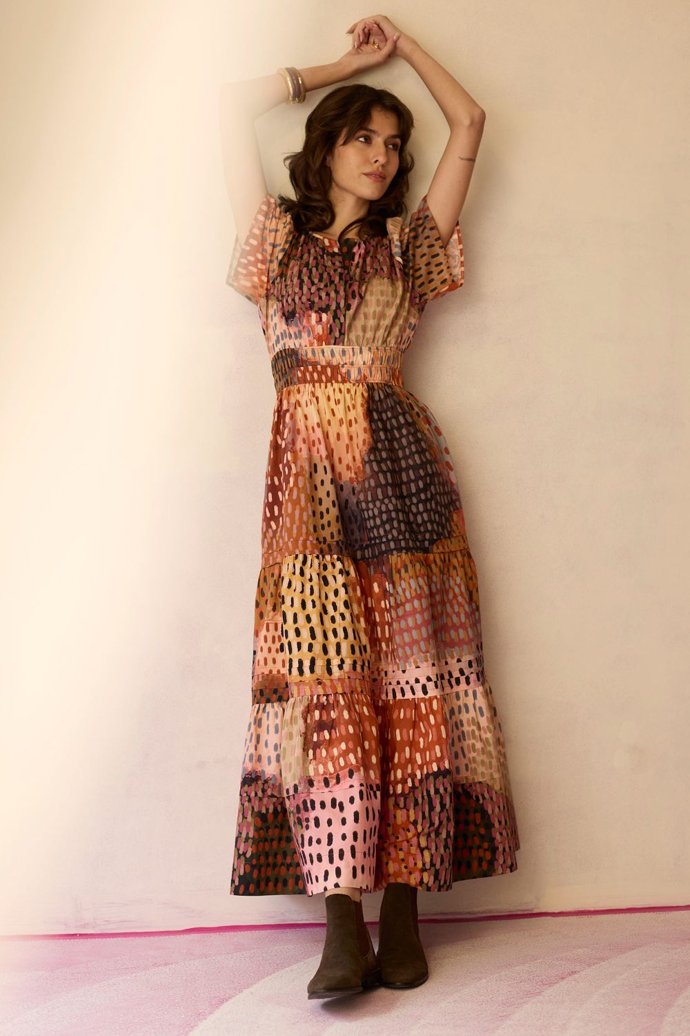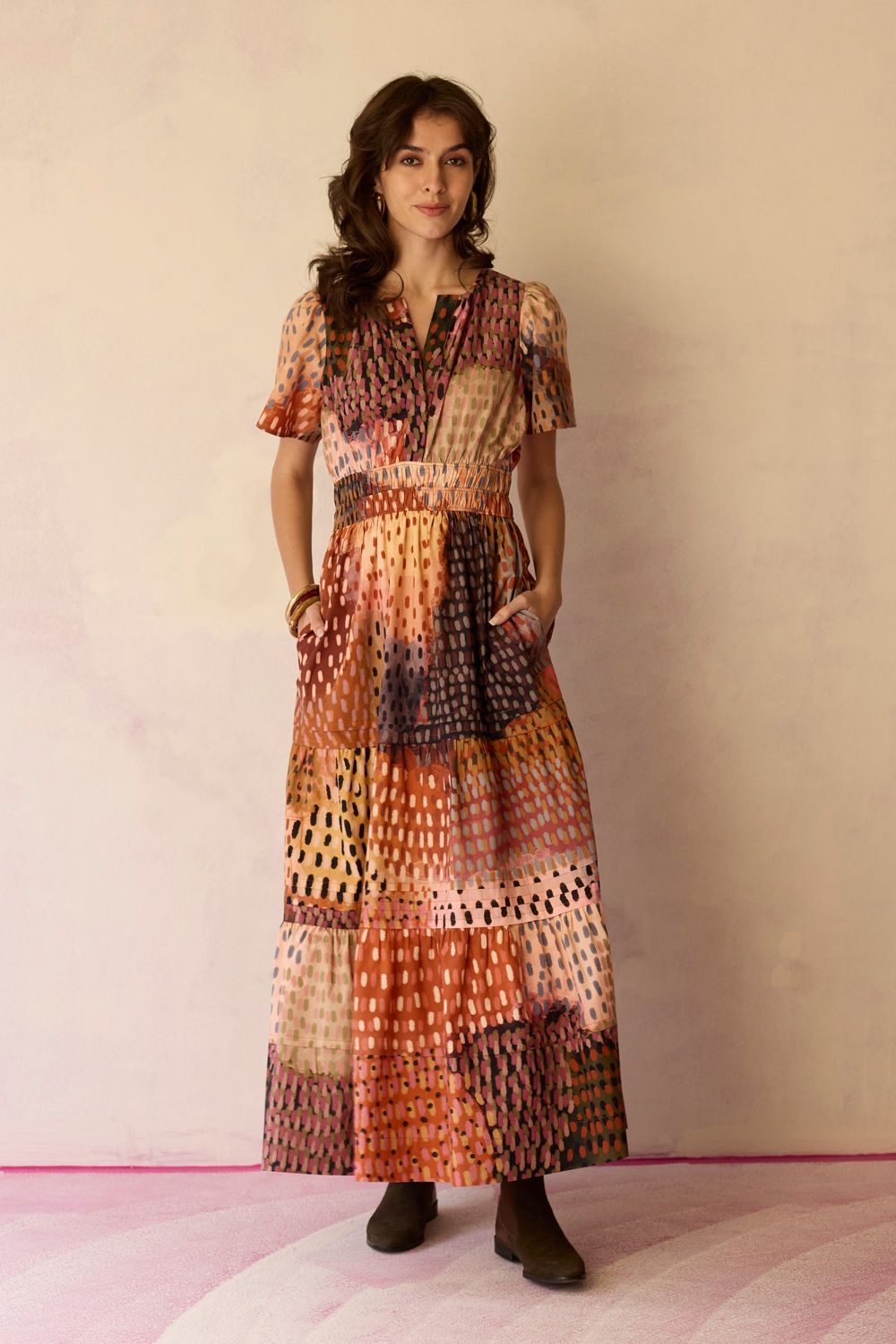 Crafted in crisp organic 80s poplin, this maxi-length pleated dress is designed to hold its shape while moving beautifully with every step. Featuring front neckline button detailing and waist smocking that creates a comfortable yet flattering fit, the silhouette feels defined without restriction. The short sleeves add everyday ease, balancing structure with softness. Rendered in a rich, patchwork-style print, this piece blends bold pattern with considered tailoring for a look that feels expressive, confident, and effortlessly put together.