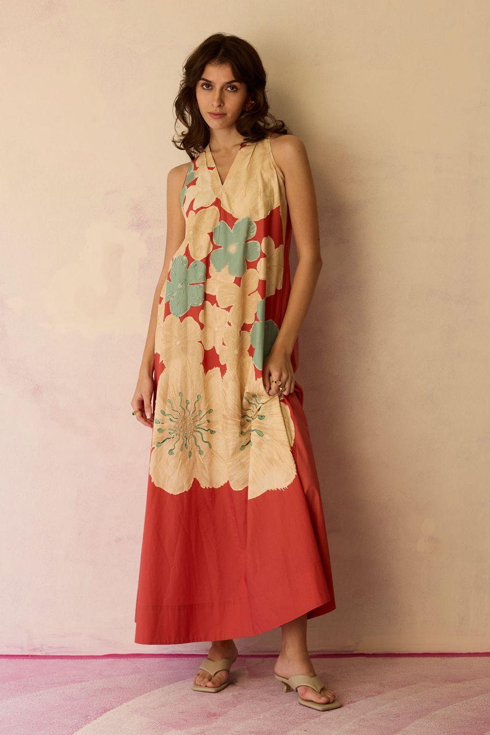 This sleeveless maxi dress made of organic 80s poplin features a clean V-neckline and a relaxed, flowing silhouette designed for comfort and movement. Detailed with handcrafted embellishments, the floral motifs gain a subtle artisanal finish that elevates the overall look. Rendered in a warm coral base with soft contrasting tones, the palette feels sun-warmed and expressive. With functional pockets seamlessly built in, this piece brings together refined detailing and everyday practicality.