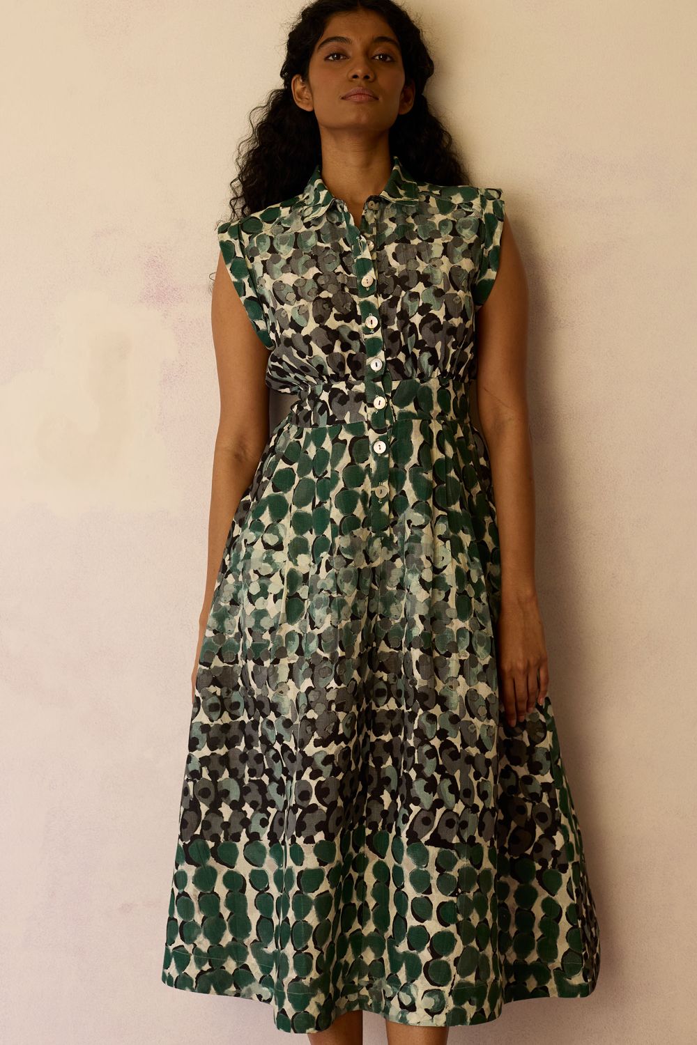 A cap-sleeve midi dress designed with a fluid silhouette that moves effortlessly with the body. Featuring a front button closure and a softly elasticated waist, the dress offers comfort while creating a gently defined shape. Rendered in the Moss print, the colour story blends deep, earthy greens with muted neutrals, giving the piece a grounded, nature-inspired feel. Finished with a flowy skirt and easy midi length, this is a quietly statement-making dress for everyday wear.