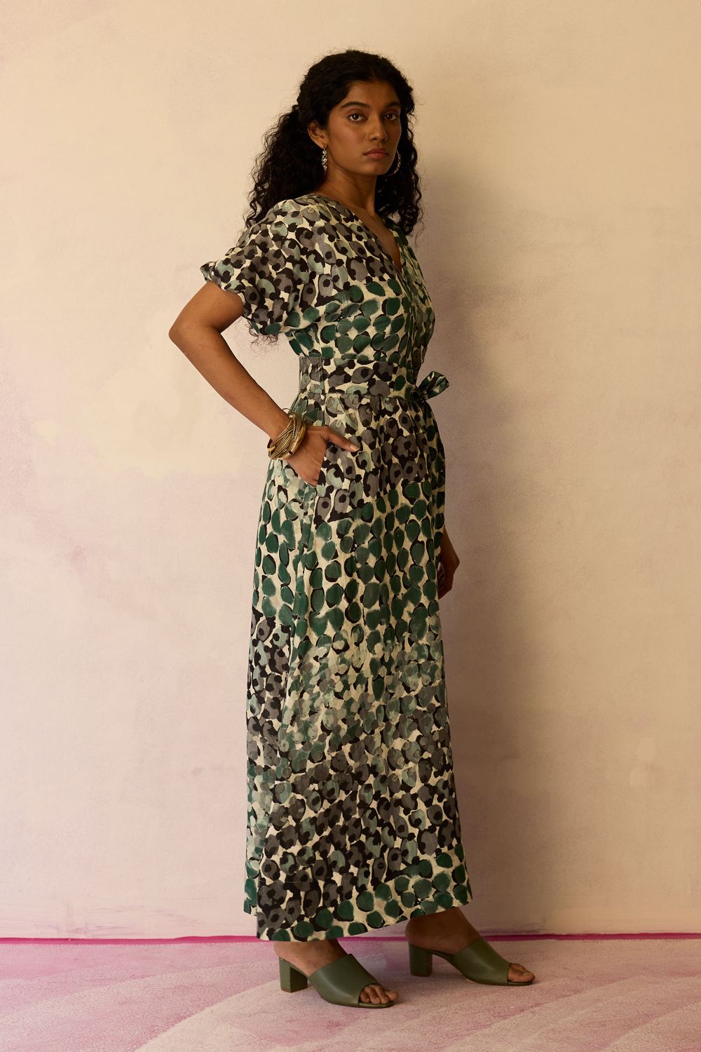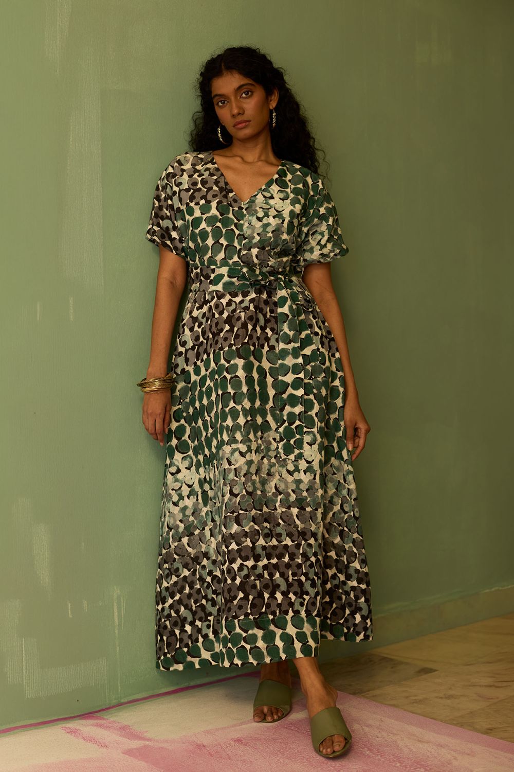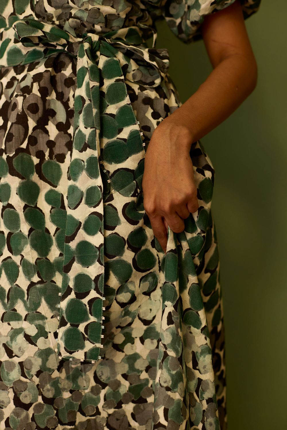 A maxi-length dress designed with a fluid, easy silhouette that moves beautifully with the body. Featuring a flattering V-neckline and short sleeves, the look feels light yet defined. The back tie detail allows for an adjustable fit, cinching the waist to create a well-shaped, feminine silhouette without compromising comfort. Rendered in the striking Moss print, this piece blends structure and softness for an effortlessly elegant statement.