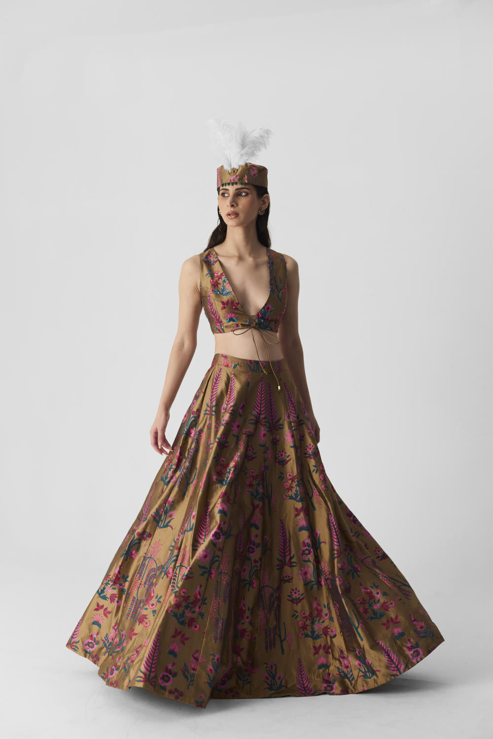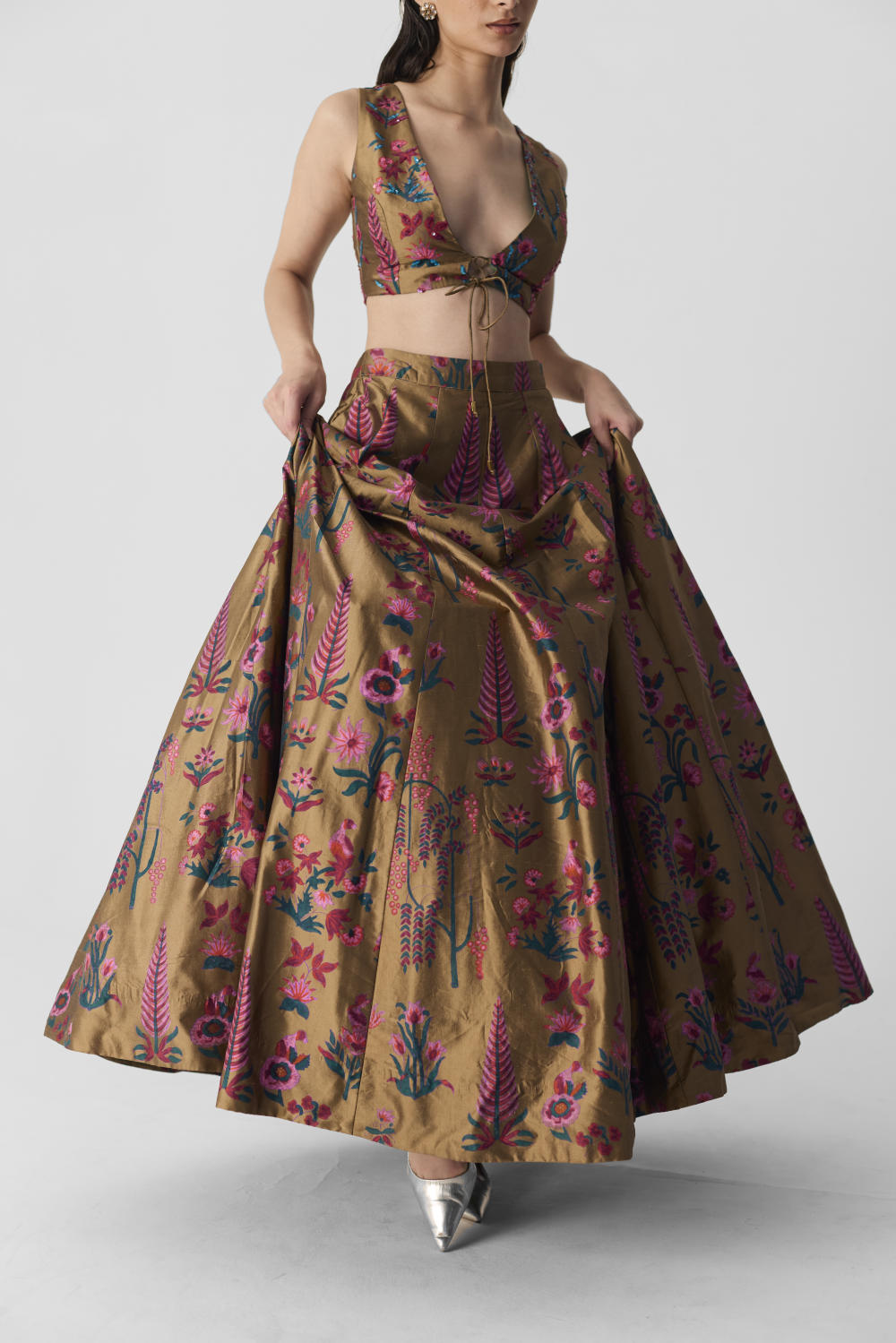 This stunning lehenga and blouse set is crafted from luxurious pure silk, featuring a vibrant Bahar print. The blouse showcases a stylish V-neckline, accented with front dori knots for a chic look and a perfect fit.