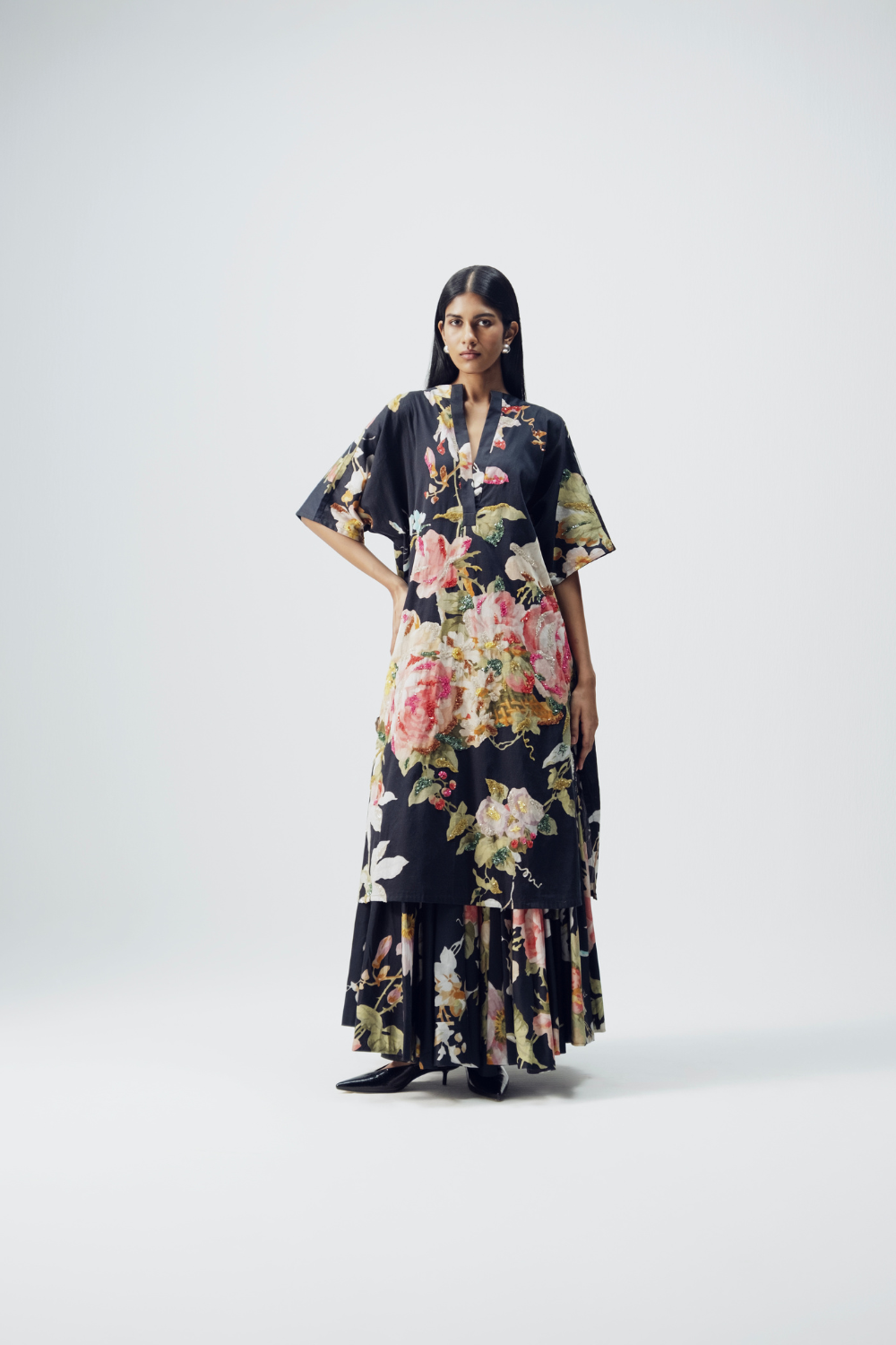 The outfit features a bold artistic floral print in shades of pink, ivory, yellow, and green set against a deep black background, giving it a dramatic and sophisticated feel. The embroidered detailing on the front of the kurta enhances the floral motifs, adding texture, depth, and a touch of handcrafted luxury.