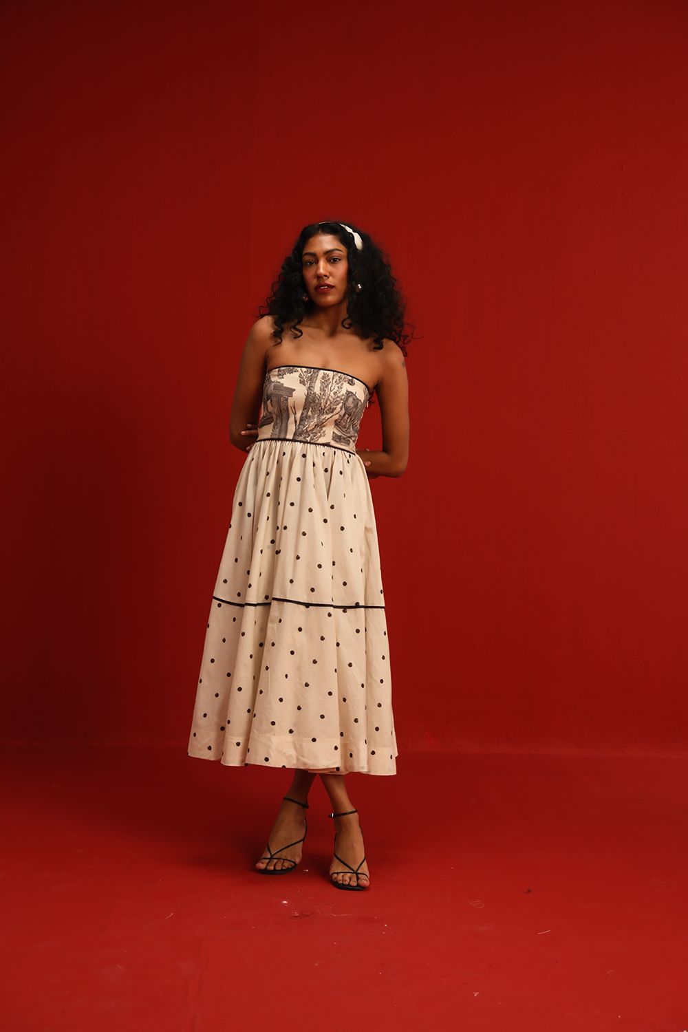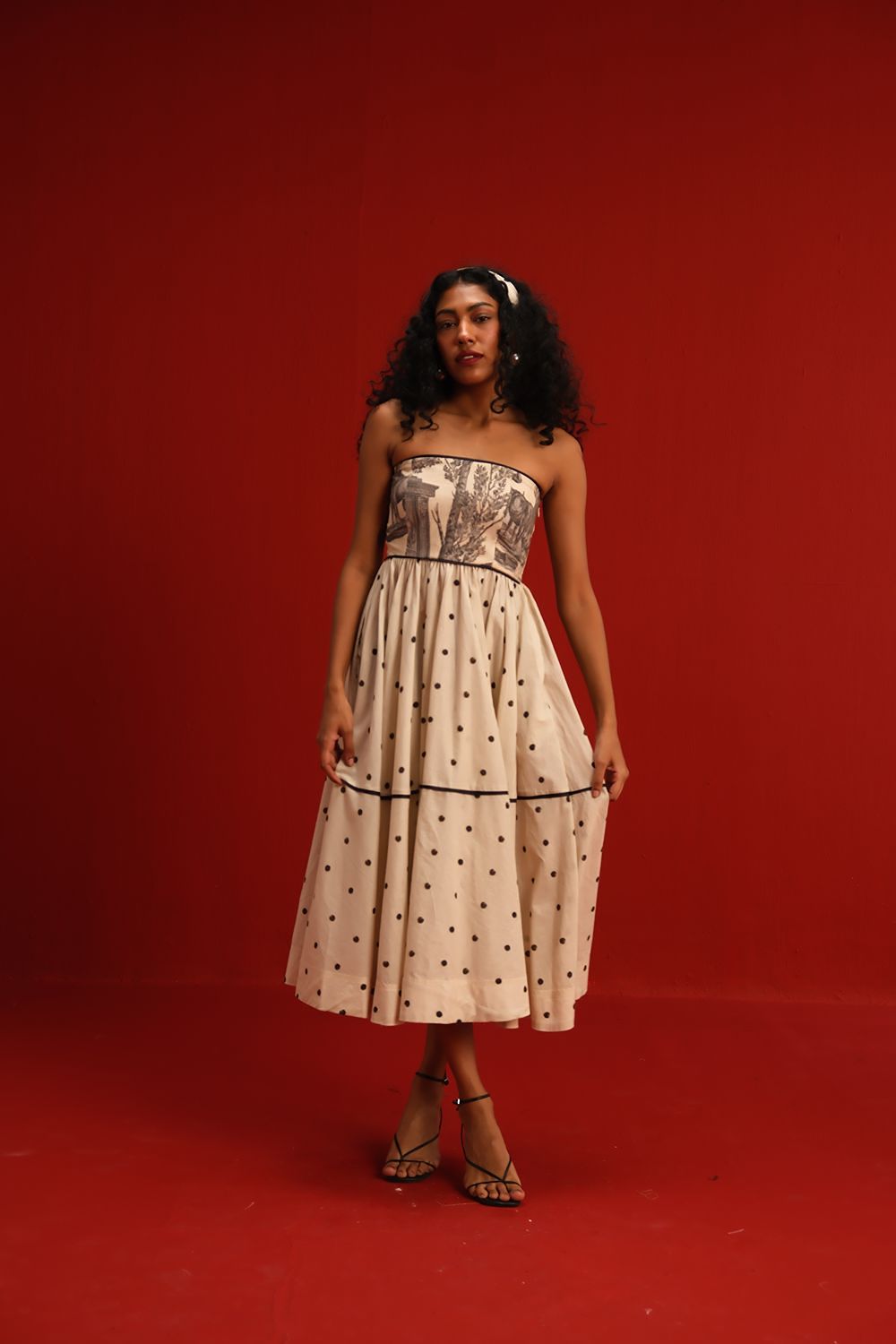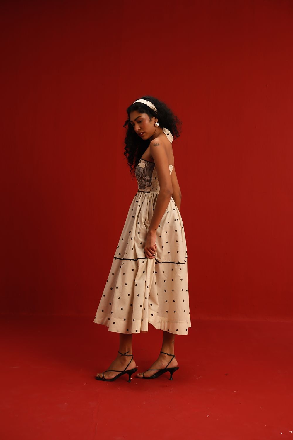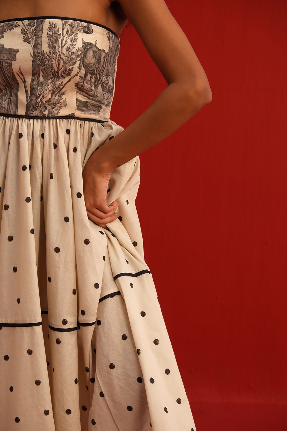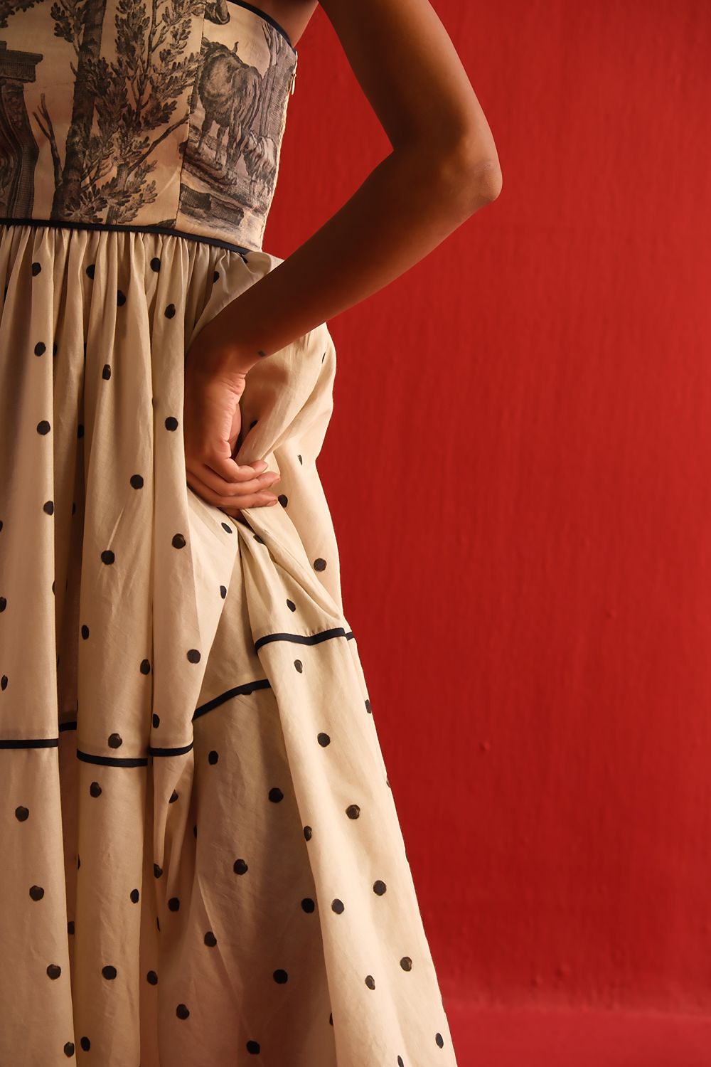 Color: Ivory base with black polka dots and vintage brown-toned bodice
