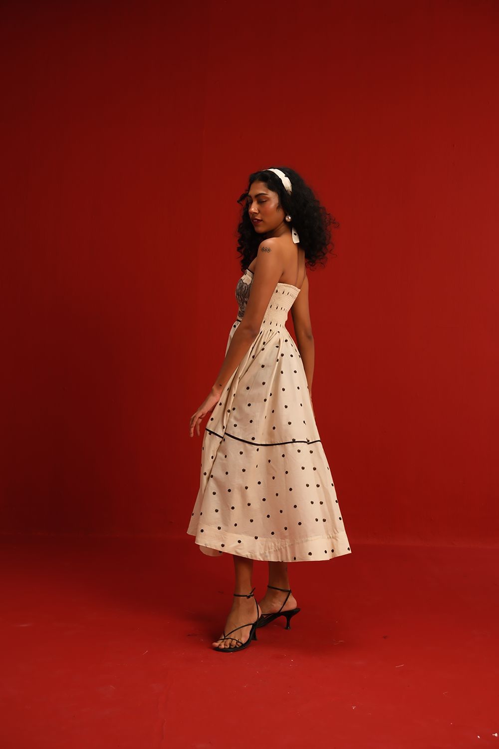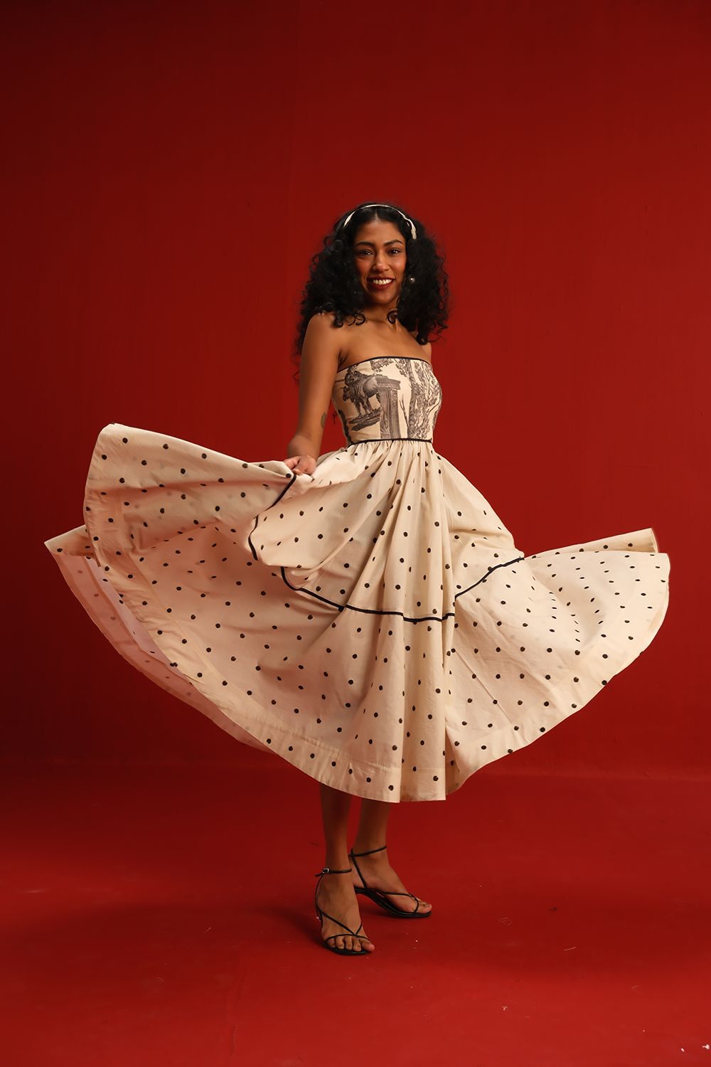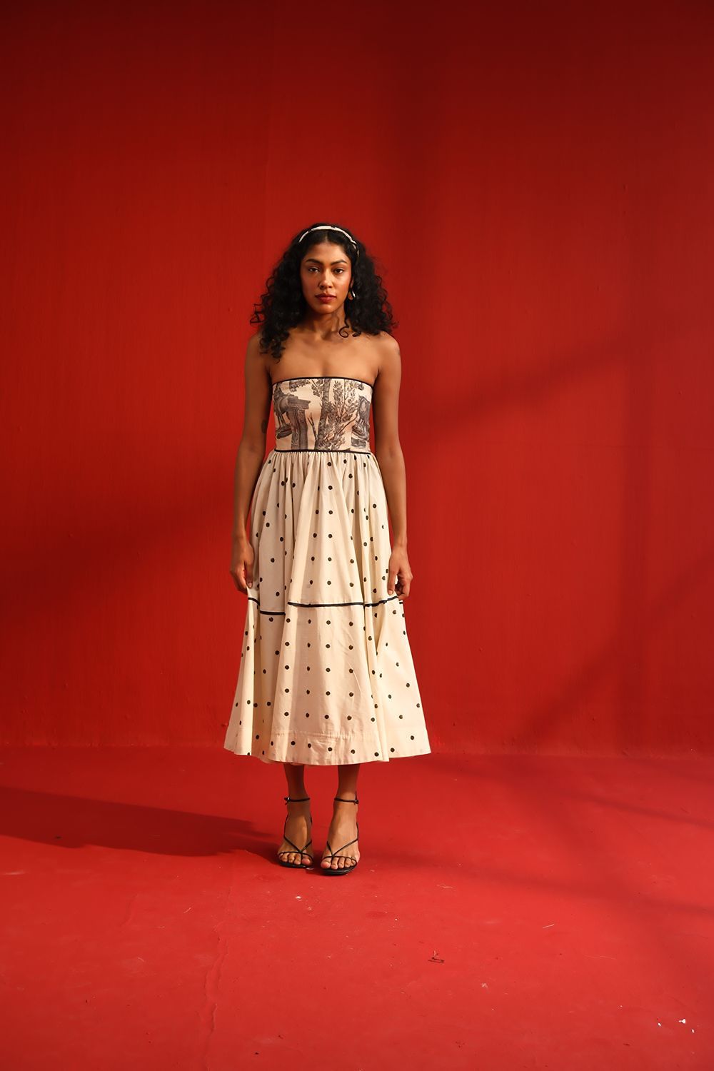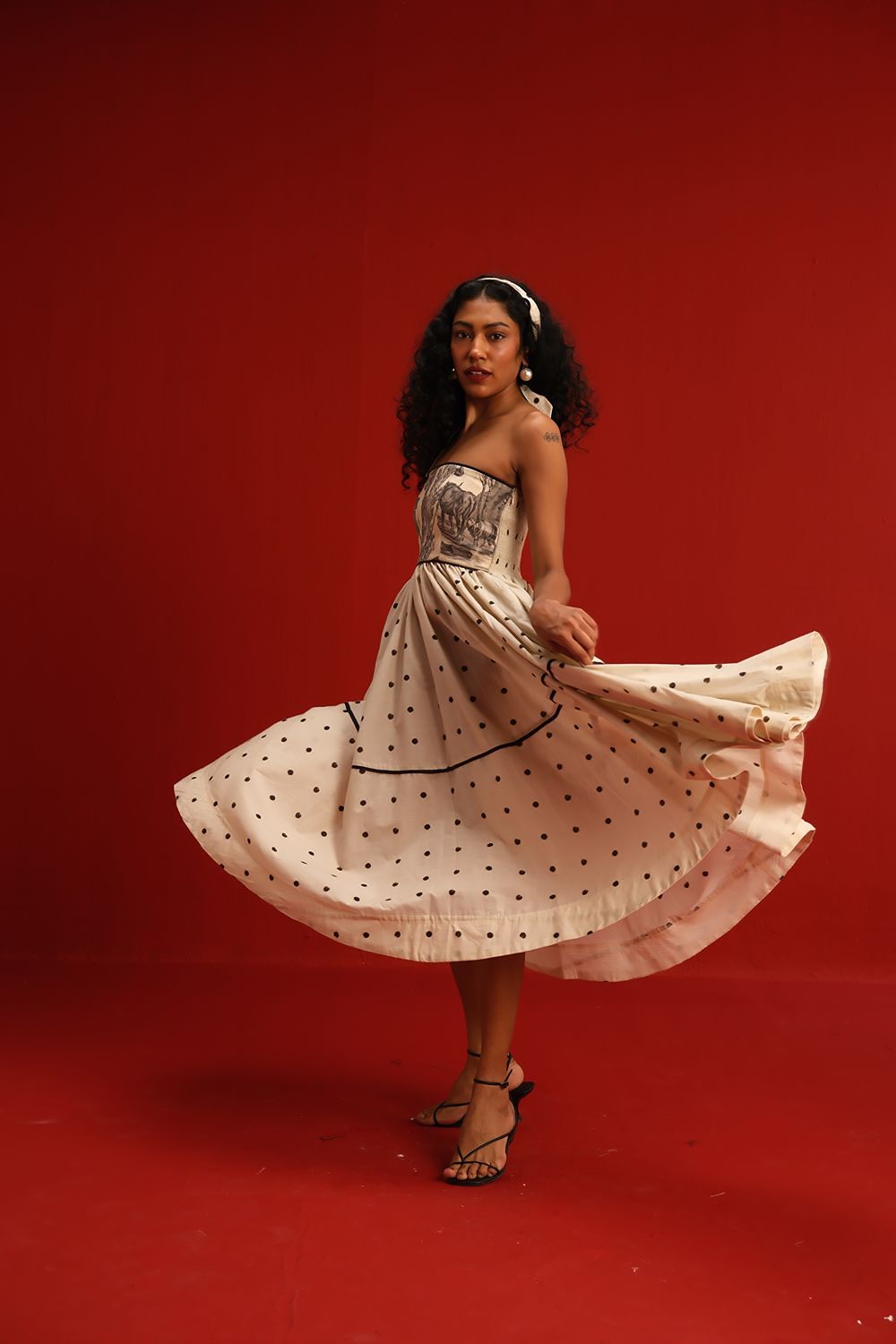 Color: Ivory base with black polka dots and vintage brown-toned bodice