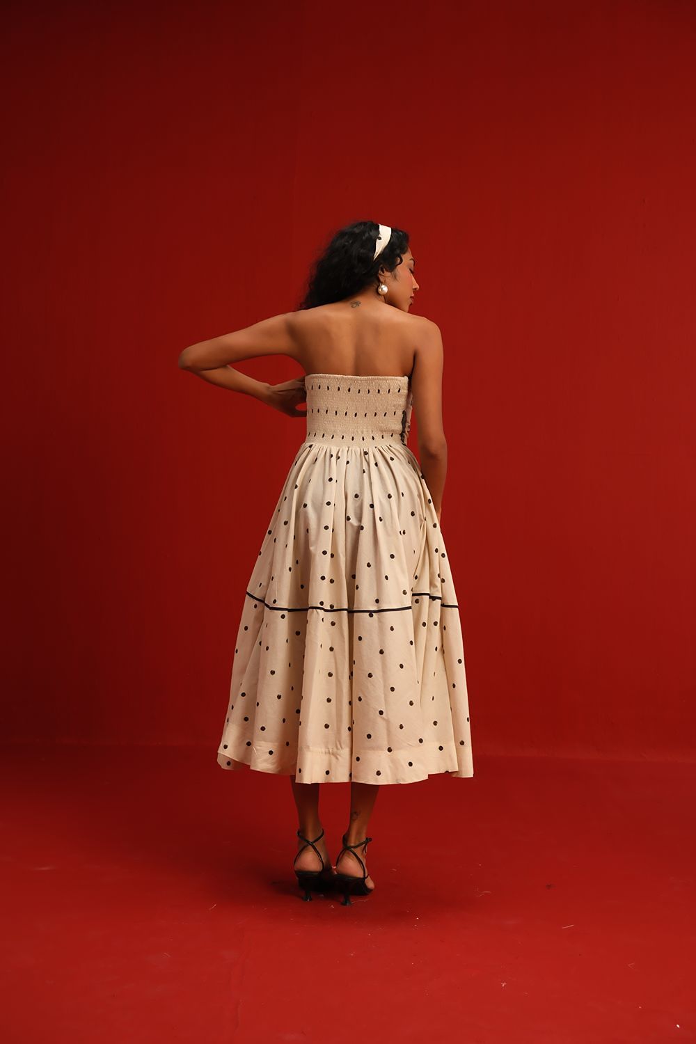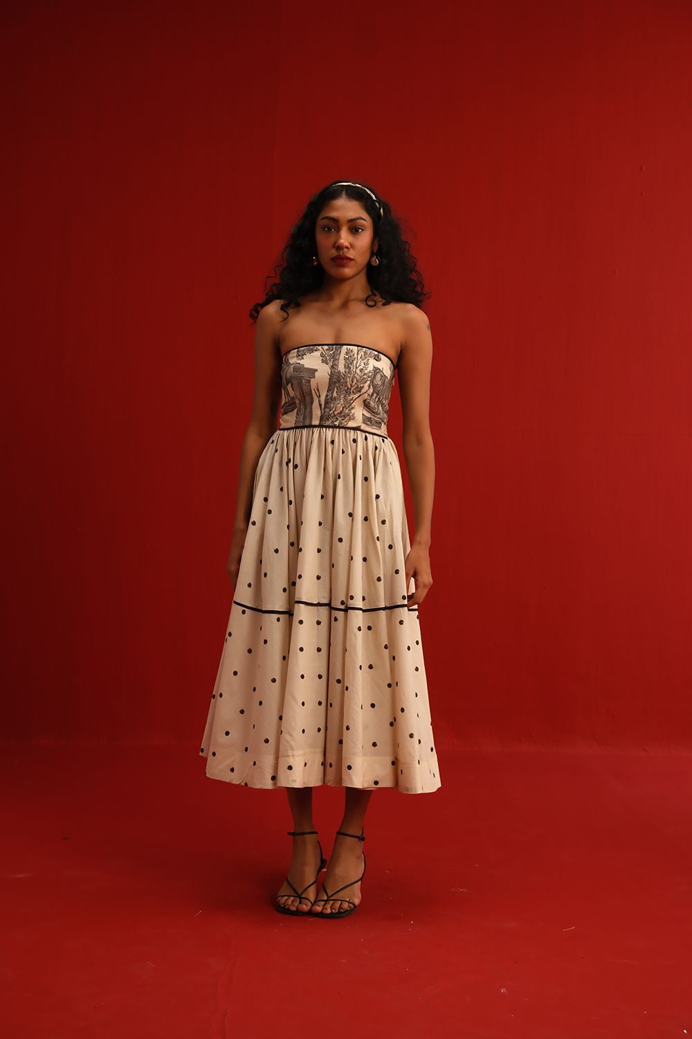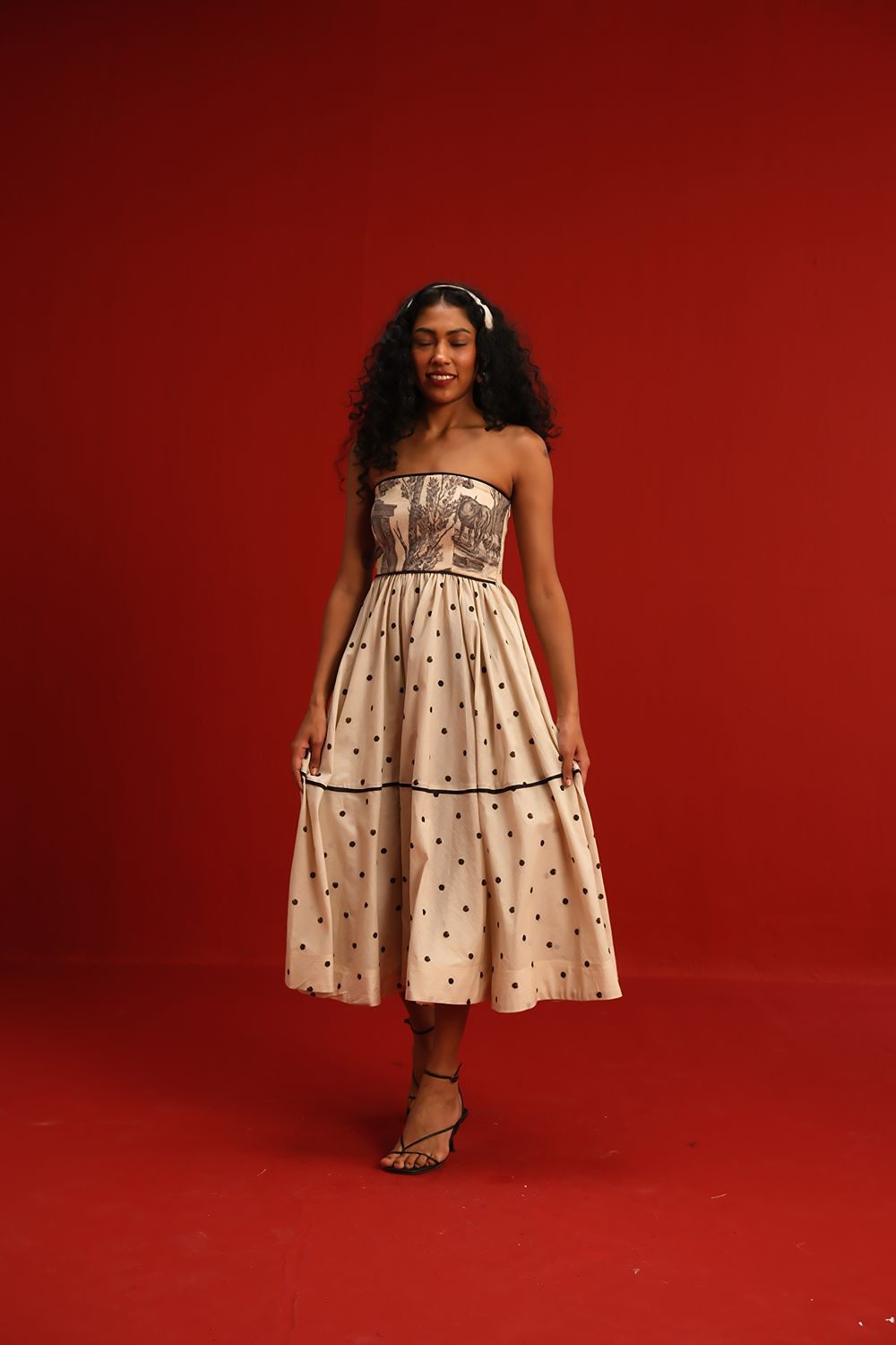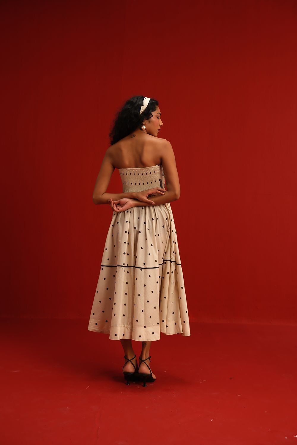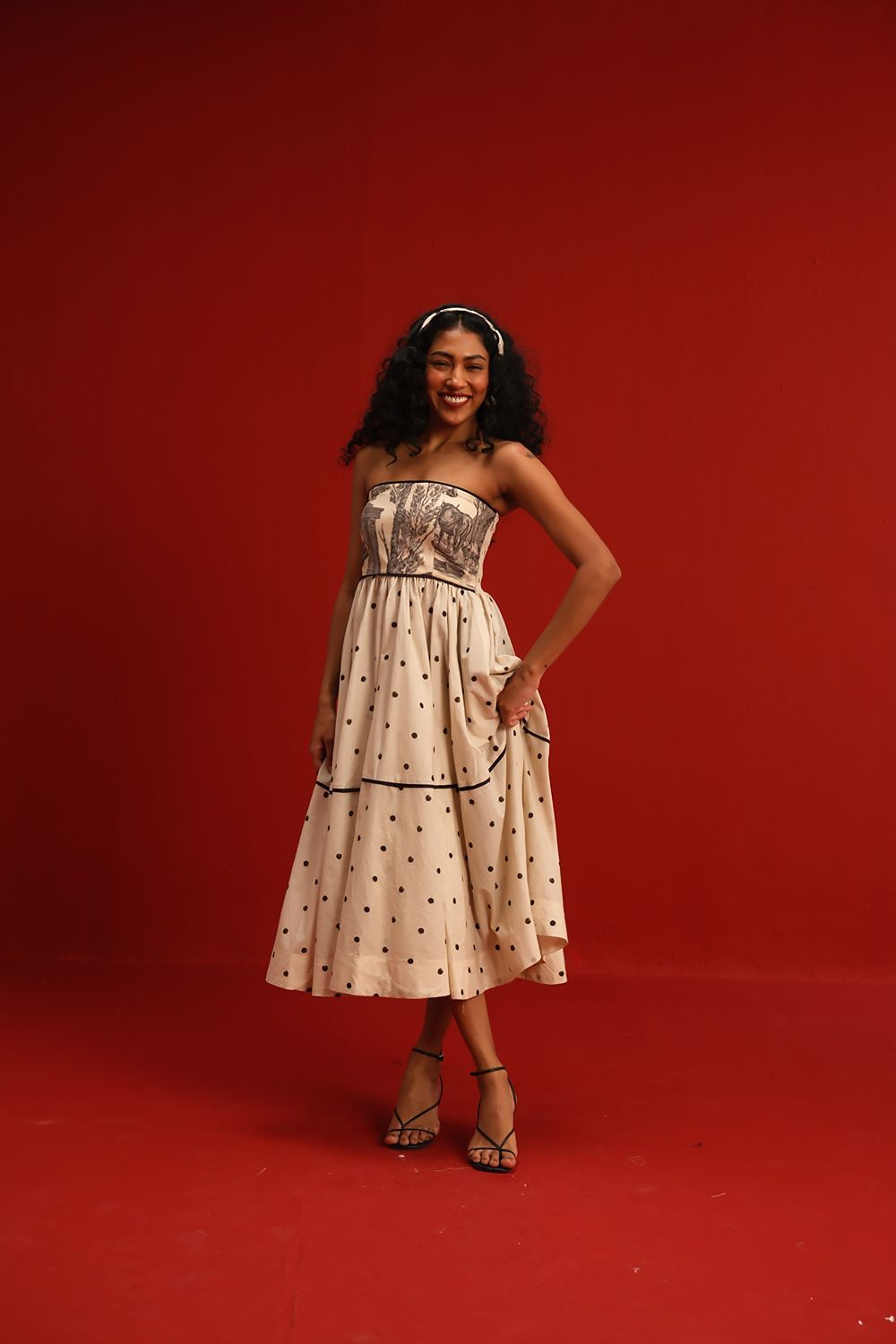 Color: Ivory base with black polka dots and vintage brown-toned bodice