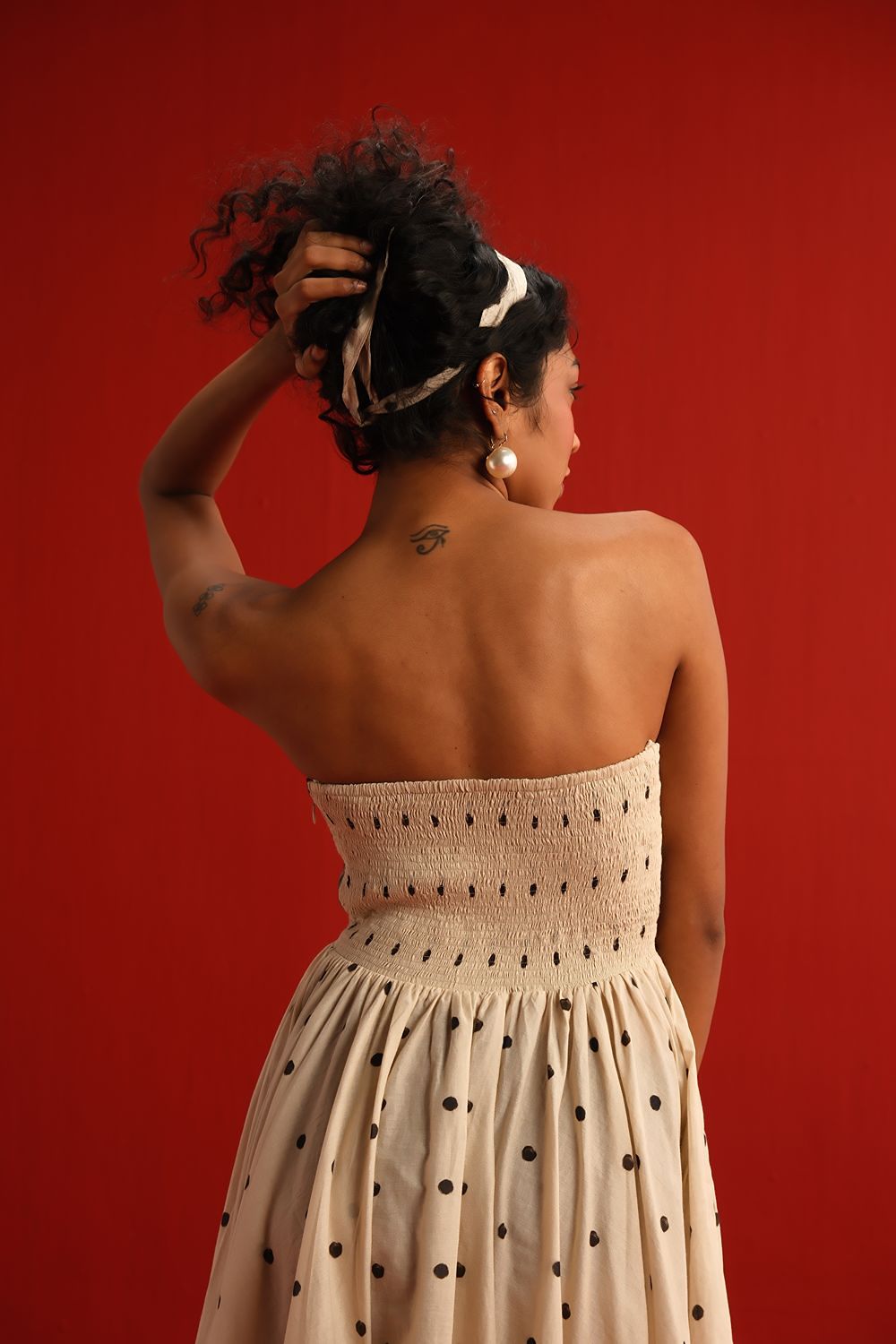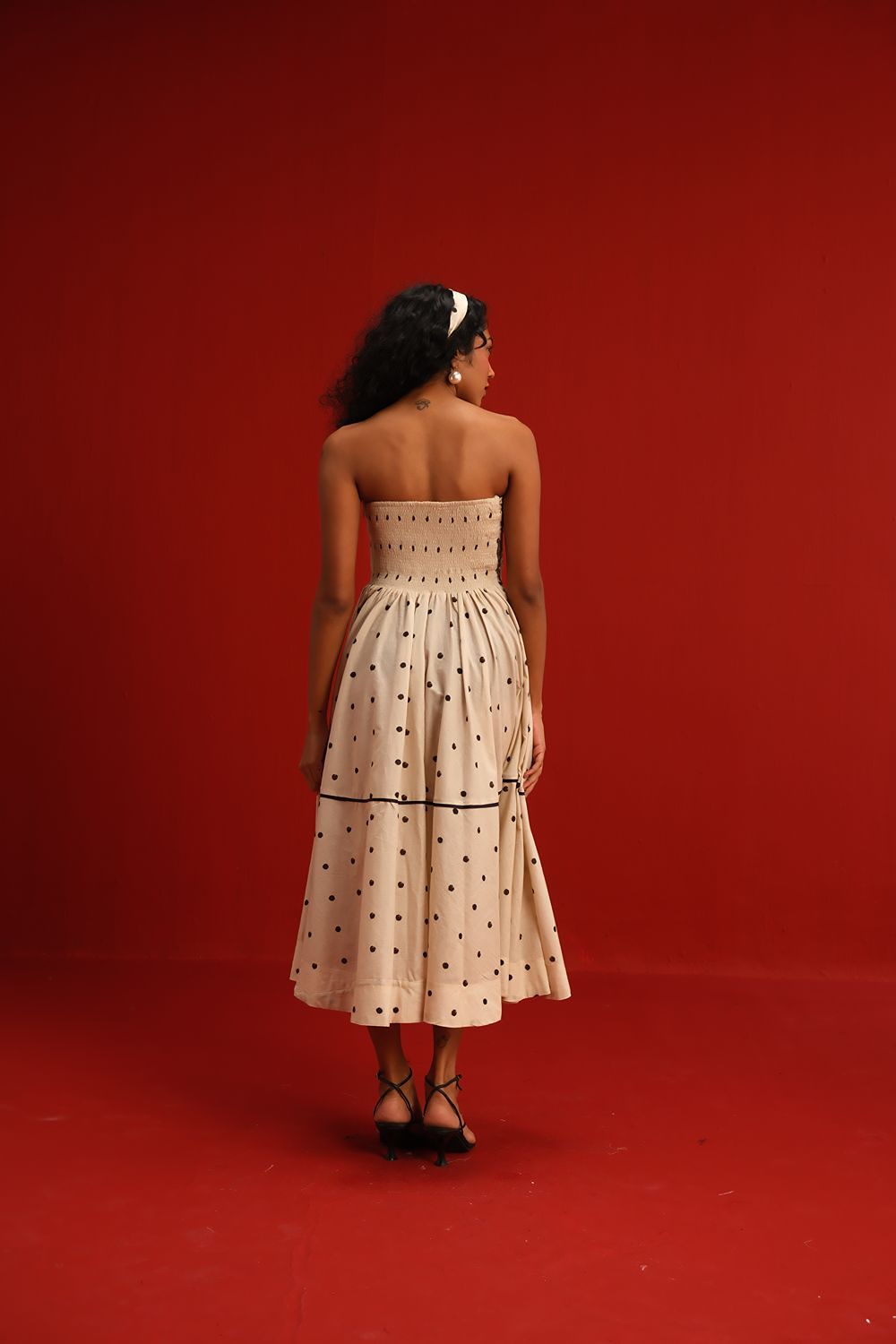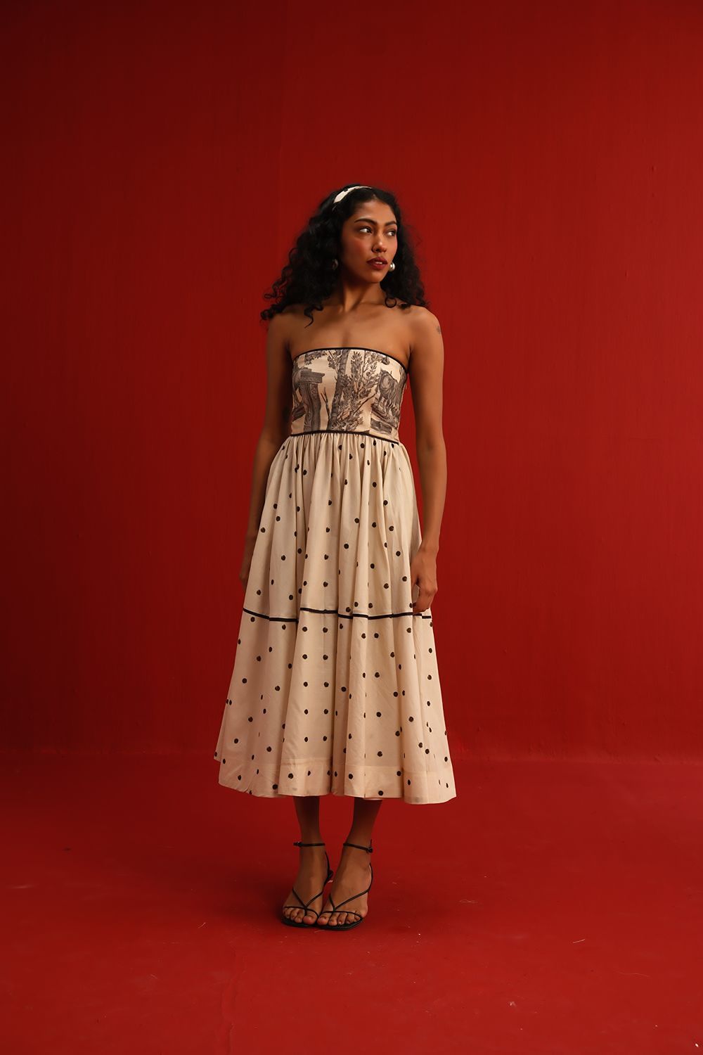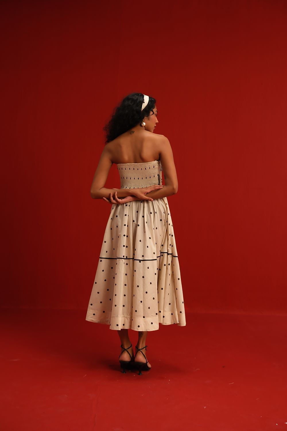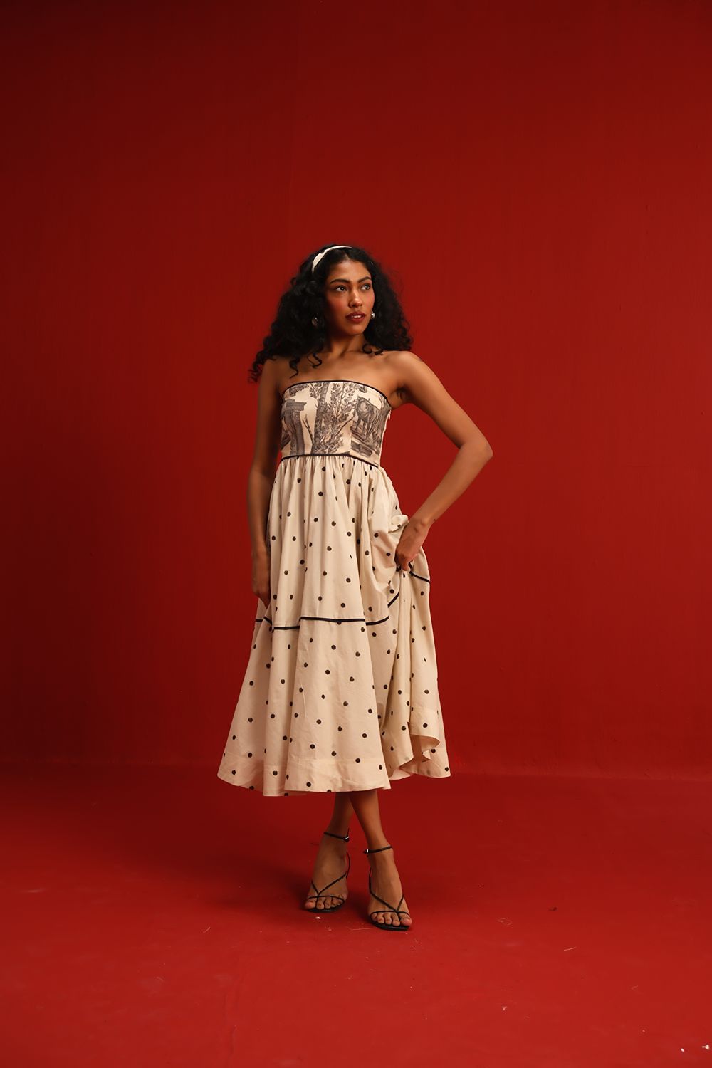 Color: Ivory base with black polka dots and vintage brown-toned bodice