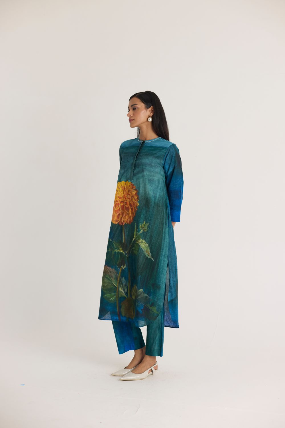 A sophisticated kurta set featuring a mesmerizing deep teal base, reminiscent of watercolor brushstrokes. The highlight of the design is a striking, oversized floral print of a golden dahlia, adding a bold yet elegant touch. The relaxed silhouette, round neckline, and delicate buttoned placket enhance the effortless charm of this piece.