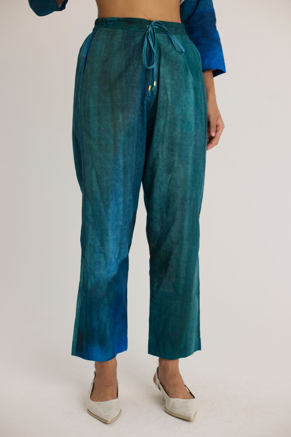 Rich teal-toned fabric with an artistic hand-painted effect