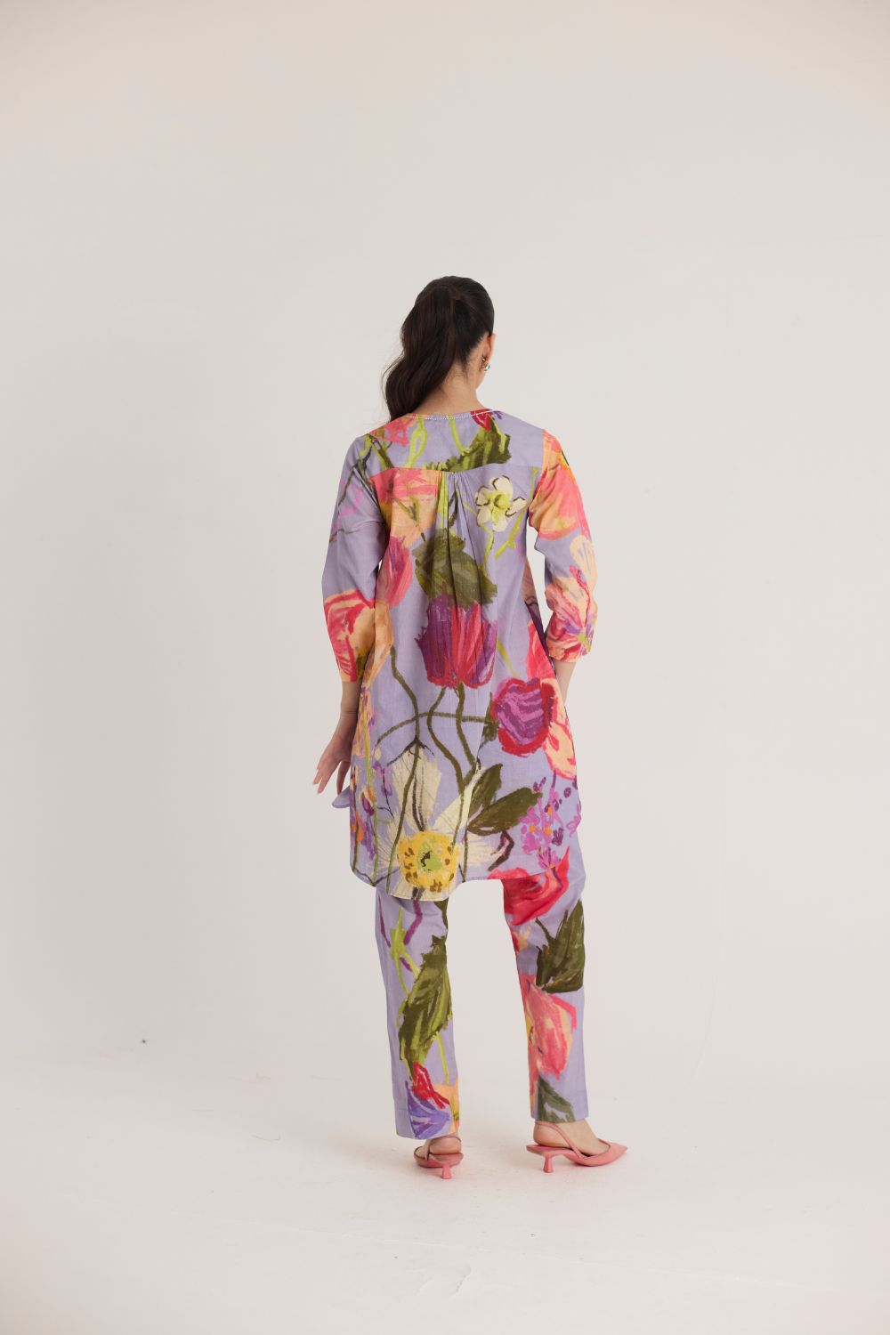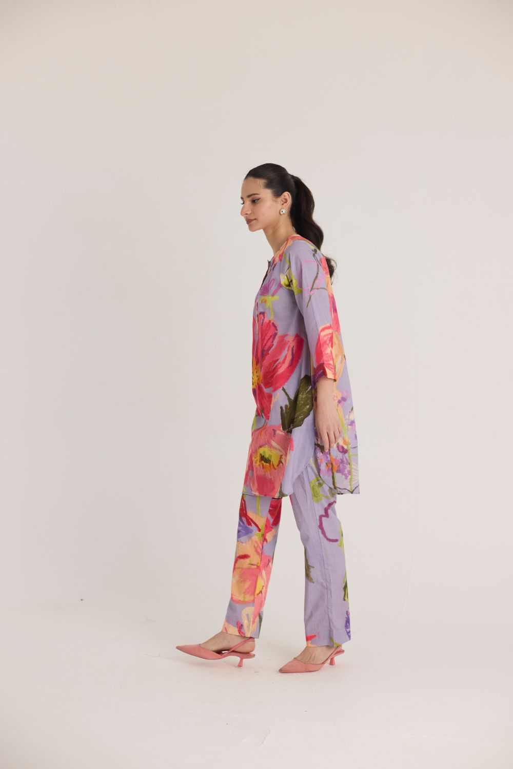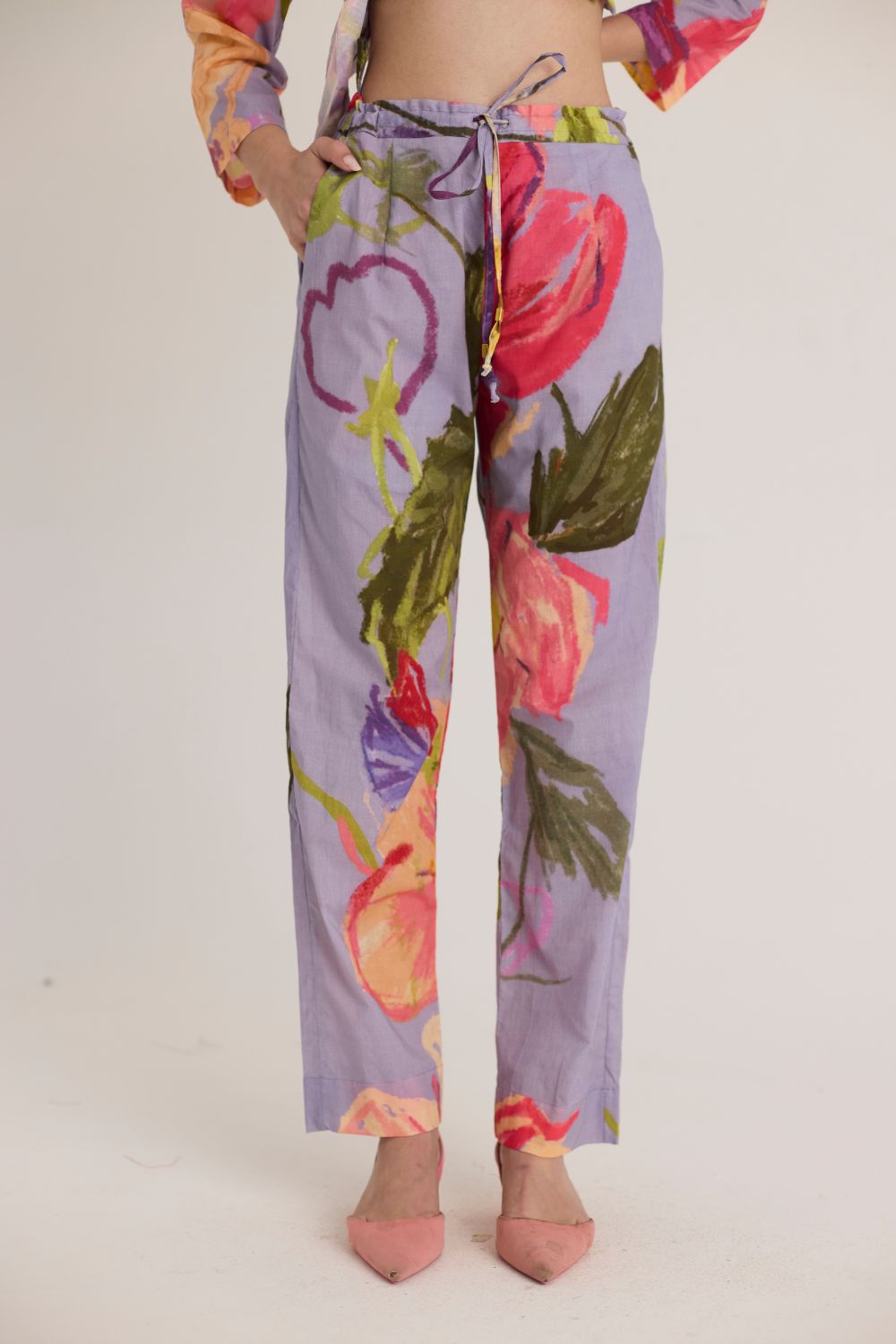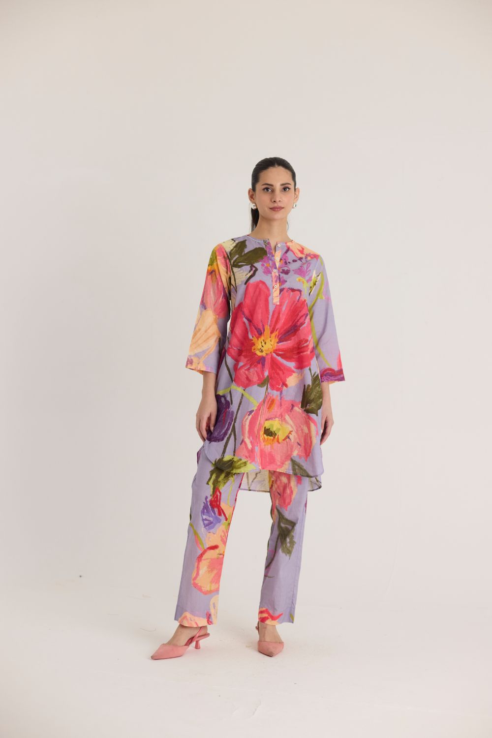 A vibrant hand-painted floral print inspired by lush spring gardens. This design features bold, oversized blossoms in striking hues of red, orange, and pink, beautifully set against a soft lavender base. The artistic brushstroke effect adds a painterly charm, making it a statement piece for any wardrobe.