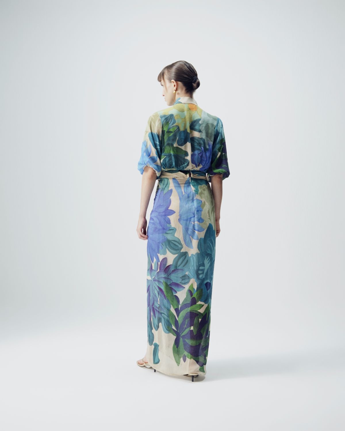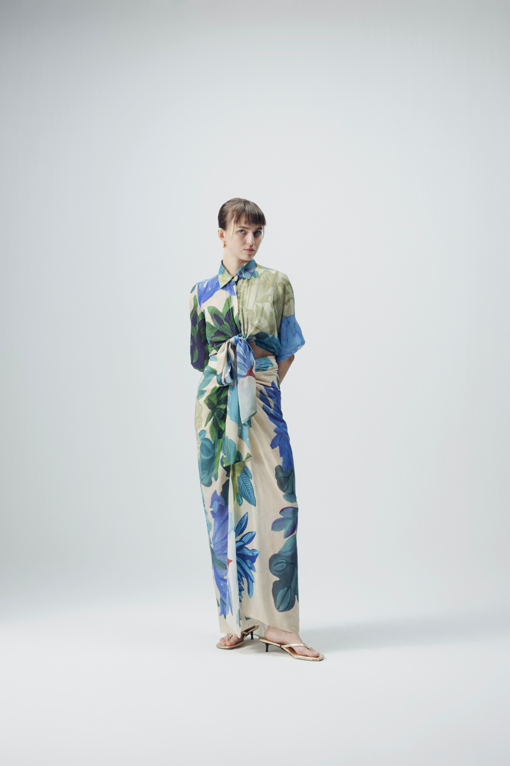 This striking set redefines contemporary resort wear with its effortless silhouette and bold botanical artwork. The set features a lightweight printed shirt with a classic collar and relaxed sleeves, styled here in a knotted fashion for a modern, youthful edge. Paired with a fluid printed drape skirt that sits beautifully on the body, the ensemble offers movement, comfort, and elevated casual elegance. Perfect for vacations, beachside evenings, brunch outings, or statement summer dressing.