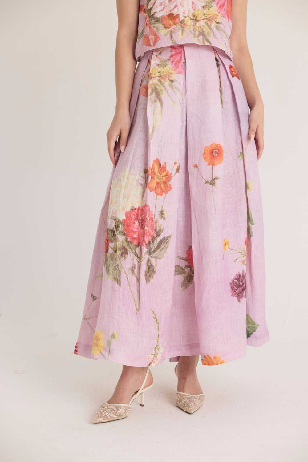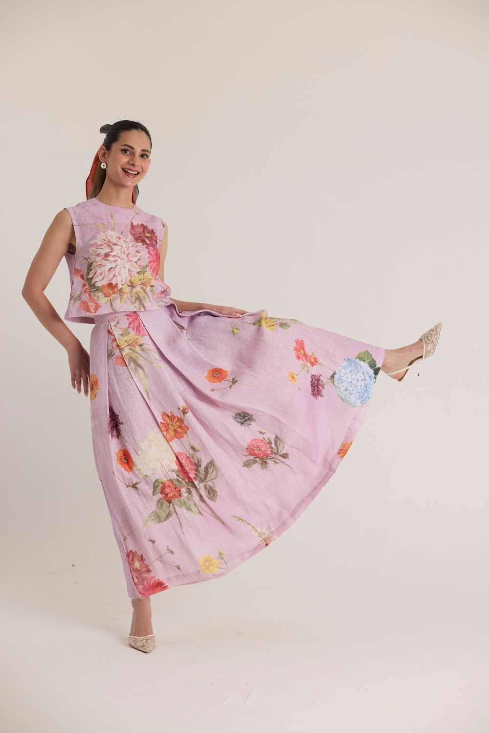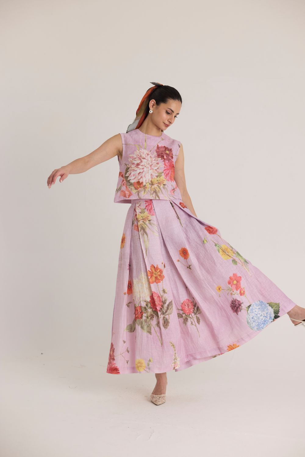 The skirt & top features a captivating floral print that brings nature to life. Featuring an array of vibrant blossoms, including hydrangeas, marigolds, and chrysanthemums, the print is a harmonious mix of bold and delicate flowers. The placement of blooms gives an organic, hand-painted feel, making the dress both artistic and elegant.