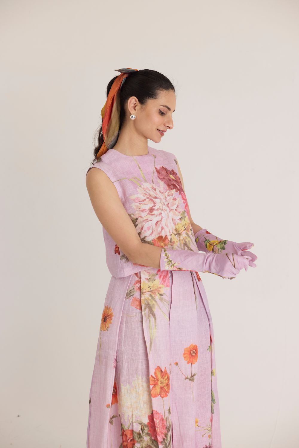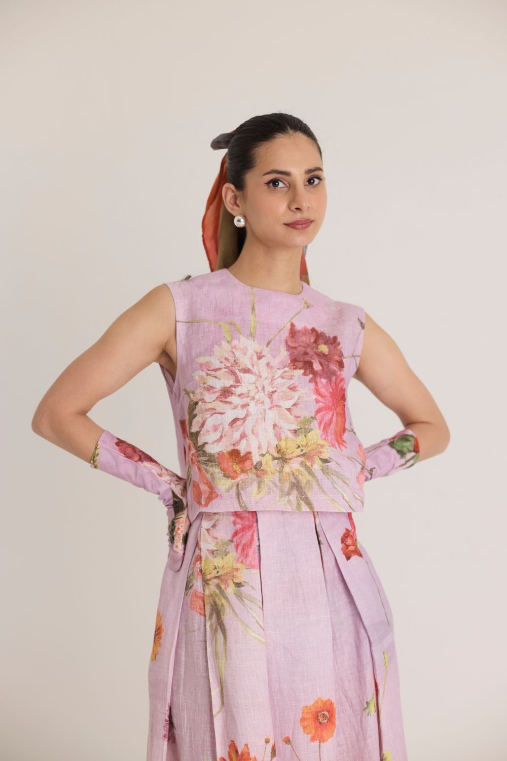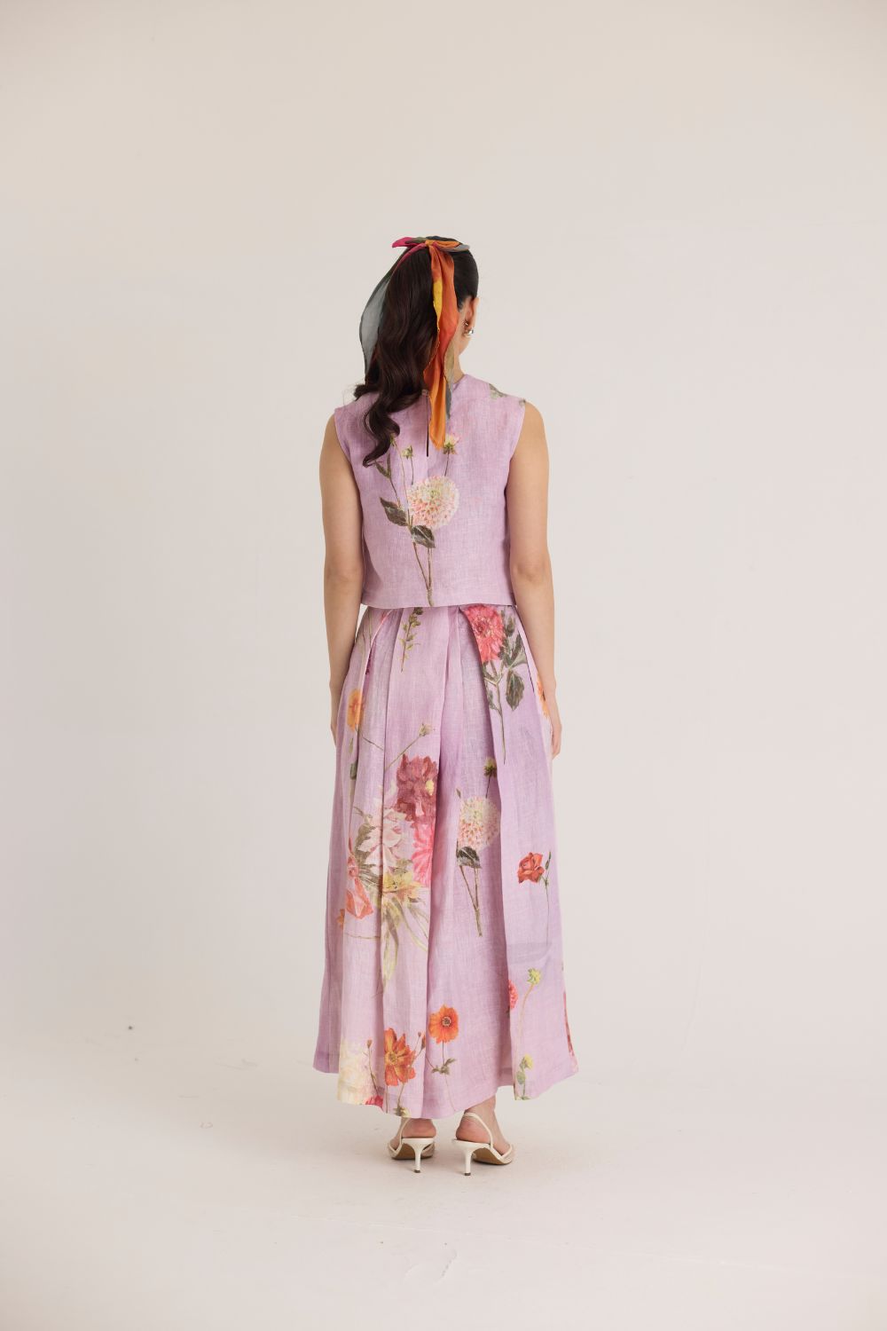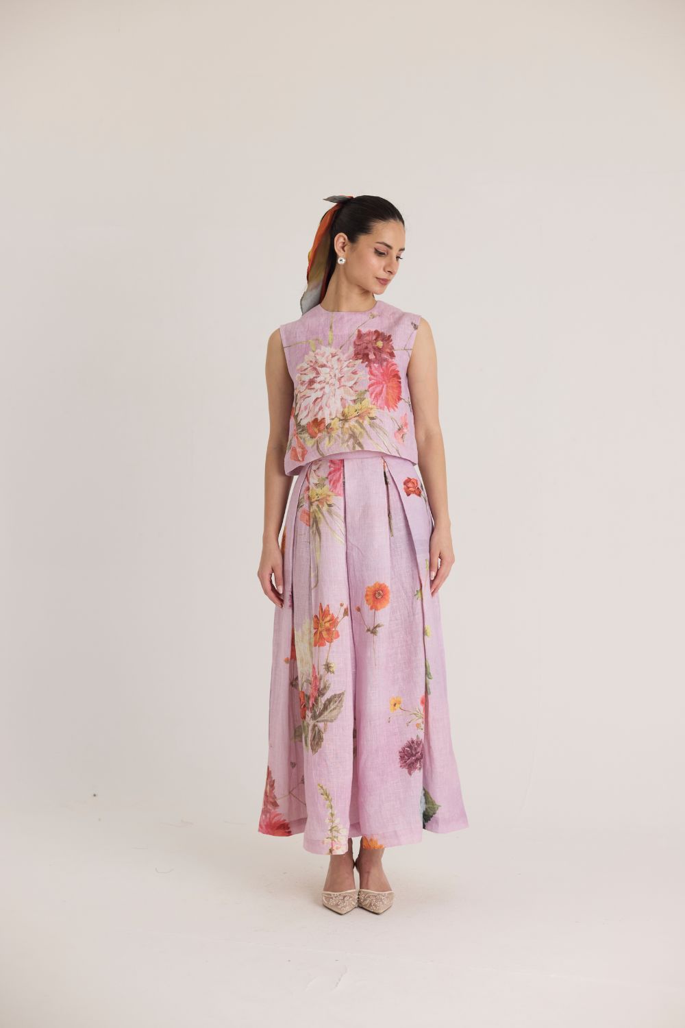 The skirt & top features a captivating floral print that brings nature to life. Featuring an array of vibrant blossoms, including hydrangeas, marigolds, and chrysanthemums, the print is a harmonious mix of bold and delicate flowers. The placement of blooms gives an organic, hand-painted feel, making the dress both artistic and elegant.
