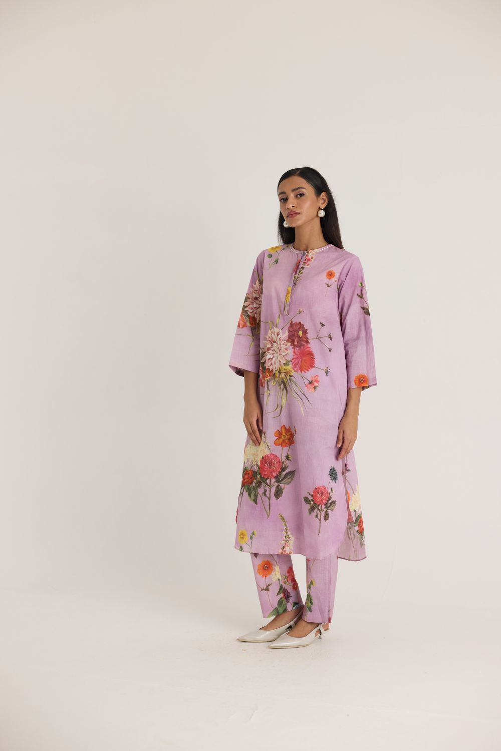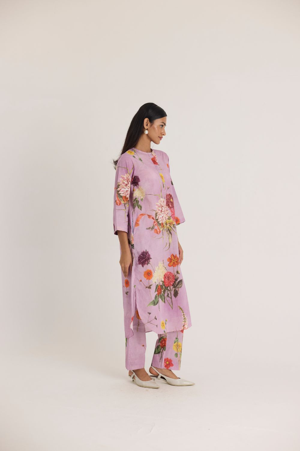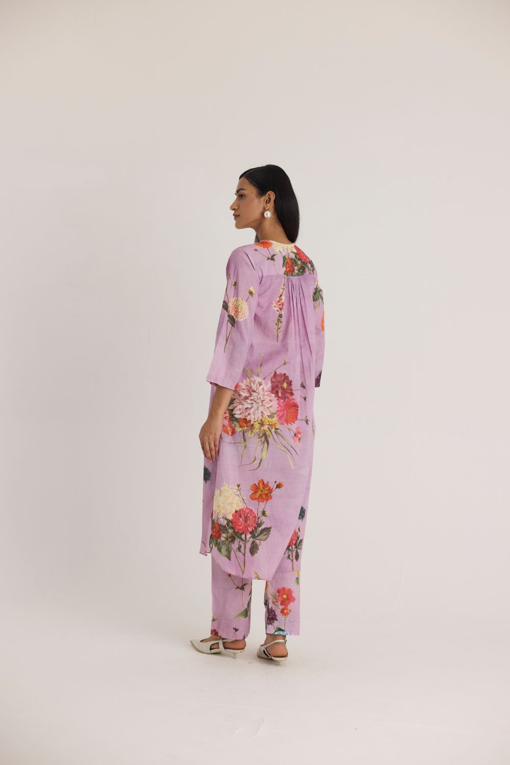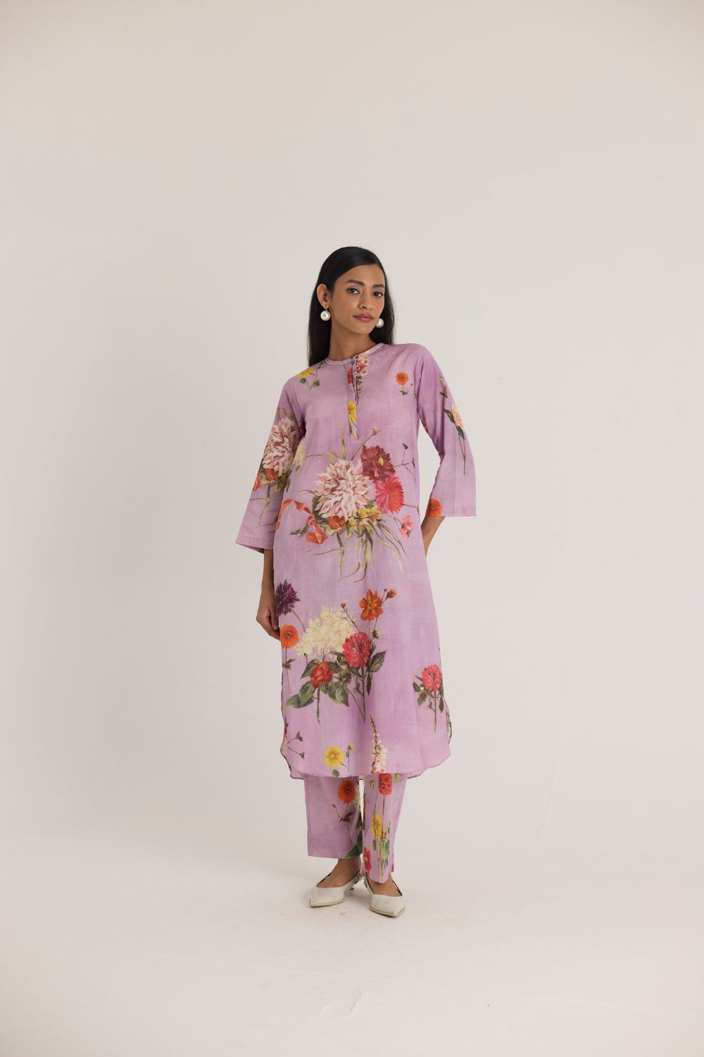This flowy kurta set features a captivating floral print that brings nature to life. Featuring an array of vibrant blossoms, including hydrangeas, marigolds, and chrysanthemums, the print is a harmonious mix of bold and delicate flowers. The placement of blooms gives an organic, hand-painted feel, making the dress both artistic and elegant.