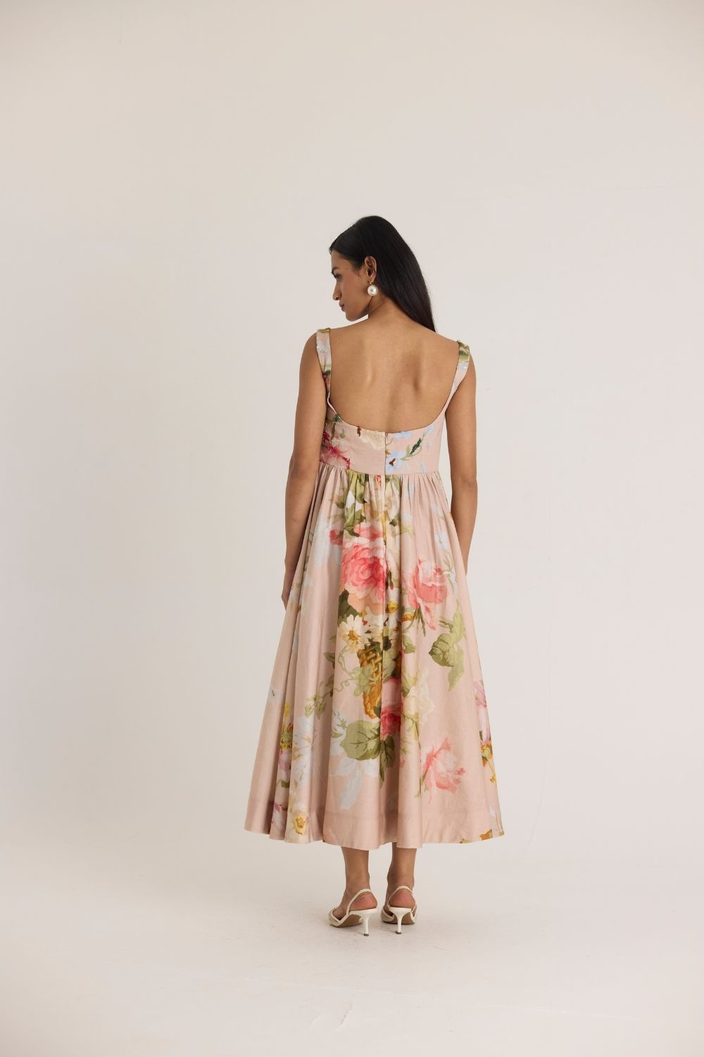The delicately embroidered bodice adds a touch of artisanal craftsmanship, elevating the beauty of its floral print. Designed with a soft, rounded neckline and broad straps, the fitted bodice gracefully transitions into a voluminous skirt, creating a flattering silhouette. The intricate floral print in soft blush, pink, and green hues adds a touch of romantic charm, making it the perfect piece for garden parties, brunches, or summer soirées.