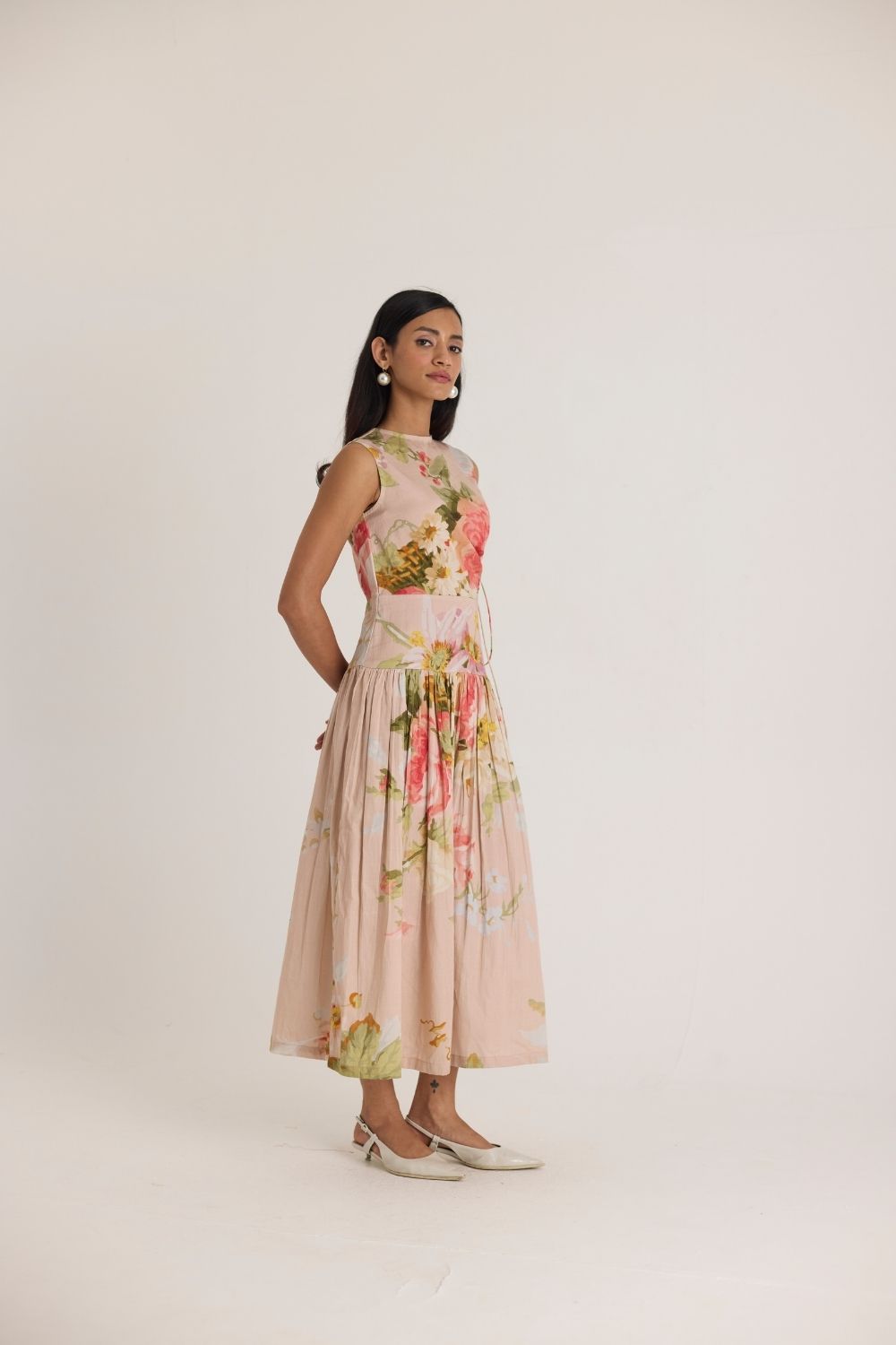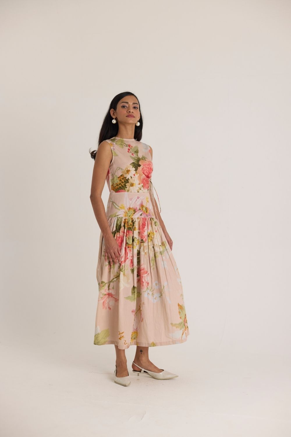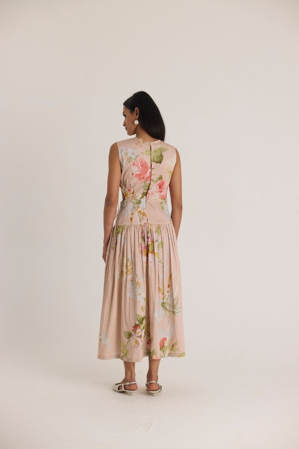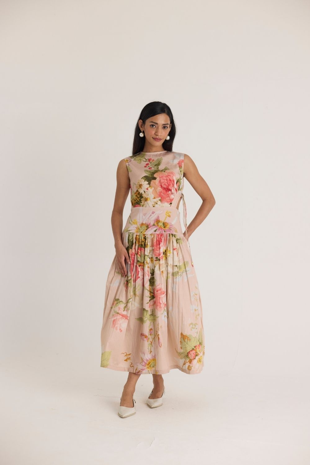 A dreamy sleeveless midi dress adorned with delicate floral prints in soft pink, peach, and green hues. The romantic watercolor-style print is set against a blush-toned fabric, creating an ethereal, feminine aesthetic. Thoughtfully designed with subtle side cutouts and lace-up detailing for a modern touch, the dress features a gathered waist that flows into a fluid, pleated skirt for effortless movement.