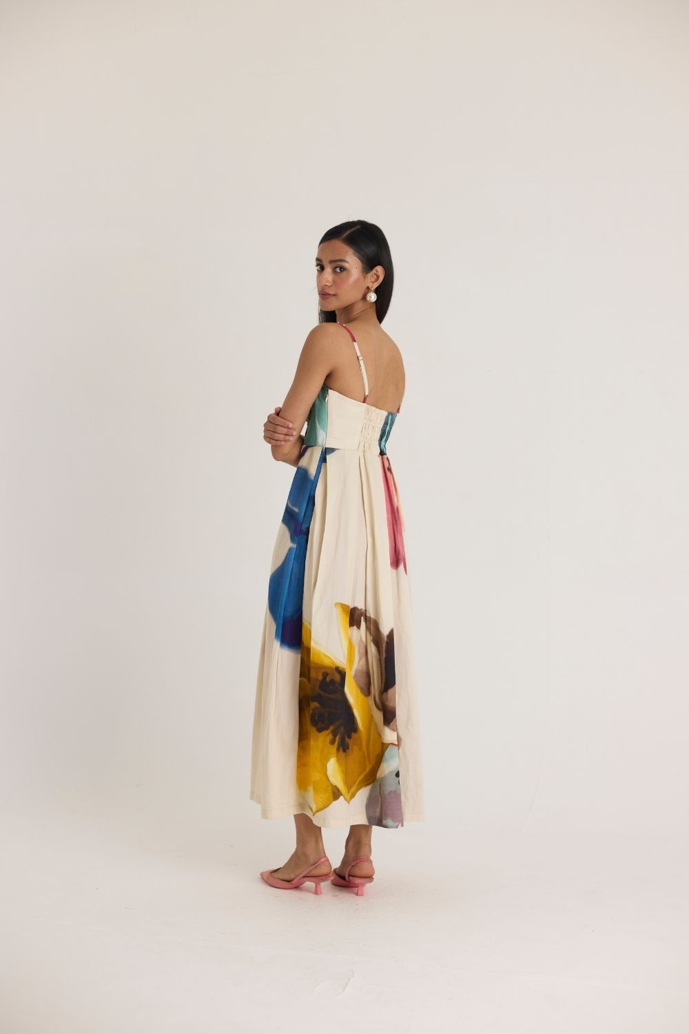 Pair with colorful heels to enhance the vibrant hues of the dress and opt for minimal jewelry to let the embellished bodice take center stage.