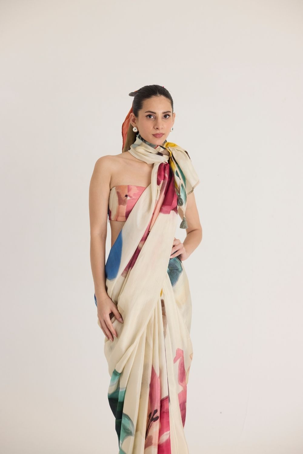 Enhance the look with pearl or gold-tone jewelry and delicate heels. Opt for soft waves or a sleek bun to complement the saree’s ethereal charm.