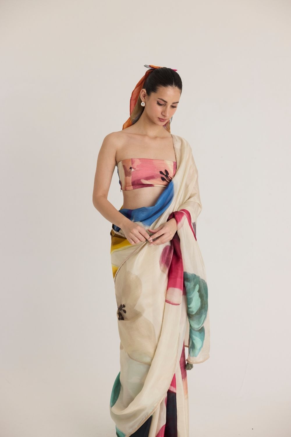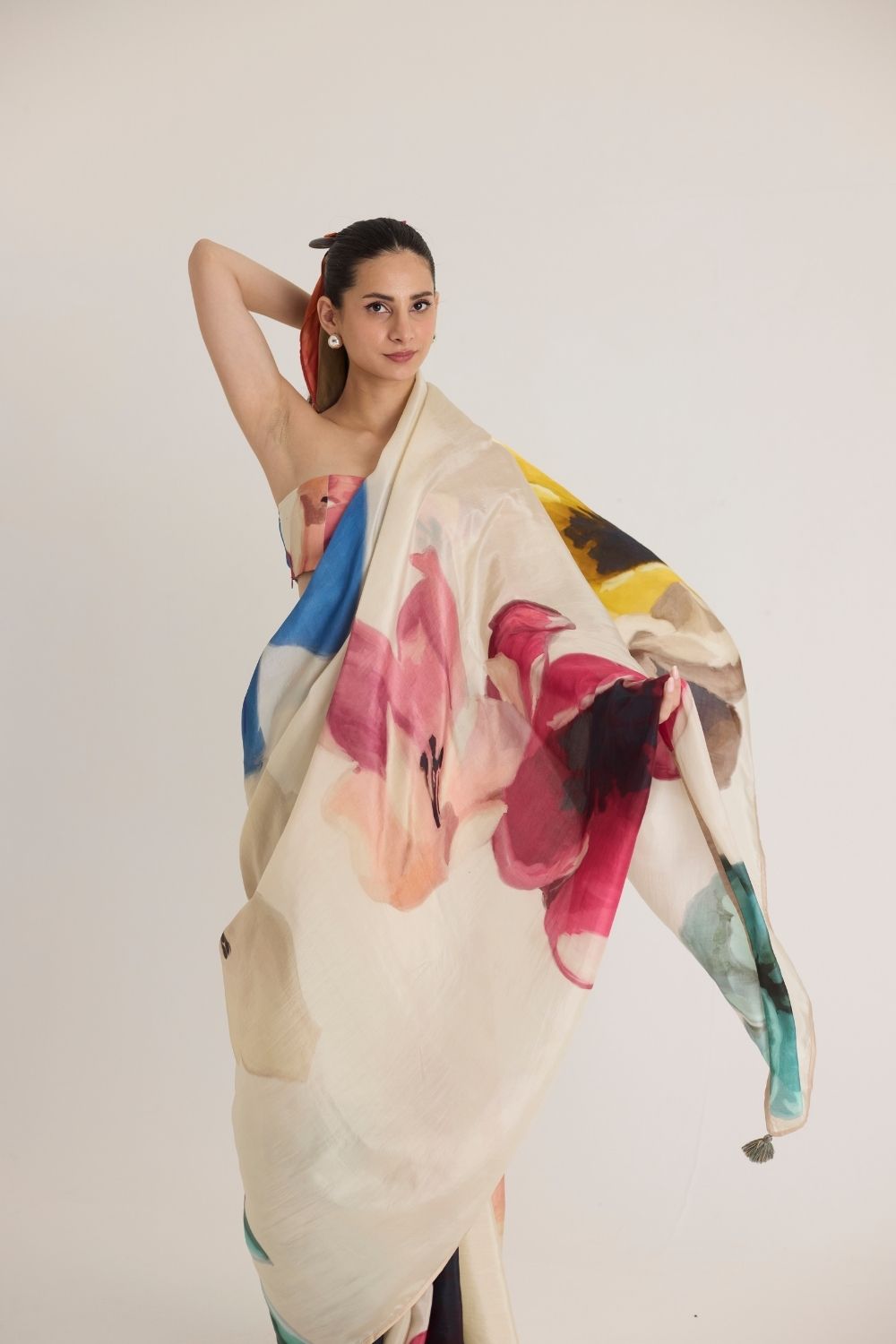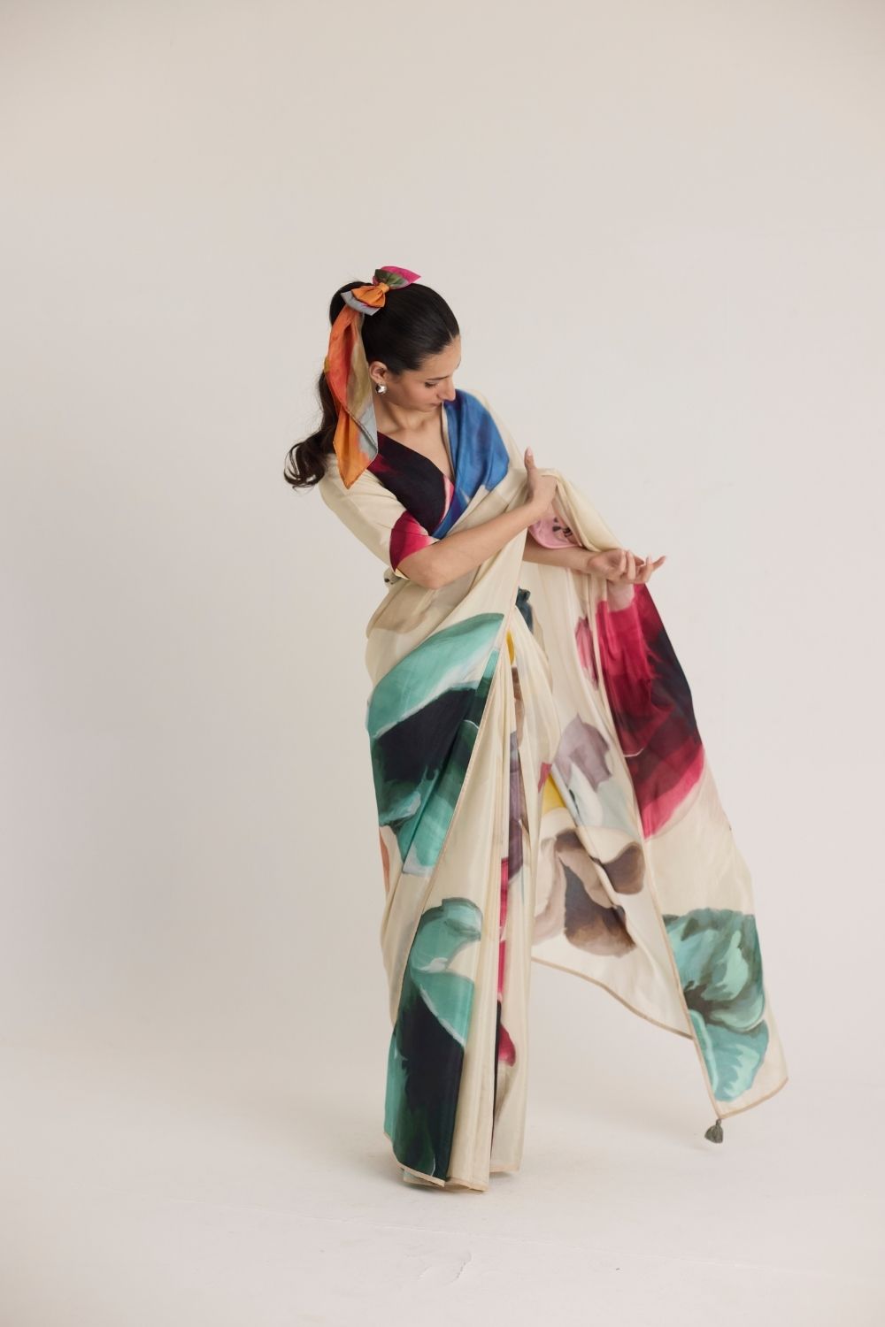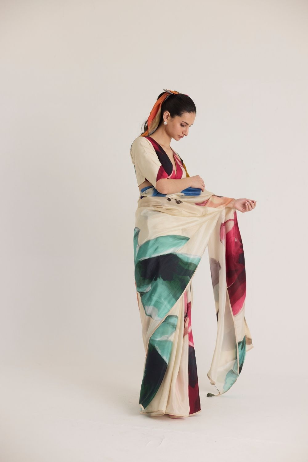 A breathtaking abstract floral print, this saree is a work of art inspired by bold brushstrokes and fluid forms. The oversized watercolor blooms in rich jewel tones of emerald green, deep red, and midnight black contrast beautifully against the soft beige base. This print exudes an effortless charm, perfect for modern elegance with an artistic touch. Key Feature: