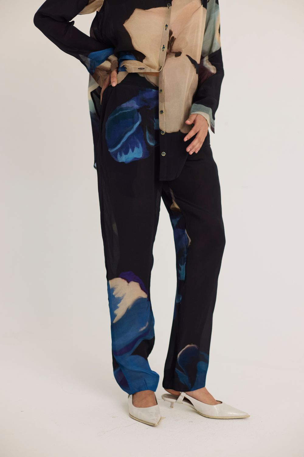 Elevate your wardrobe with this floral-printed co-ord set, featuring an oversized button-down shirt and relaxed-fit pants. Crafted from a lightweight fabric, this set showcases a bold abstract floral print in deep hues of black, blue, and beige, adding a touch of artistic elegance to your ensemble.