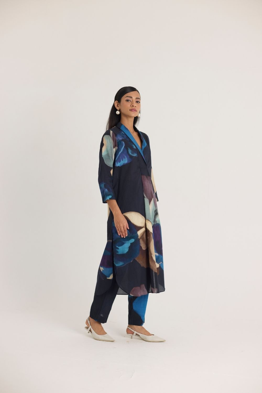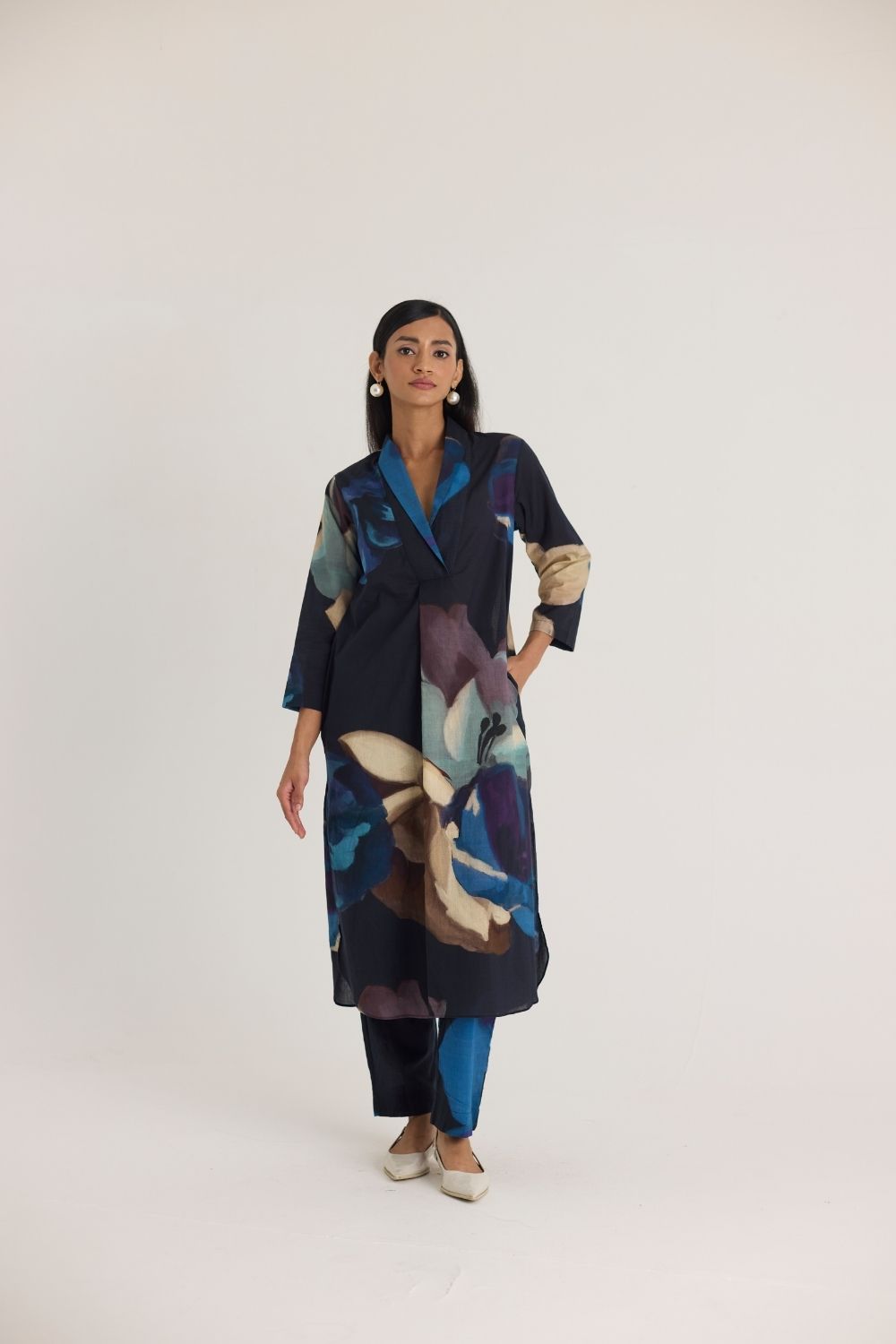 Make a statement with this effortlessly elegant long dress featuring a bold oversized floral print in deep blue, beige, and purple hues. The relaxed silhouette, shawl colllar-neckline, and three-quarter sleeves lend a contemporary yet timeless feel. The subtle contrast piping at the neckline adds a refined touch.