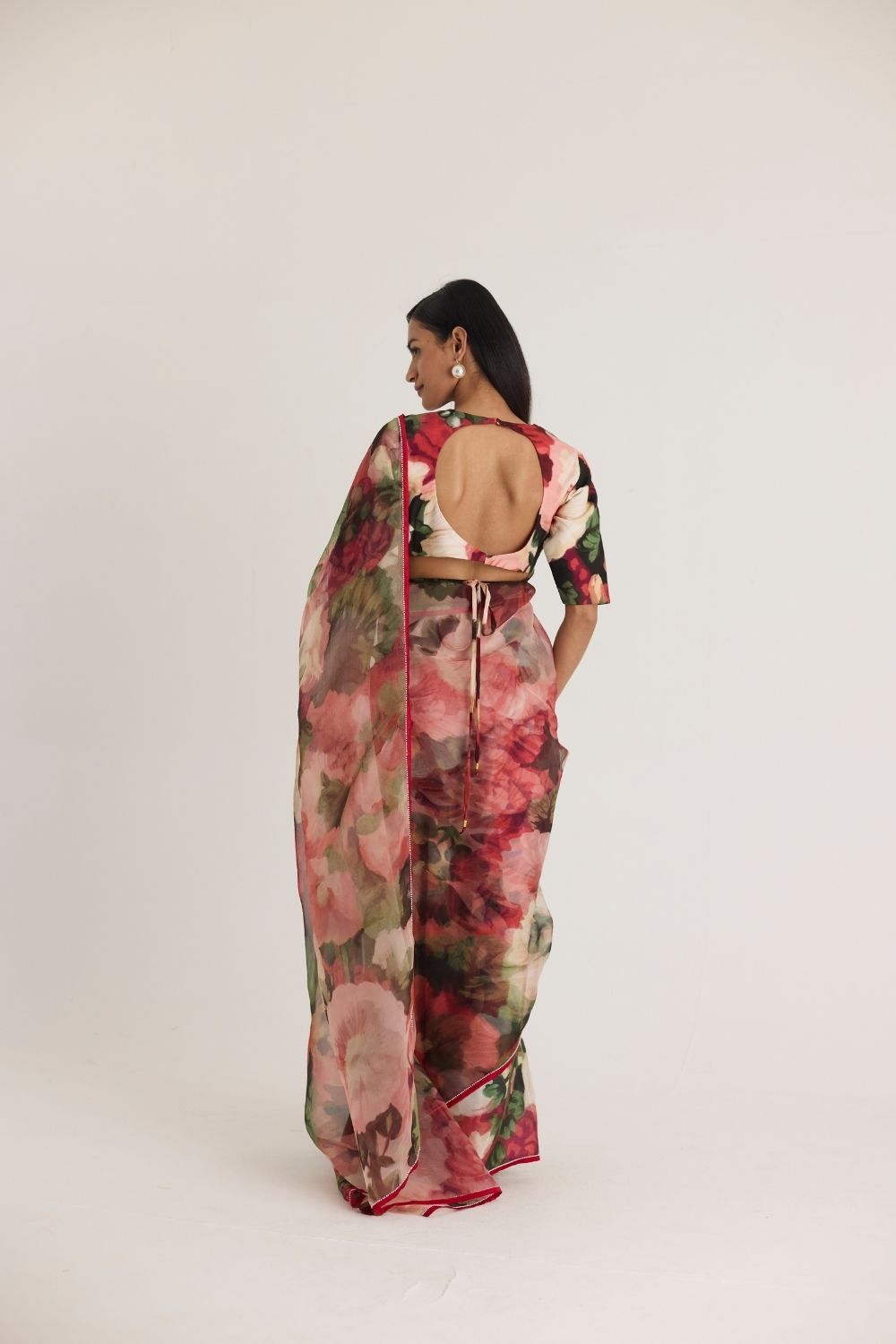 This statement floral print blouse is a modern take on traditional elegance. Designed with a deep V-neckline at the front and a bold open-back cut, it offers a striking balance of sophistication and allure. The vibrant rose-inspired print in red, pink, and green adds a fresh, romantic charm to any ensemble. Finished with tie-up detailing at the back for a secure yet stylish fit, this blouse is a versatile piece that complements both sarees and lehengas.