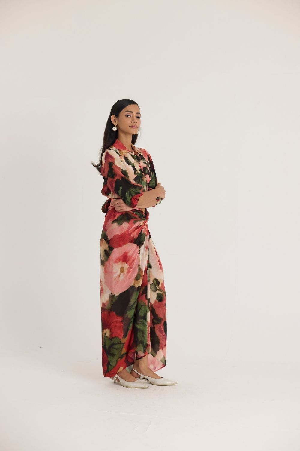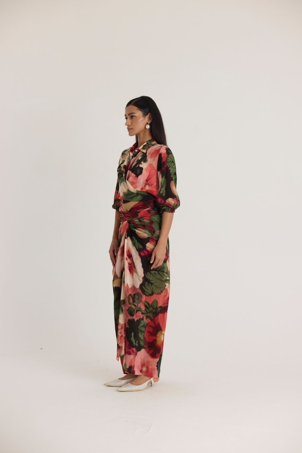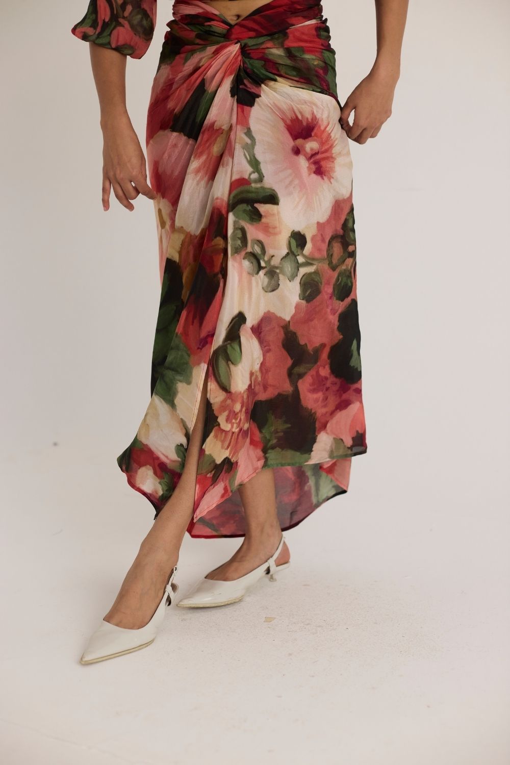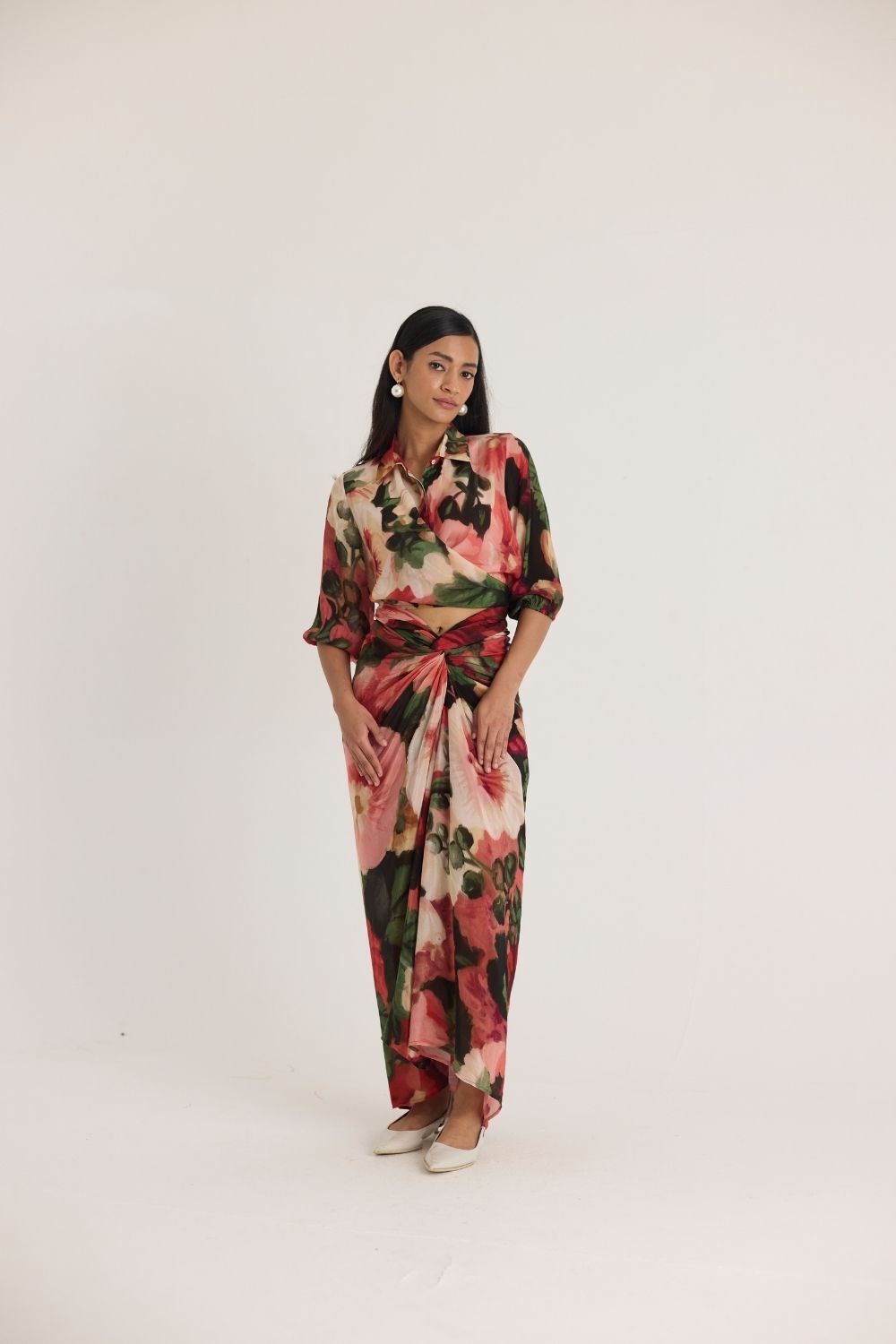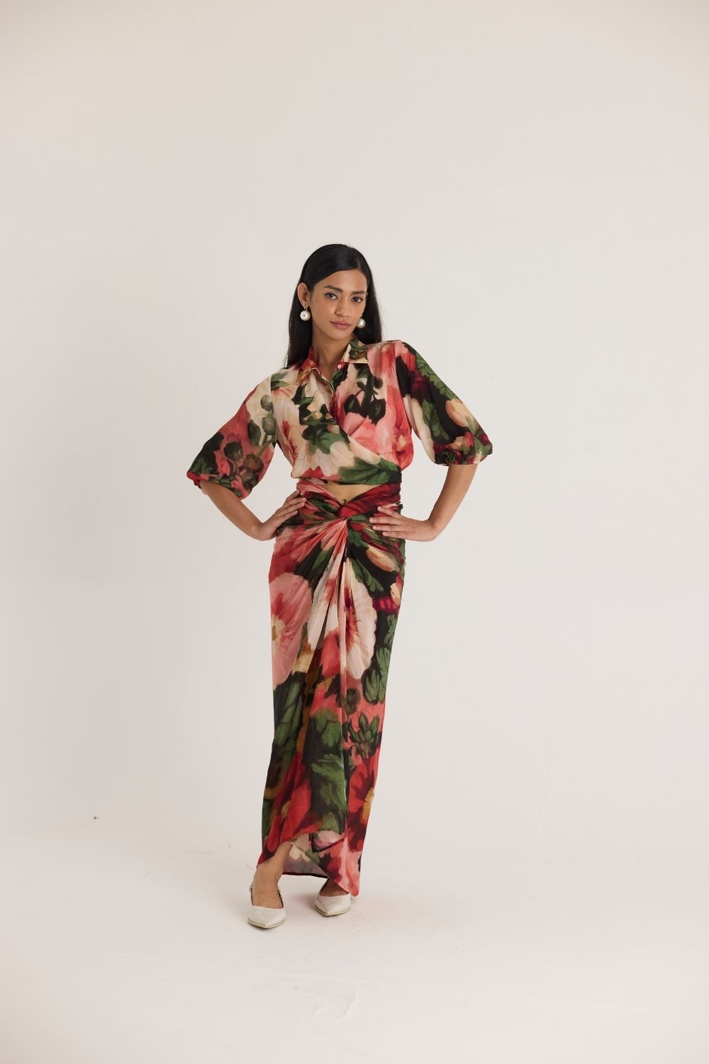A sophisticated two-piece ensemble featuring a wrap-style cropped blouse with voluminous sleeves and a high-waisted draped skirt. The ensemble is adorned with an oversized floral print in rich hues of red, green, and blush, creating a bold yet elegant statement.