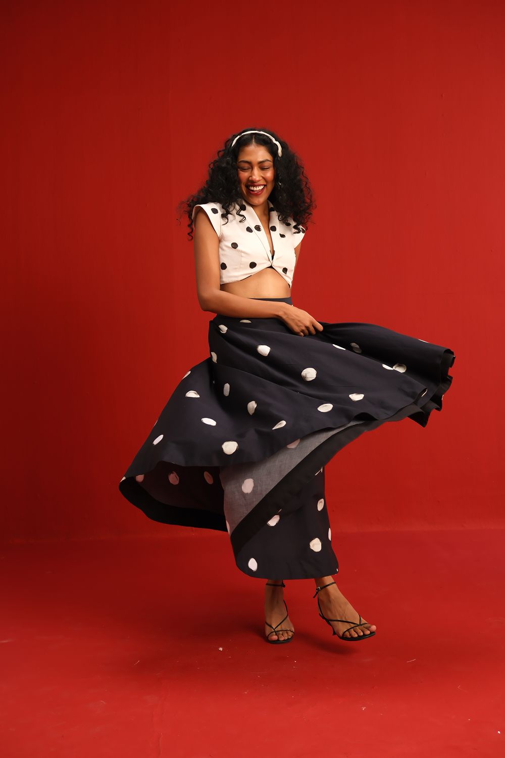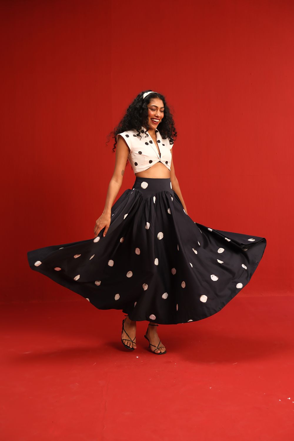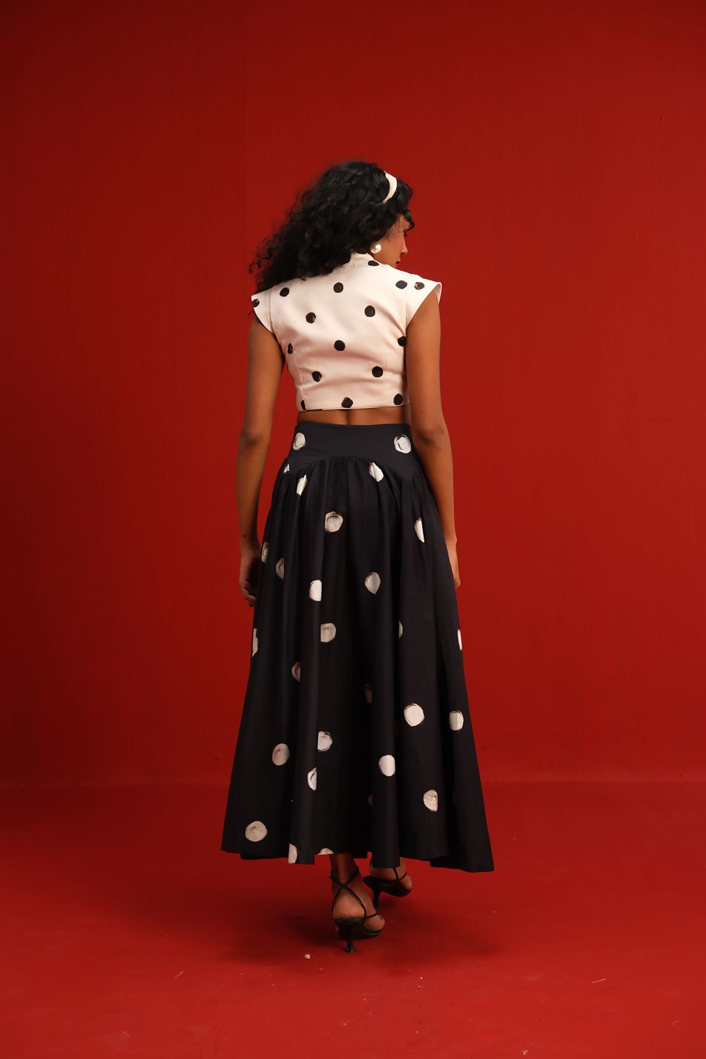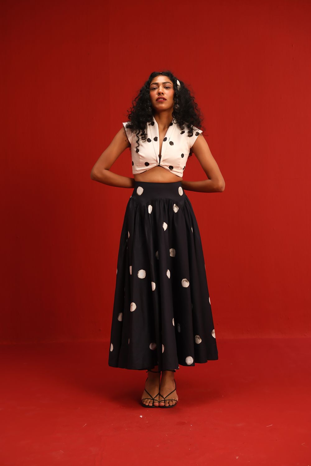 Featuring a crisp ivory cropped top with bold black polka dots and a twist-front neckline, this look is perfectly balanced by a voluminous black skirt adorned with oversized ivory dots. The playful contrast in color and dot size creates a bold, graphic statement—perfect for the fashion enthusiast who loves to blend classic with contemporary.