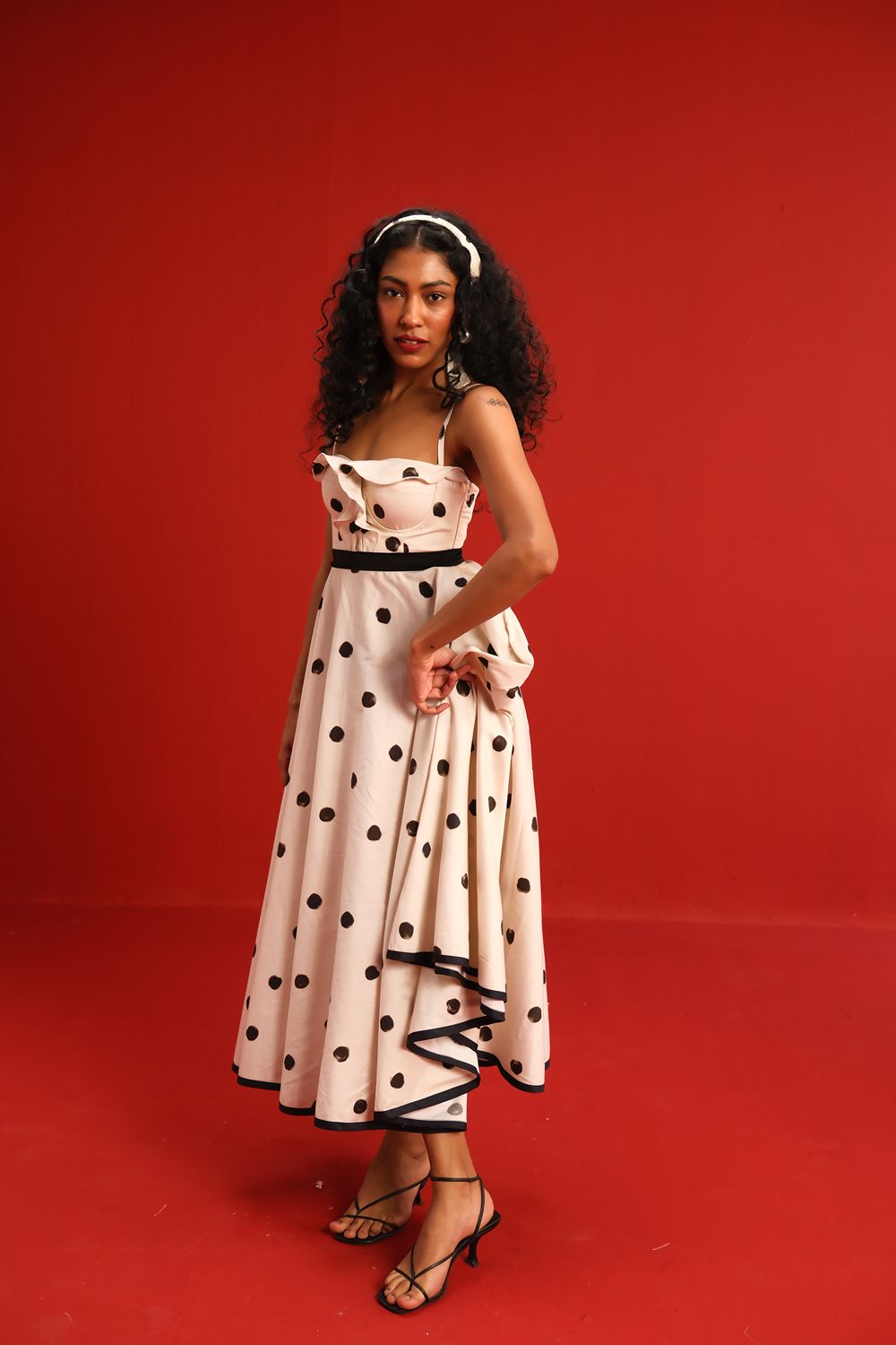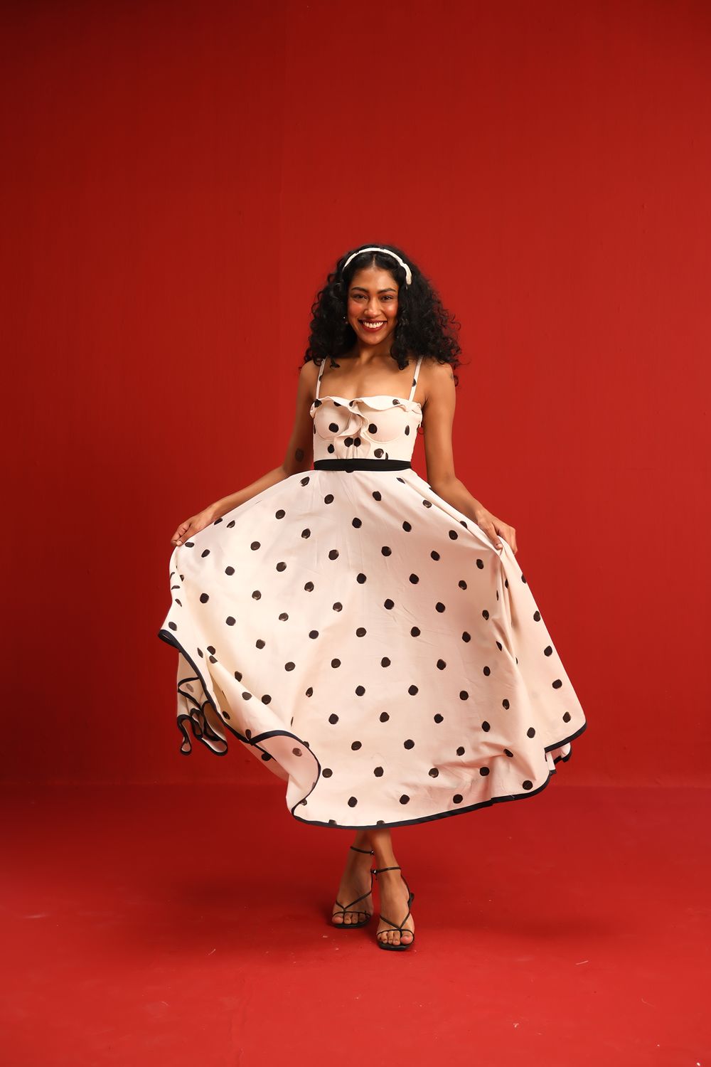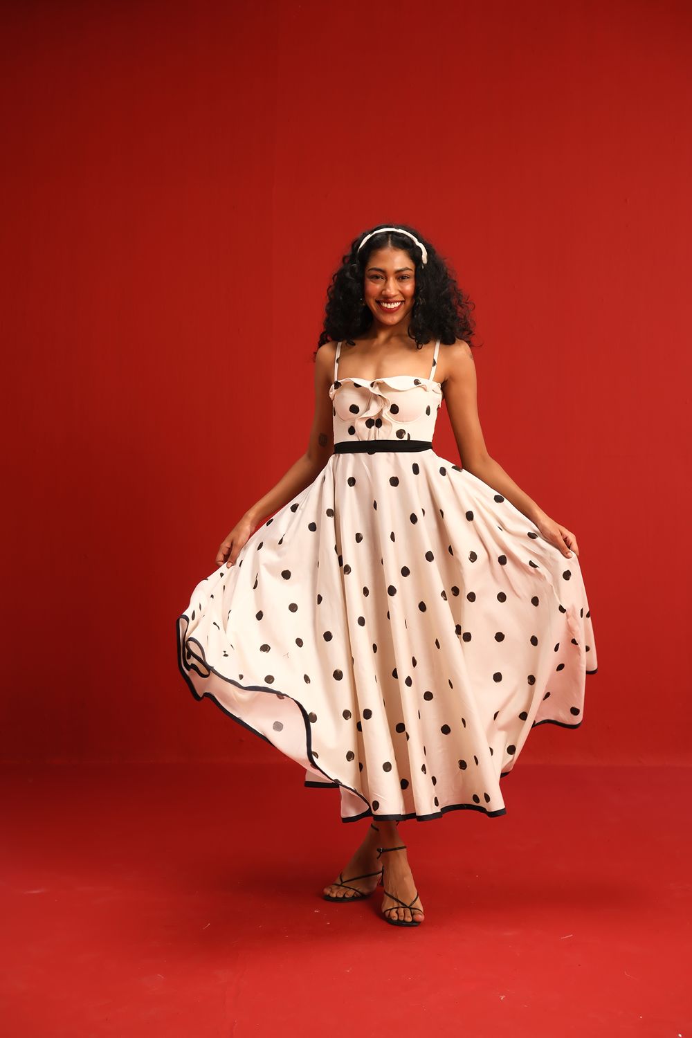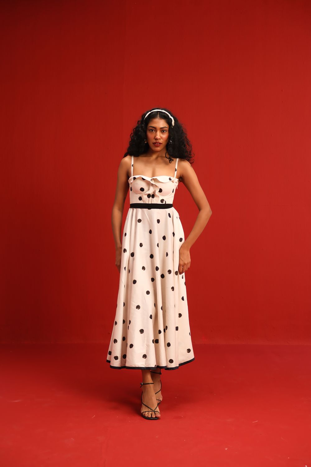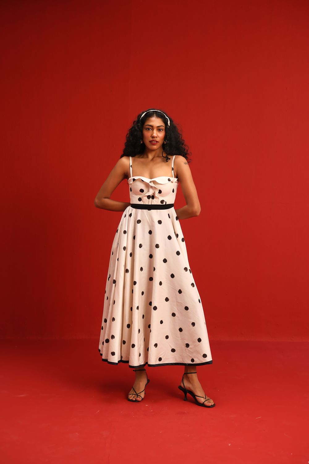 Designed in a soft ivory hue sprinkled with bold black polka dots, this midi dress features a sweetheart neckline with delicate ruffle detail, slim shoulder straps, and a cinched black waistband that flatters the figure. The full circle skirt and black piping at the hemline add graceful movement and structured elegance—perfect for sunlit days or moonlit dancing.