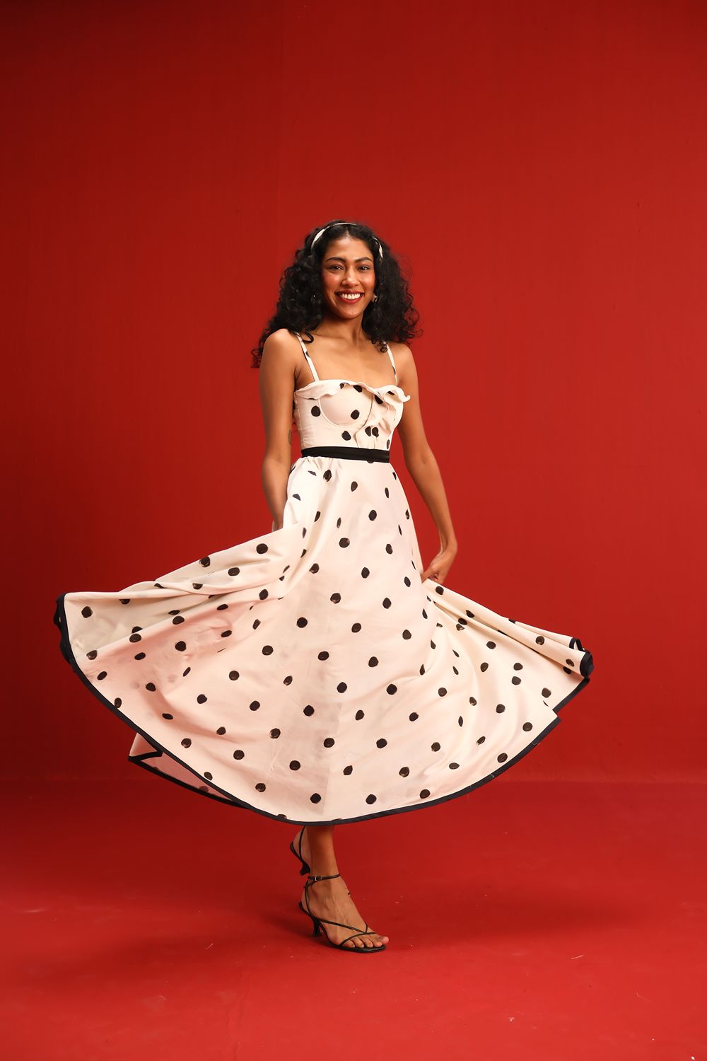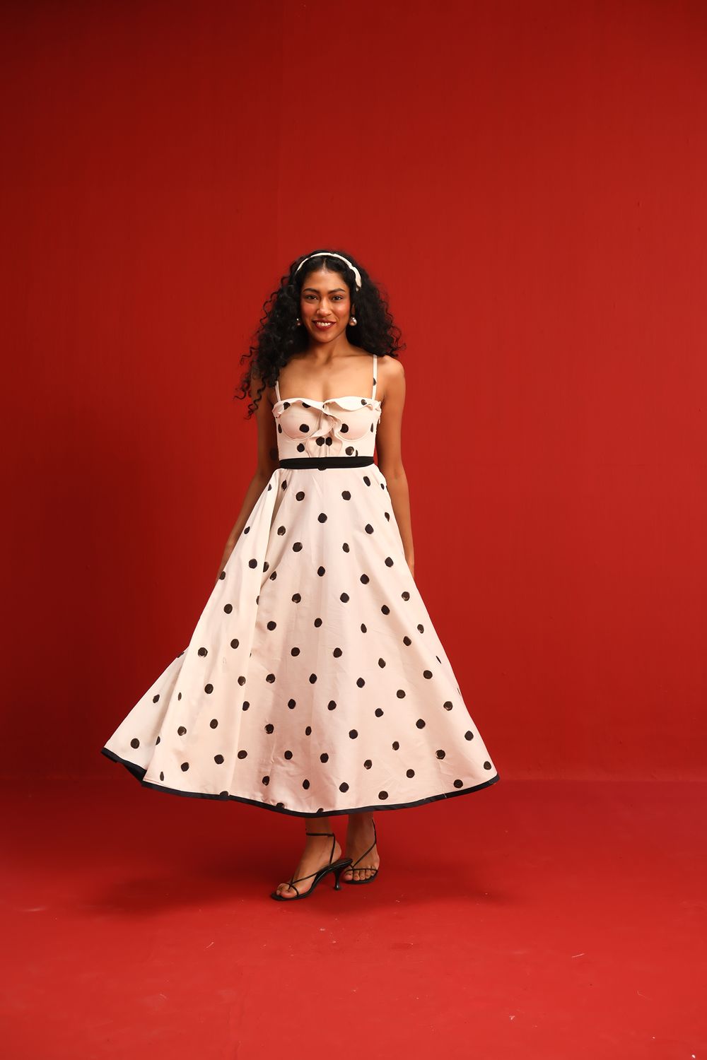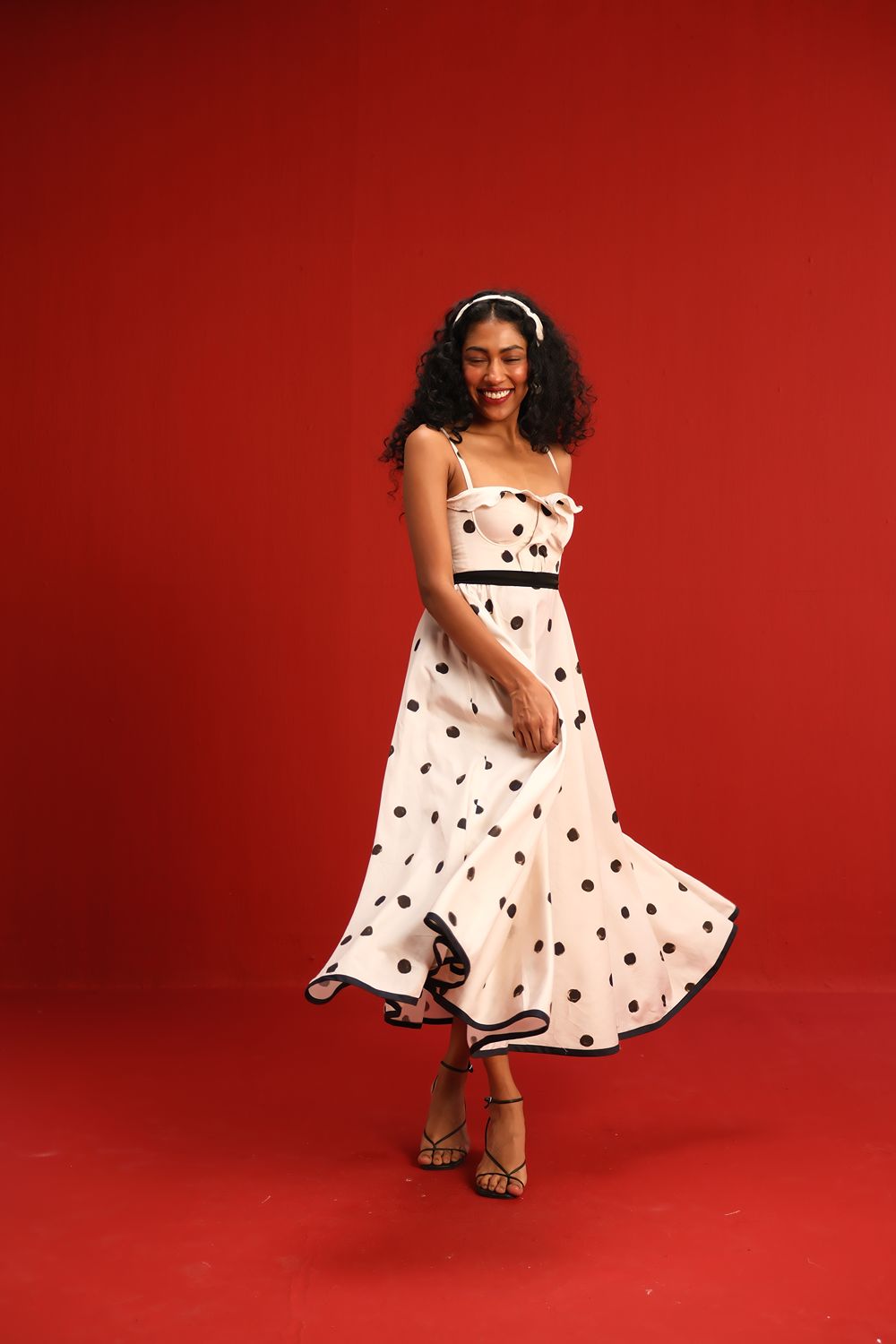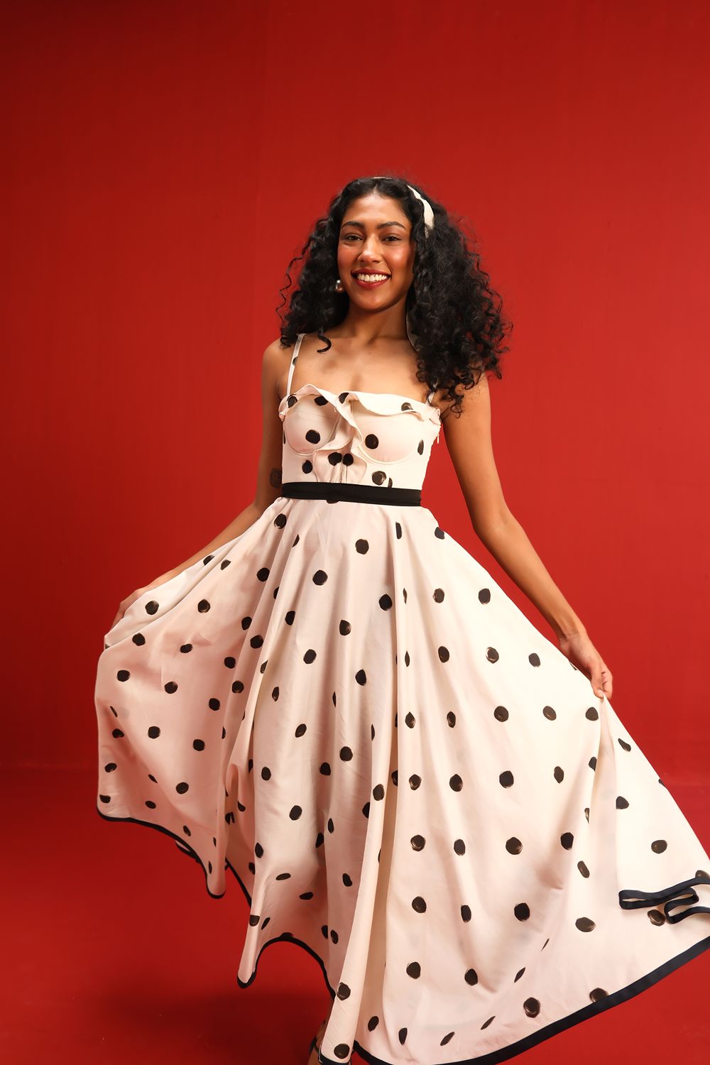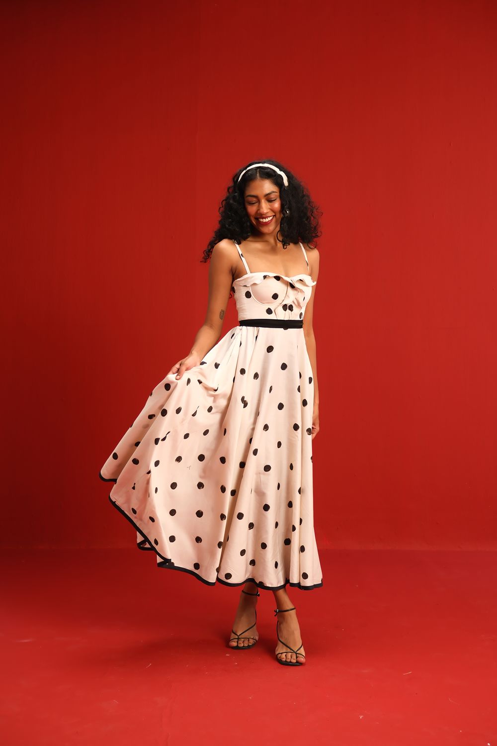 Designed in a soft ivory hue sprinkled with bold black polka dots, this midi dress features a sweetheart neckline with delicate ruffle detail, slim shoulder straps, and a cinched black waistband that flatters the figure. The full circle skirt and black piping at the hemline add graceful movement and structured elegance—perfect for sunlit days or moonlit dancing.