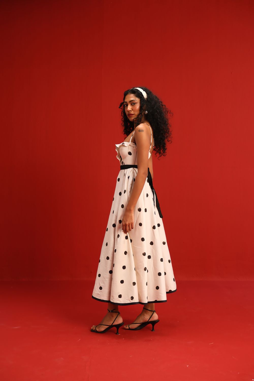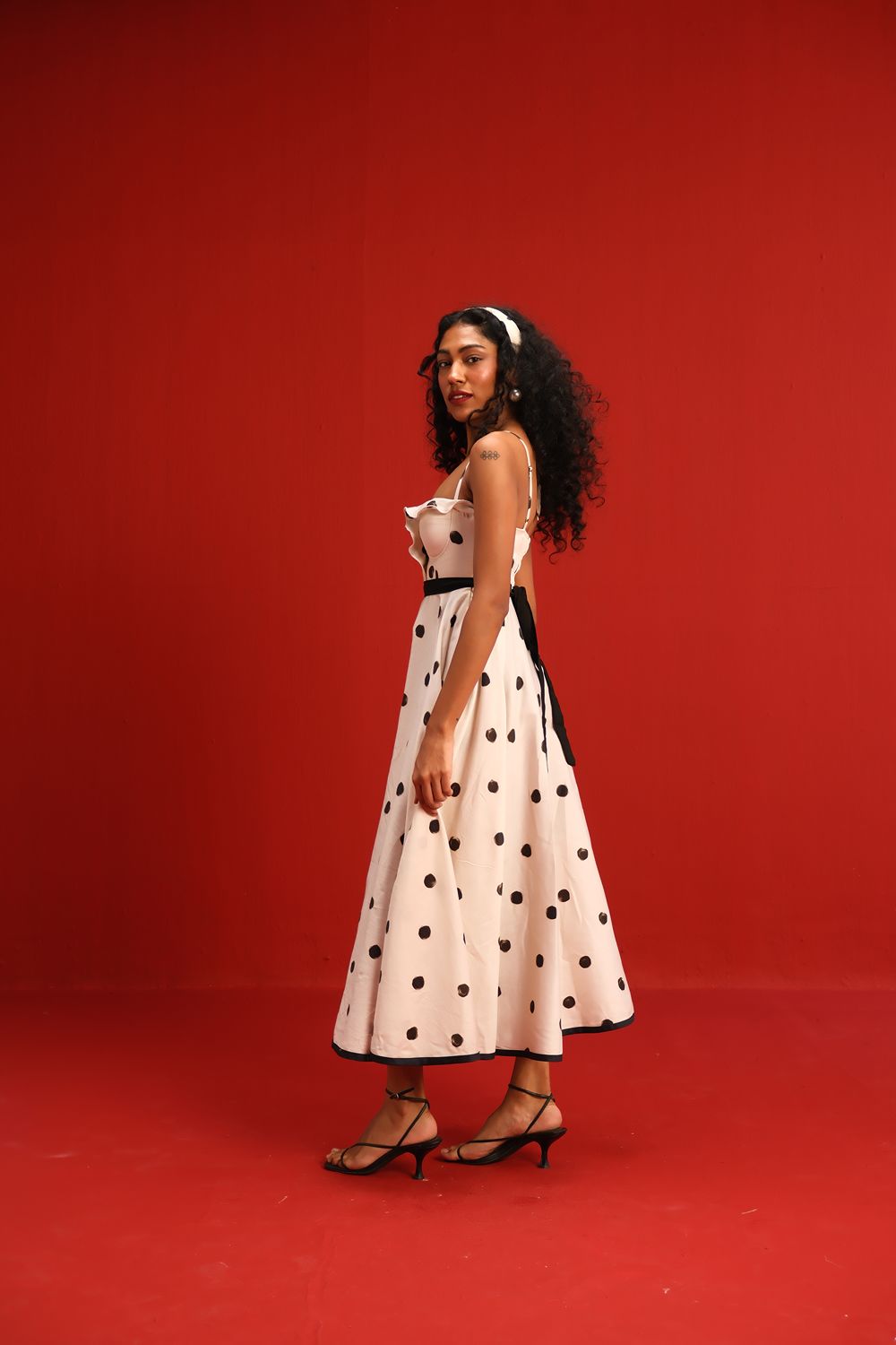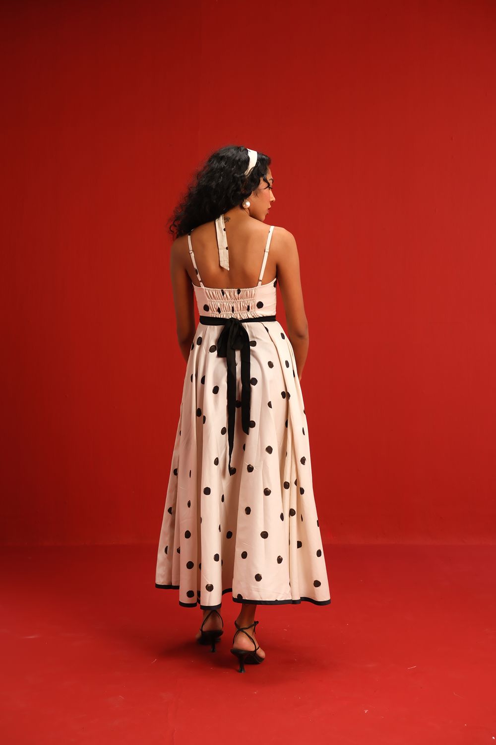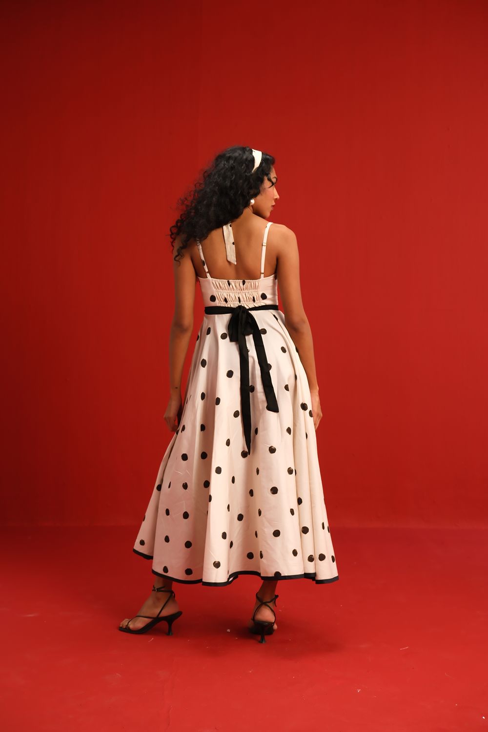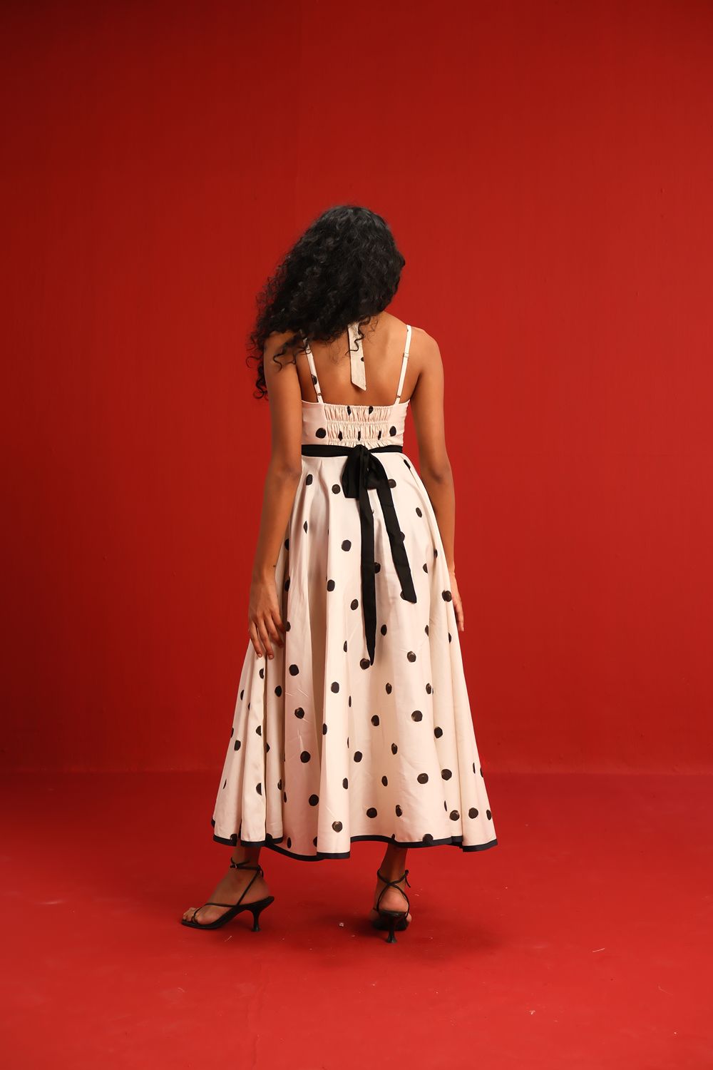 Designed in a soft ivory hue sprinkled with bold black polka dots, this midi dress features a sweetheart neckline with delicate ruffle detail, slim shoulder straps, and a cinched black waistband that flatters the figure. The full circle skirt and black piping at the hemline add graceful movement and structured elegance—perfect for sunlit days or moonlit dancing.