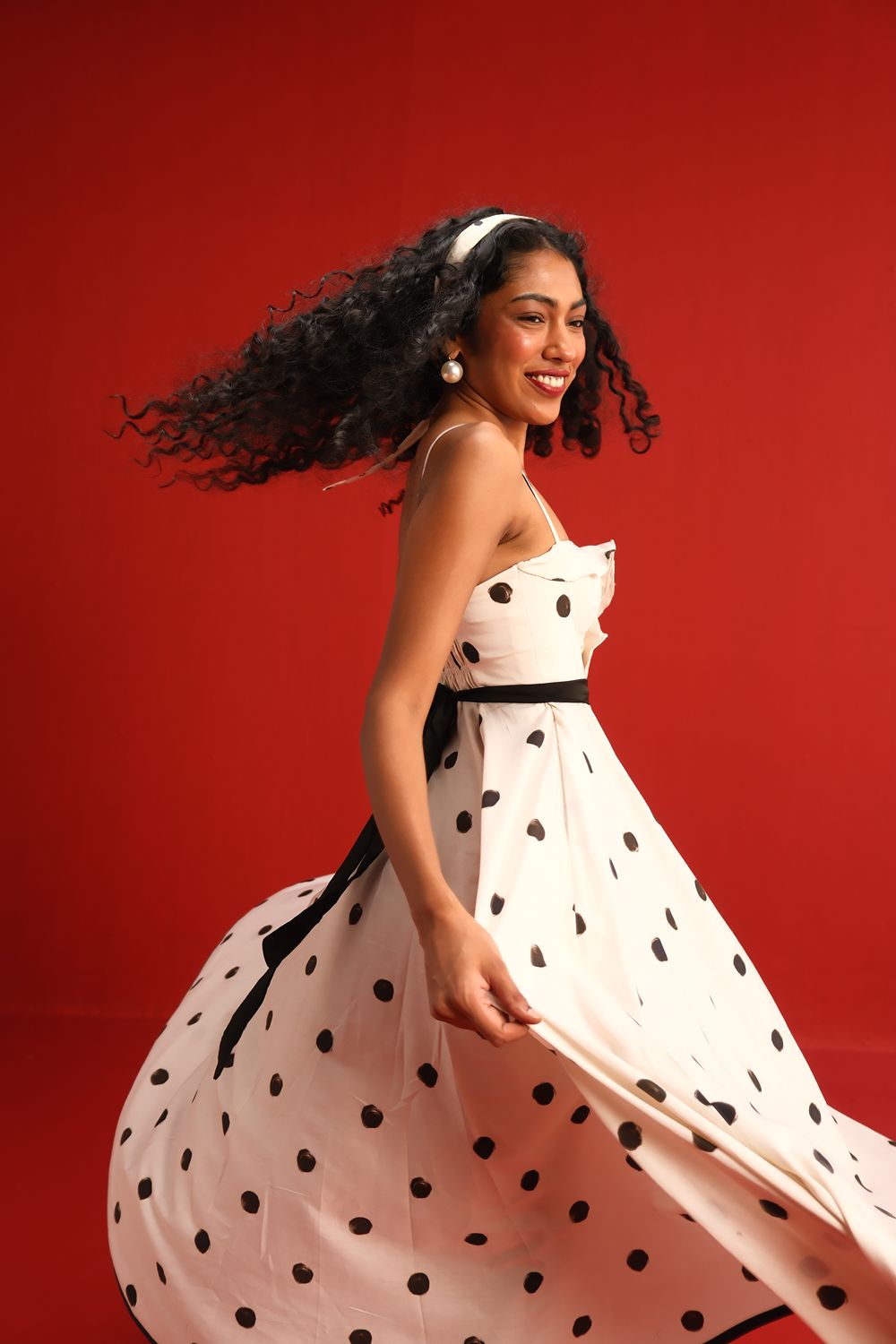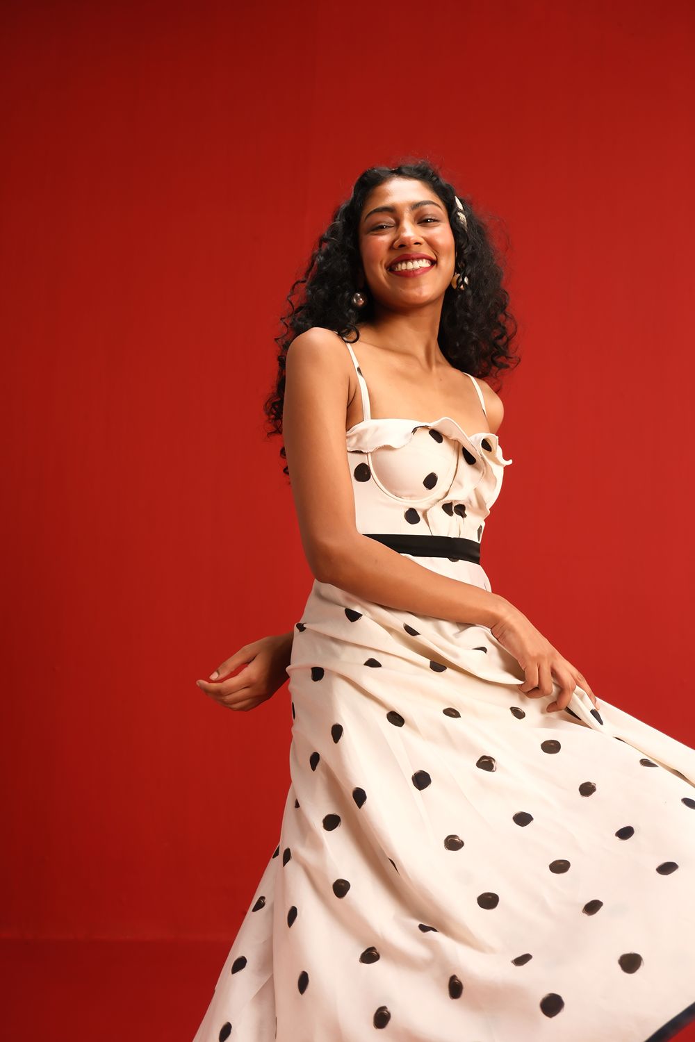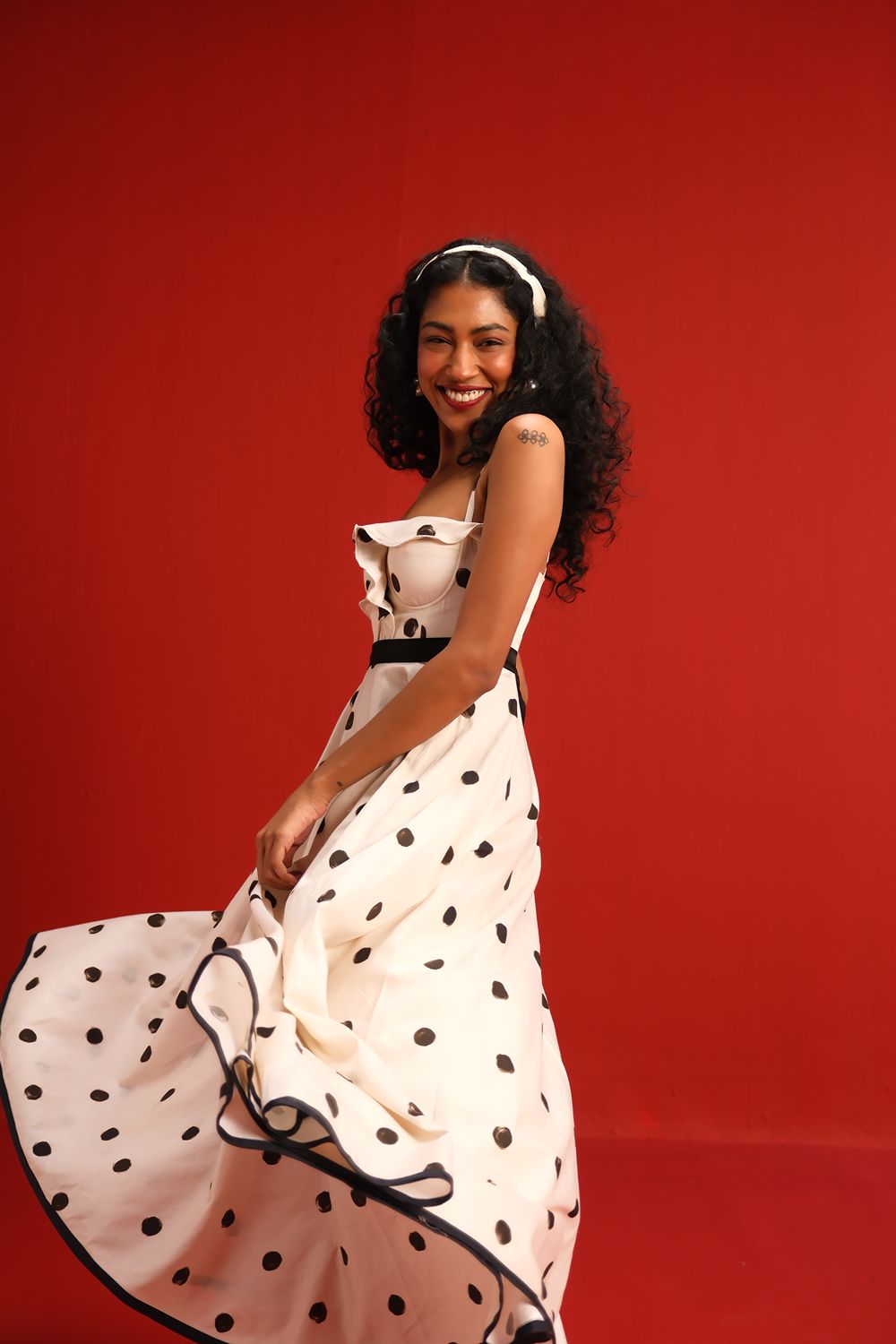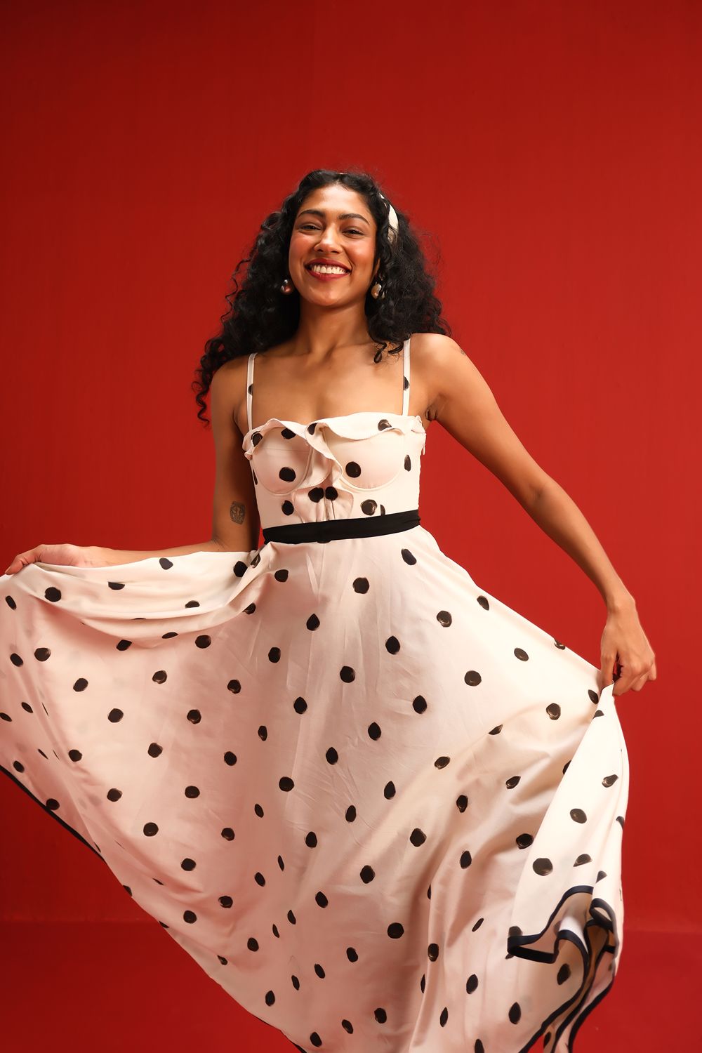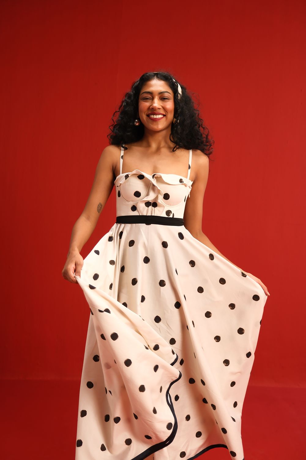 Designed in a soft ivory hue sprinkled with bold black polka dots, this midi dress features a sweetheart neckline with delicate ruffle detail, slim shoulder straps, and a cinched black waistband that flatters the figure. The full circle skirt and black piping at the hemline add graceful movement and structured elegance—perfect for sunlit days or moonlit dancing.